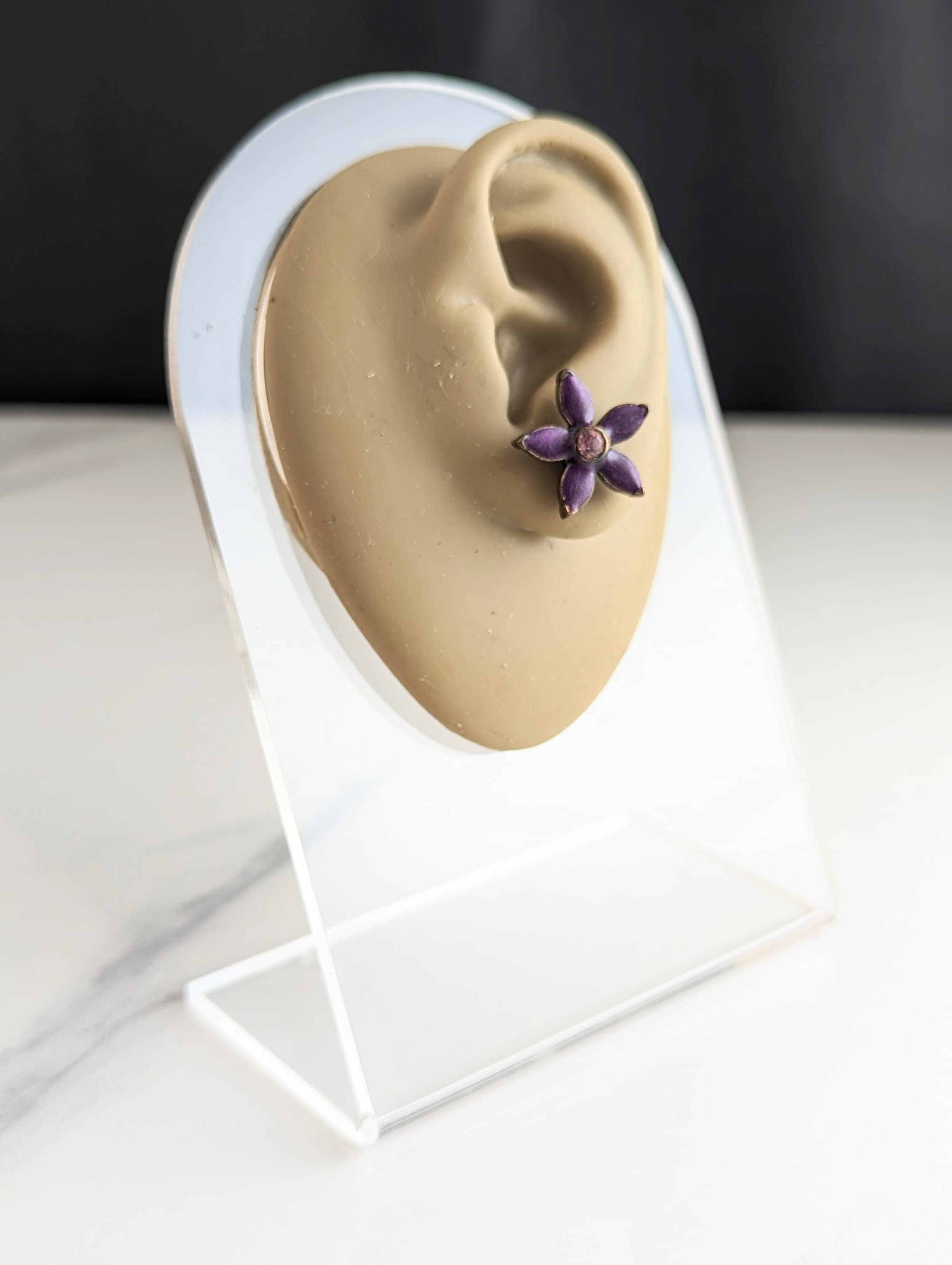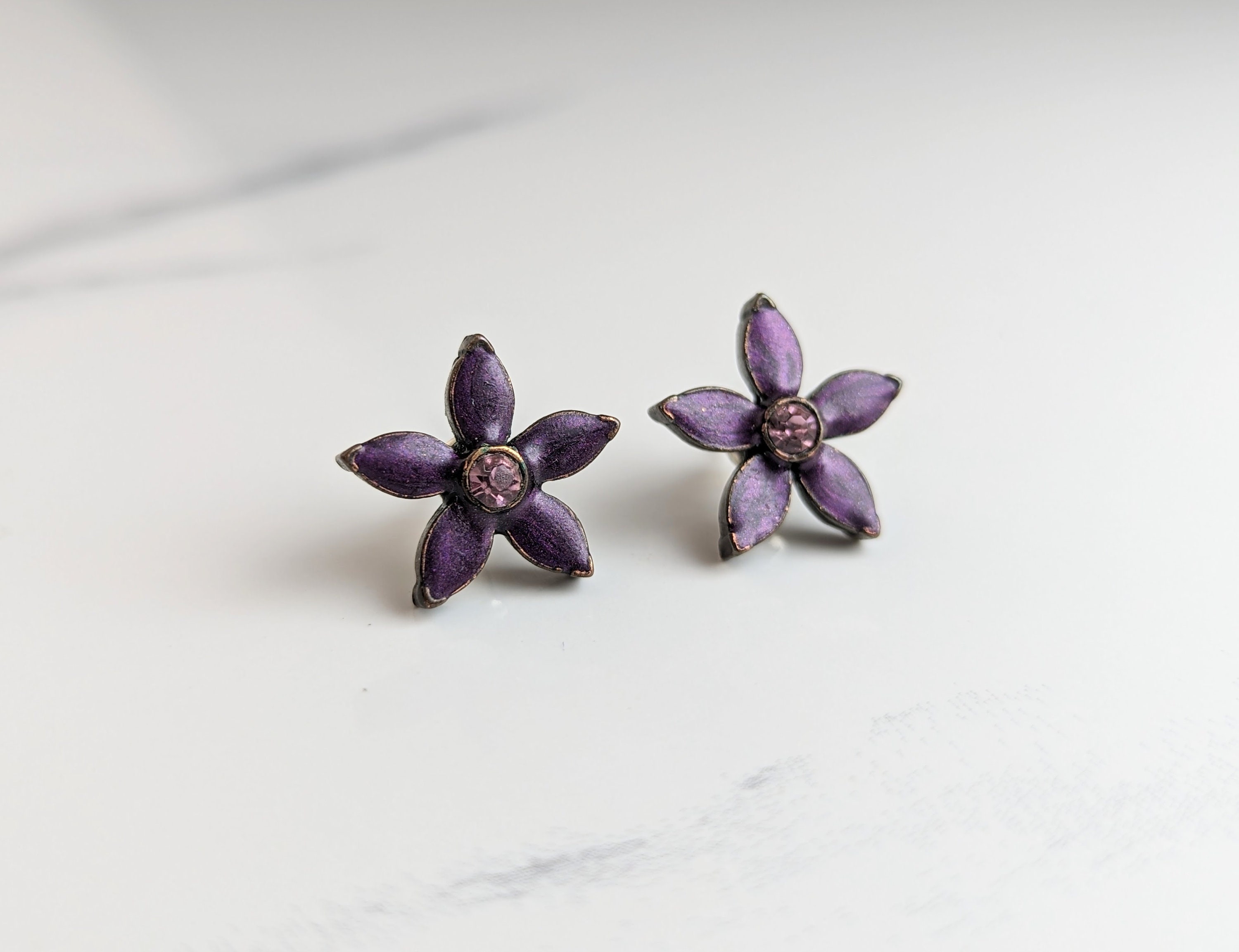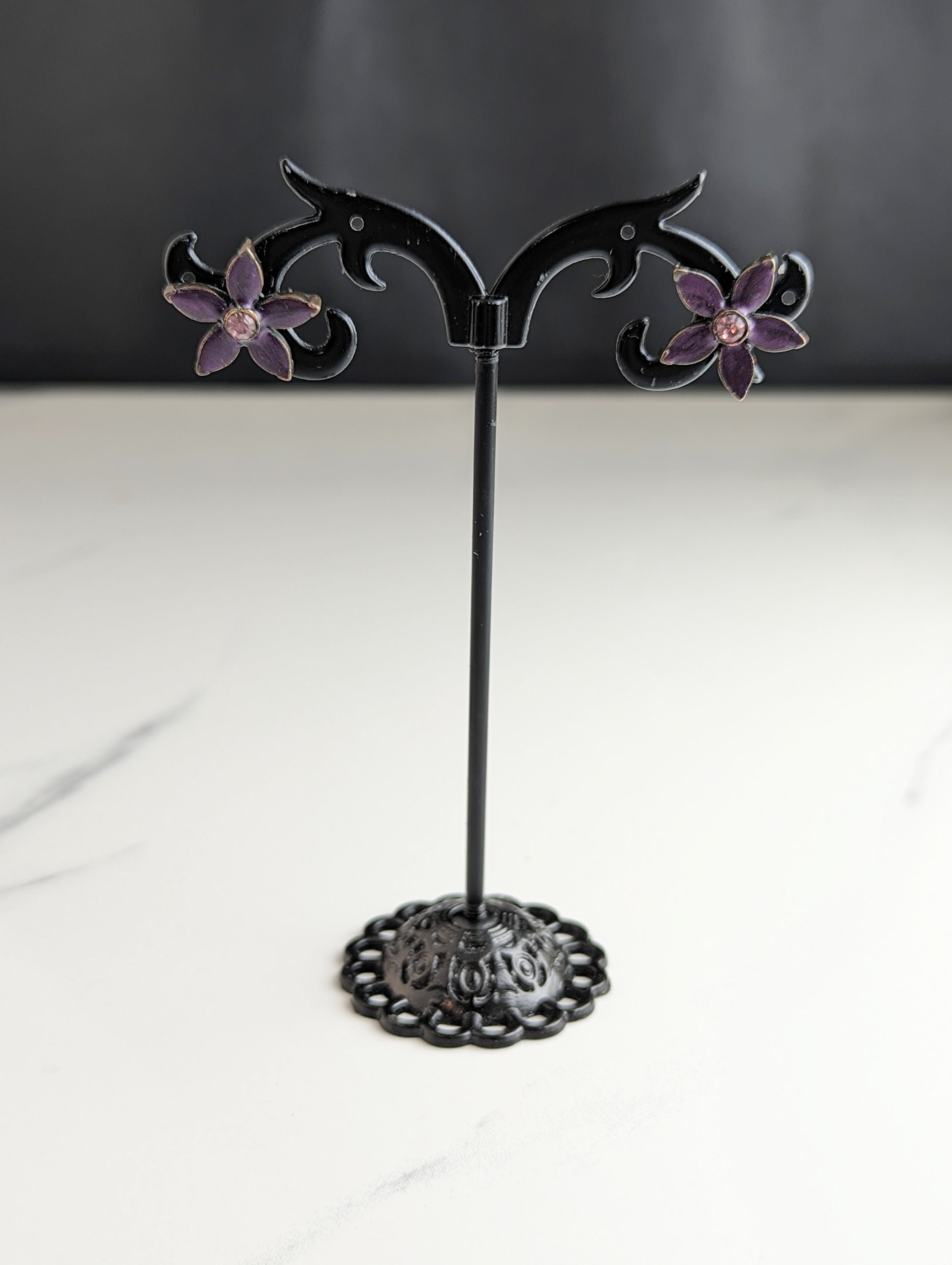 Lovely Vintage Jewellery Faux Pink Sapphire Stud Purple Enamel Flower Earrings