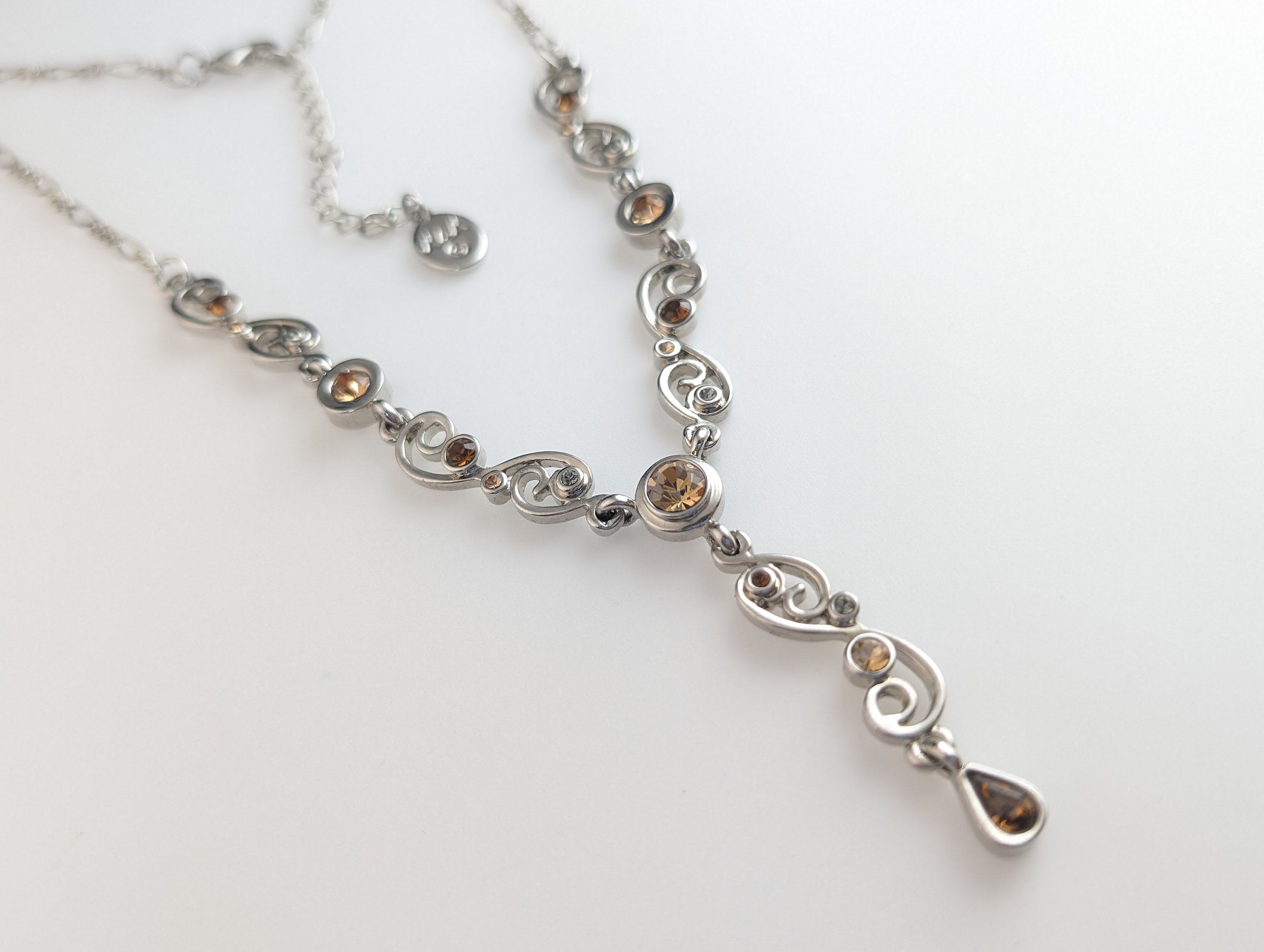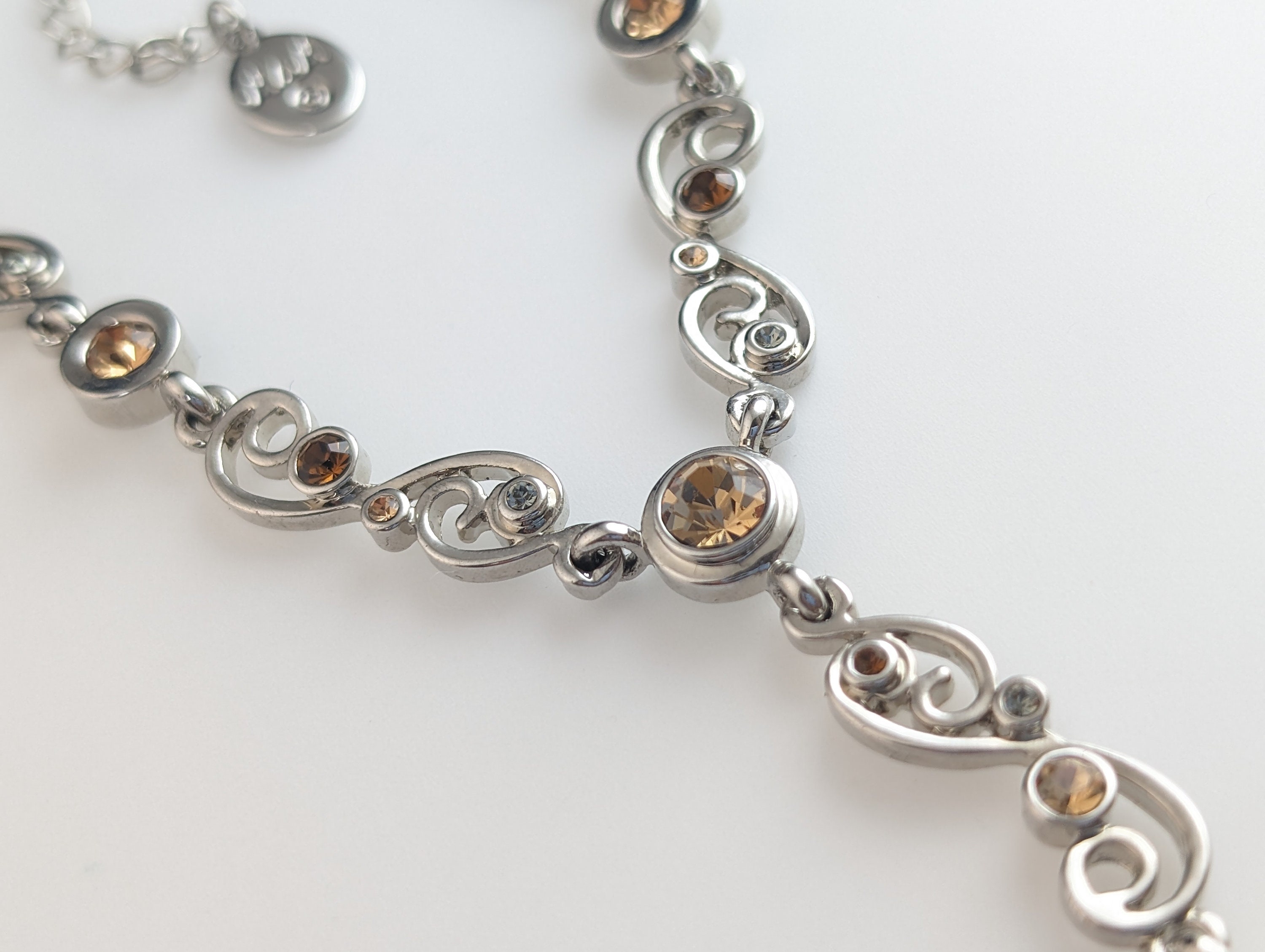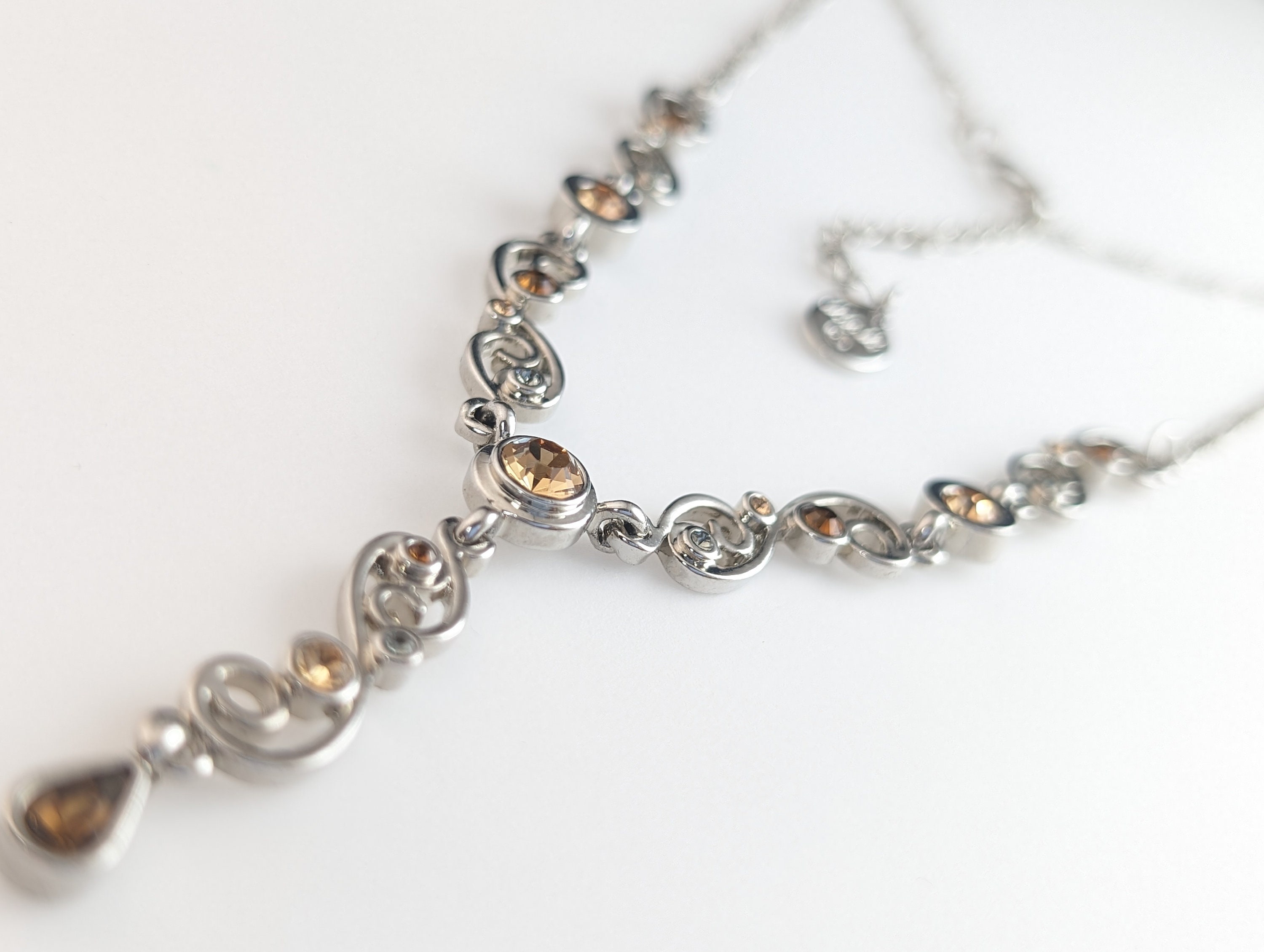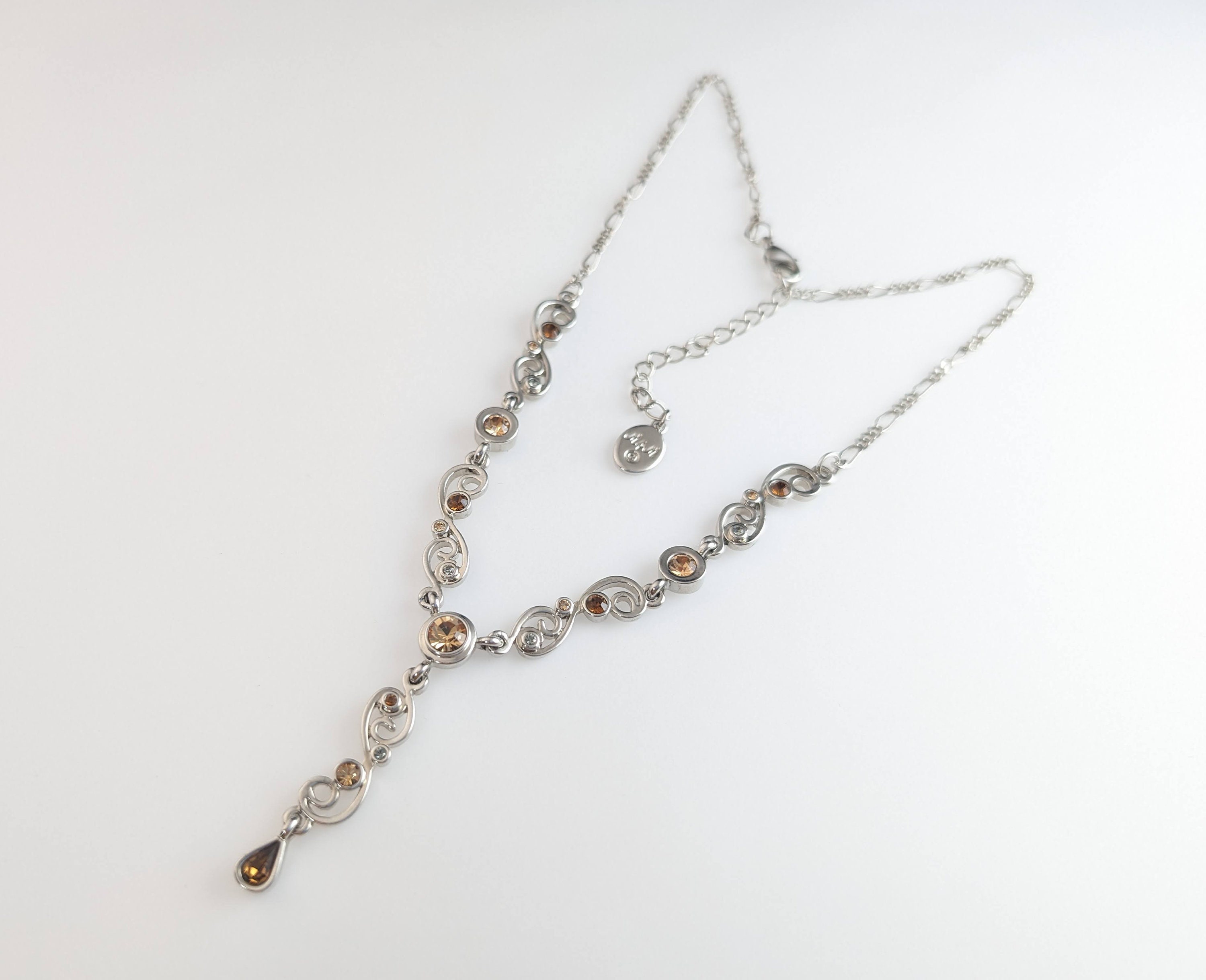Step into a world of elegance with this exquisite silver-tone necklace, a true gem in any collection. Its highly polished surface radiates a luxurious shine, beautifully complementing the sparkling yellow topaz-like rhinestones. The necklace's unique Y-shaped design culminates in a striking teardrop adorned with a yellow topaz stasis, a testament to its exquisite craftsmanship. The front is embellished with intricate curls, each meticulously inlaid with shimmering yellow rhinestones, mimicking the radiance of the finest crystals. Measuring 18 inches with an additional 2-inch extension, this piece offers versatility and a perfect fit. Notably signed twice M4M for authenticity, once on the iron tag and again on the reverse of the teardrop, this necklace stands as a symbol of elegance and style. Add a touch of glamour to your attire with this stunning necklace, a perfect blend of sophistication and sparkle.