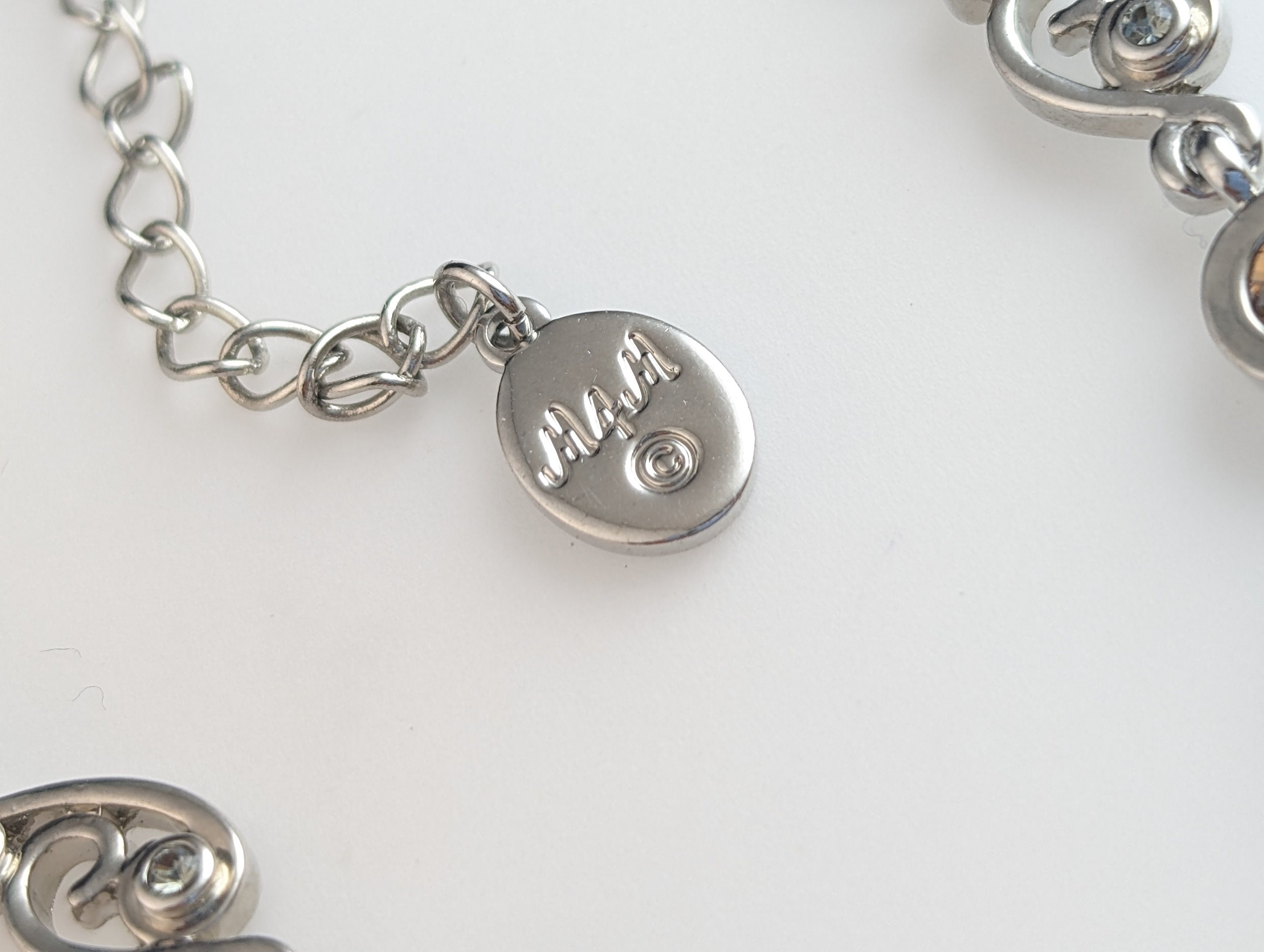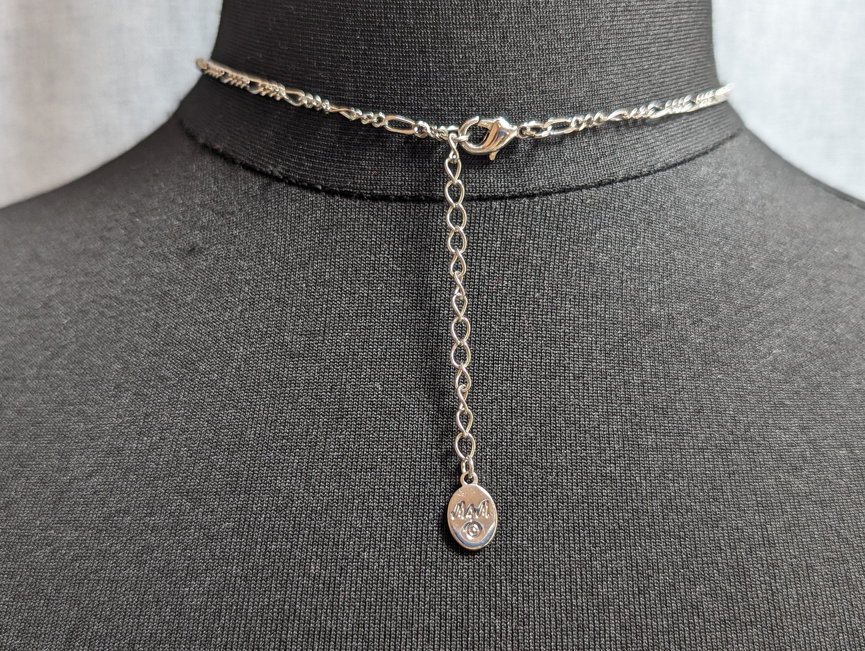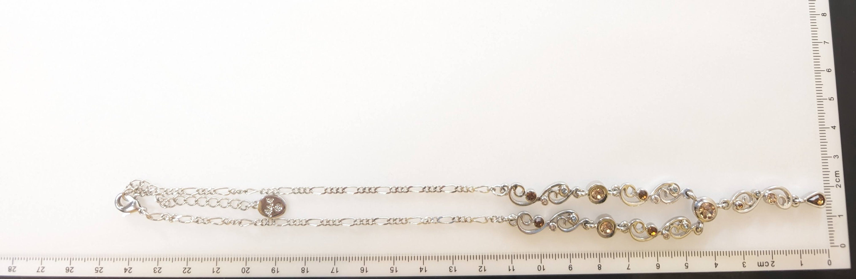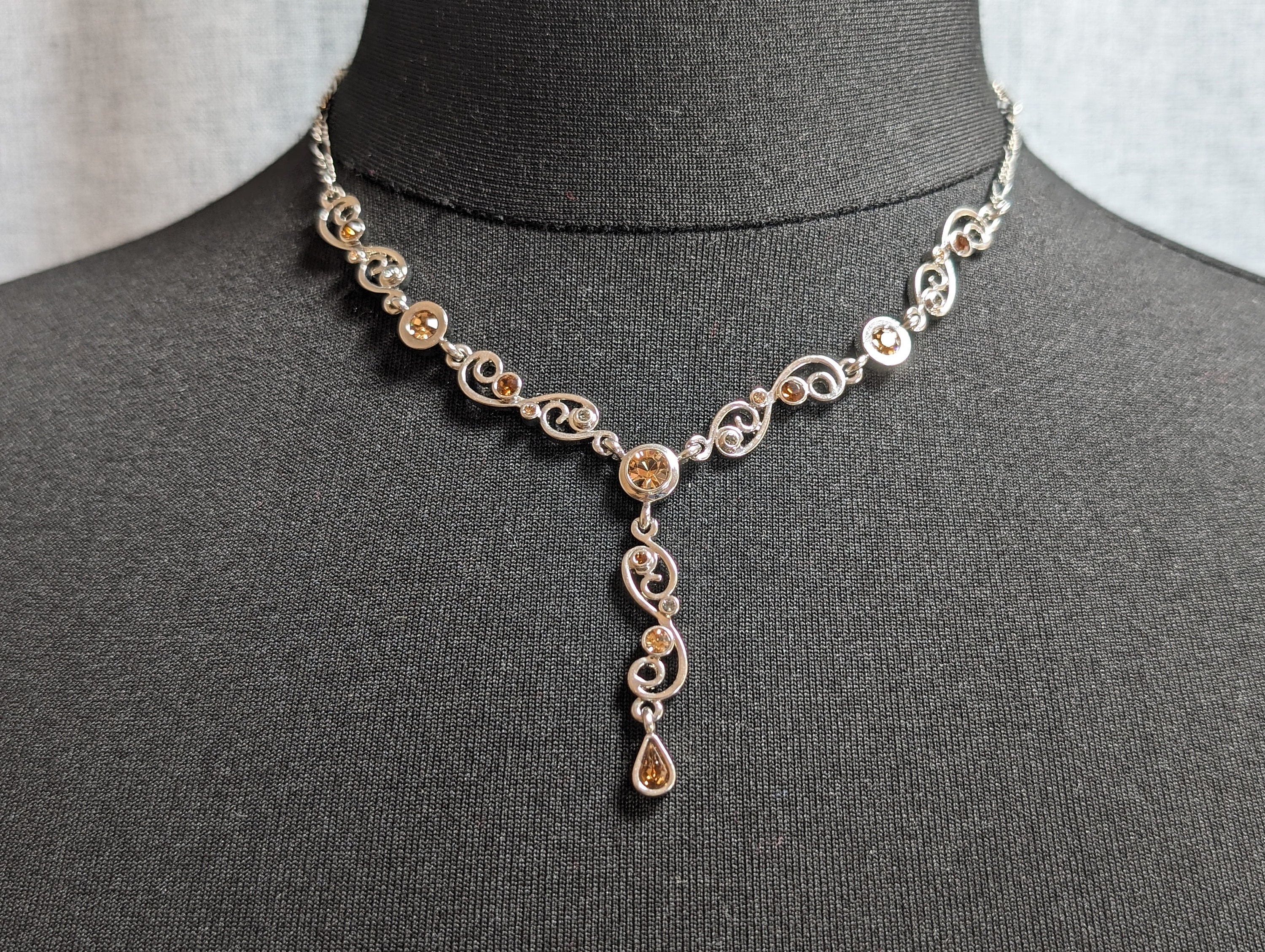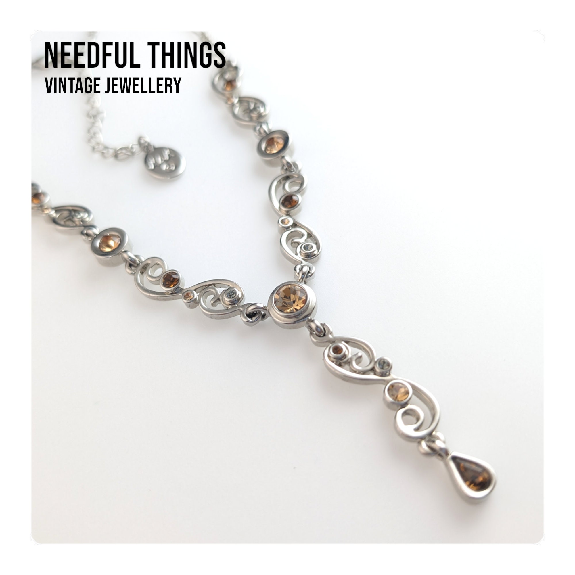 Step into a world of elegance with this exquisite silver-tone necklace, a true gem in any collection. Its highly polished surface radiates a luxurious shine, beautifully complementing the sparkling yellow topaz-like rhinestones. The necklace's unique Y-shaped design culminates in a striking teardrop adorned with a yellow topaz stasis, a testament to its exquisite craftsmanship. The front is embellished with intricate curls, each meticulously inlaid with shimmering yellow rhinestones, mimicking the radiance of the finest crystals. Measuring 18 inches with an additional 2-inch extension, this piece offers versatility and a perfect fit. Notably signed twice M4M for authenticity, once on the iron tag and again on the reverse of the teardrop, this necklace stands as a symbol of elegance and style. Add a touch of glamour to your attire with this stunning necklace, a perfect blend of sophistication and sparkle.