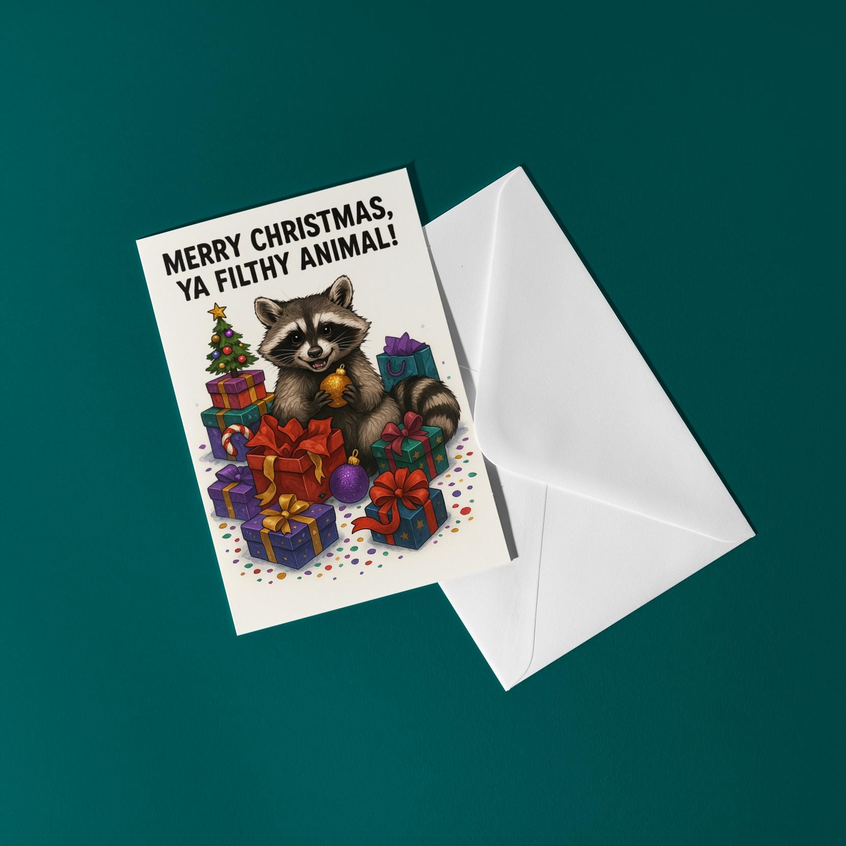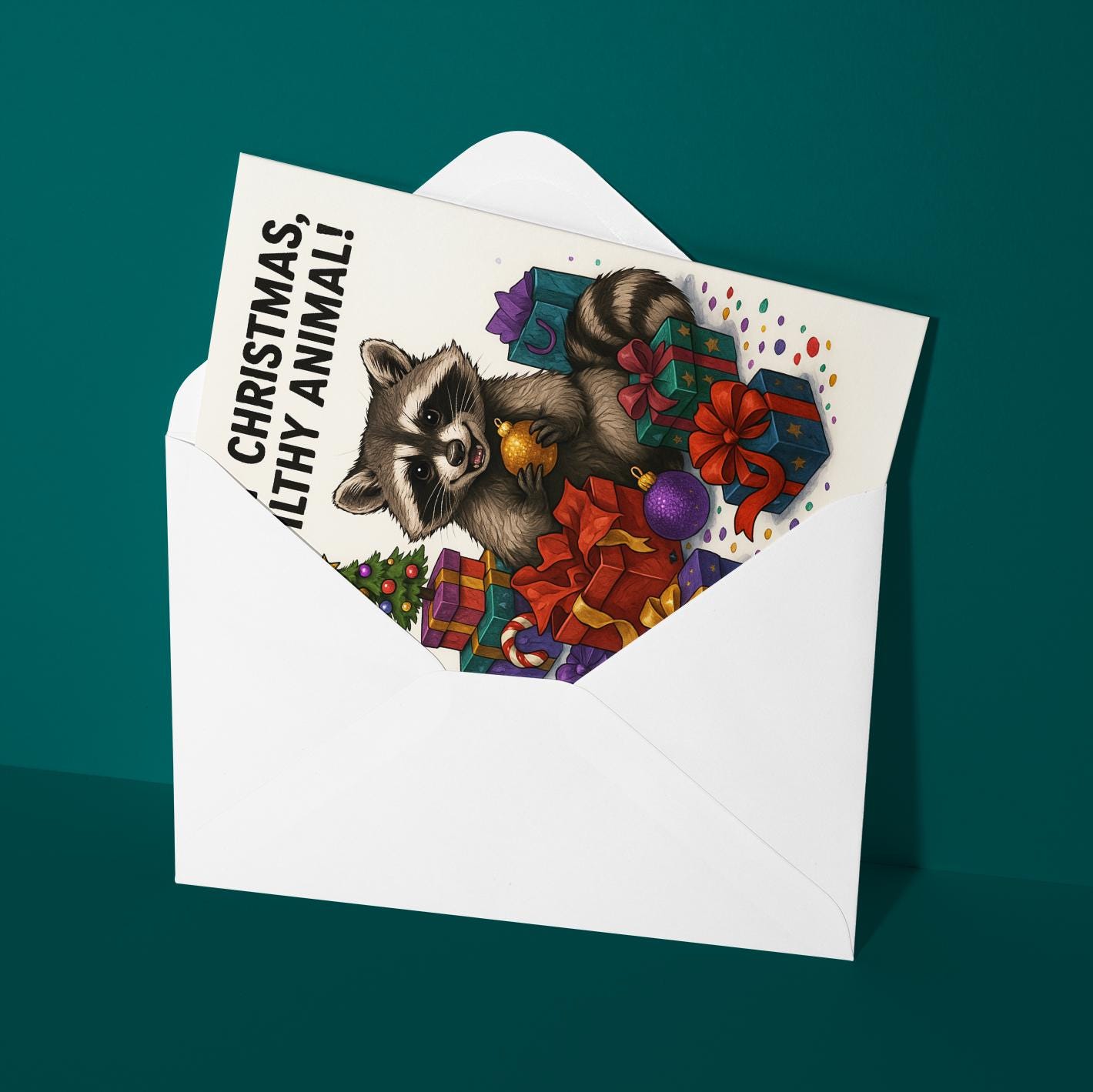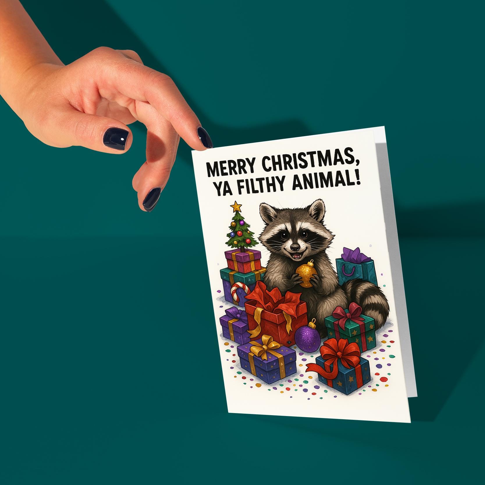 BLANK INTERIOR FOR A PERSONAL TOUCH: Festive Gift Bandit Raccoon - Merry Christmas, Ya Filthy Animal! Card and other whimsical designs feature a blank interior, giving you ample space to write a personal message from the heart. Perfect for any occasion, each card comes with a matching white envelope, making it easy to send your unique sentiments to loved ones.