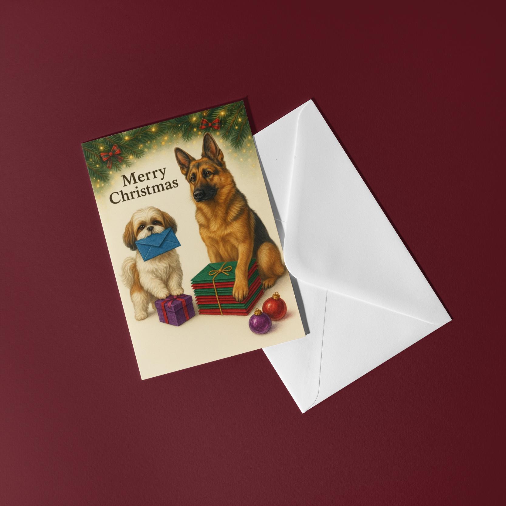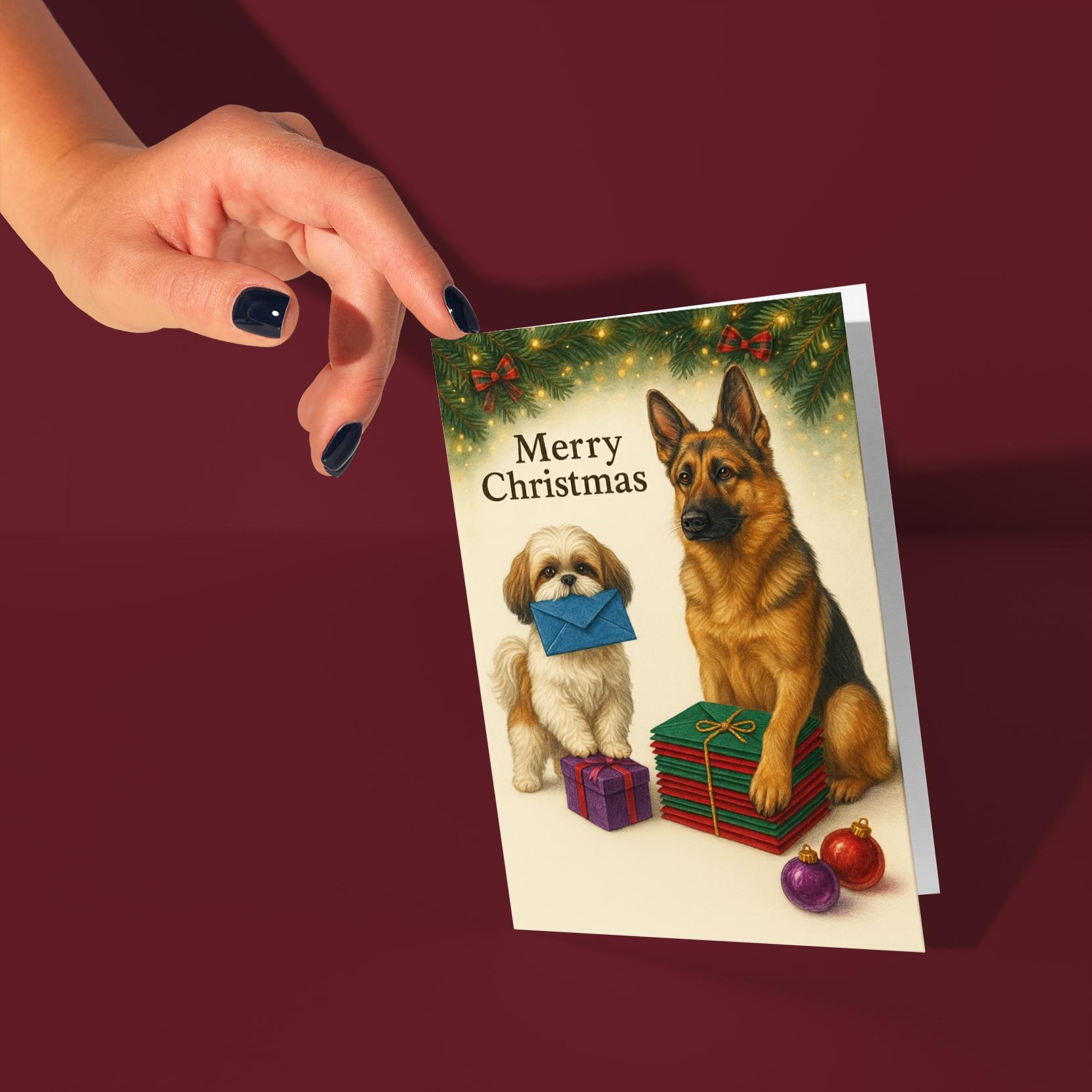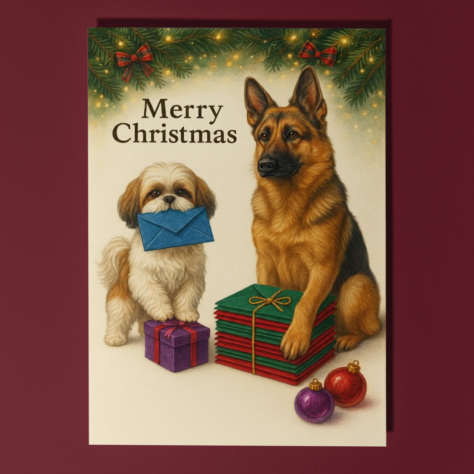 BLANK INTERIOR FOR A PERSONAL TOUCH: Part of the - Dog Breeds Collection - Santa’s Helpers Collection - German Shepherd and Shih Tzu Dogs Duo - Santas Best Pup Helpers - Merry Christmas! Card and other whimsical designs feature a blank interior, giving you ample space to write a personal message from the heart. Perfect for any occasion, each card comes with a matching white envelope, making it easy to send your unique sentiments to loved ones.