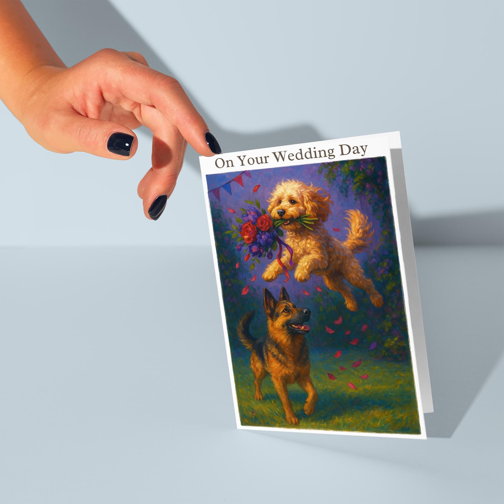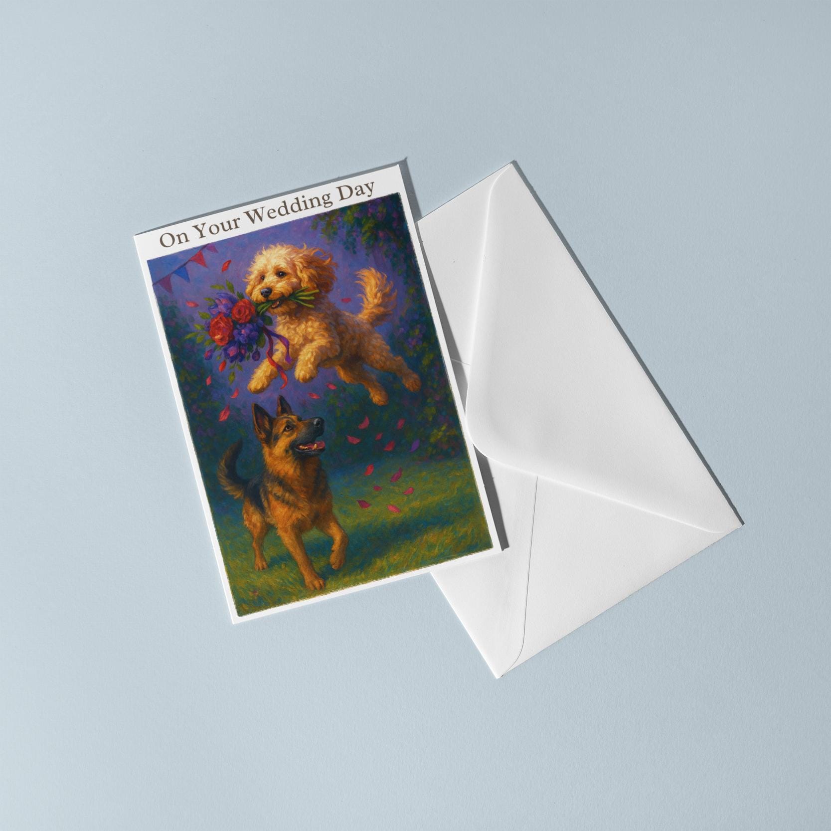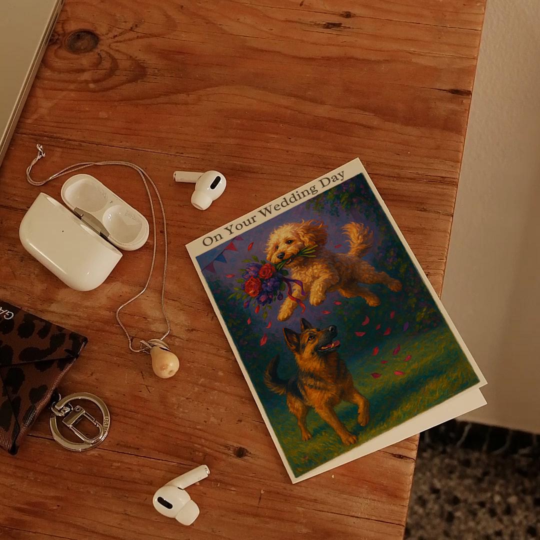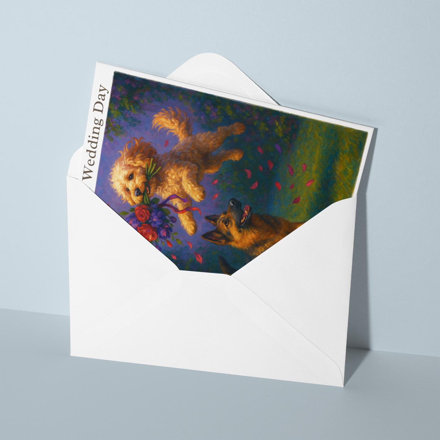 BLANK INTERIOR FOR A PERSONAL TOUCH: Our Dogs breeds collection - Wedding Edition - Cockapoo and German Shepherd Dog Duo - Bouquet Chase - On your wedding day Card and other whimsical designs feature a blank interior, giving you ample space to write a personal message from the heart. Perfect for any occasion, each card comes with a matching white envelope, making it easy to send your unique sentiments to loved ones.