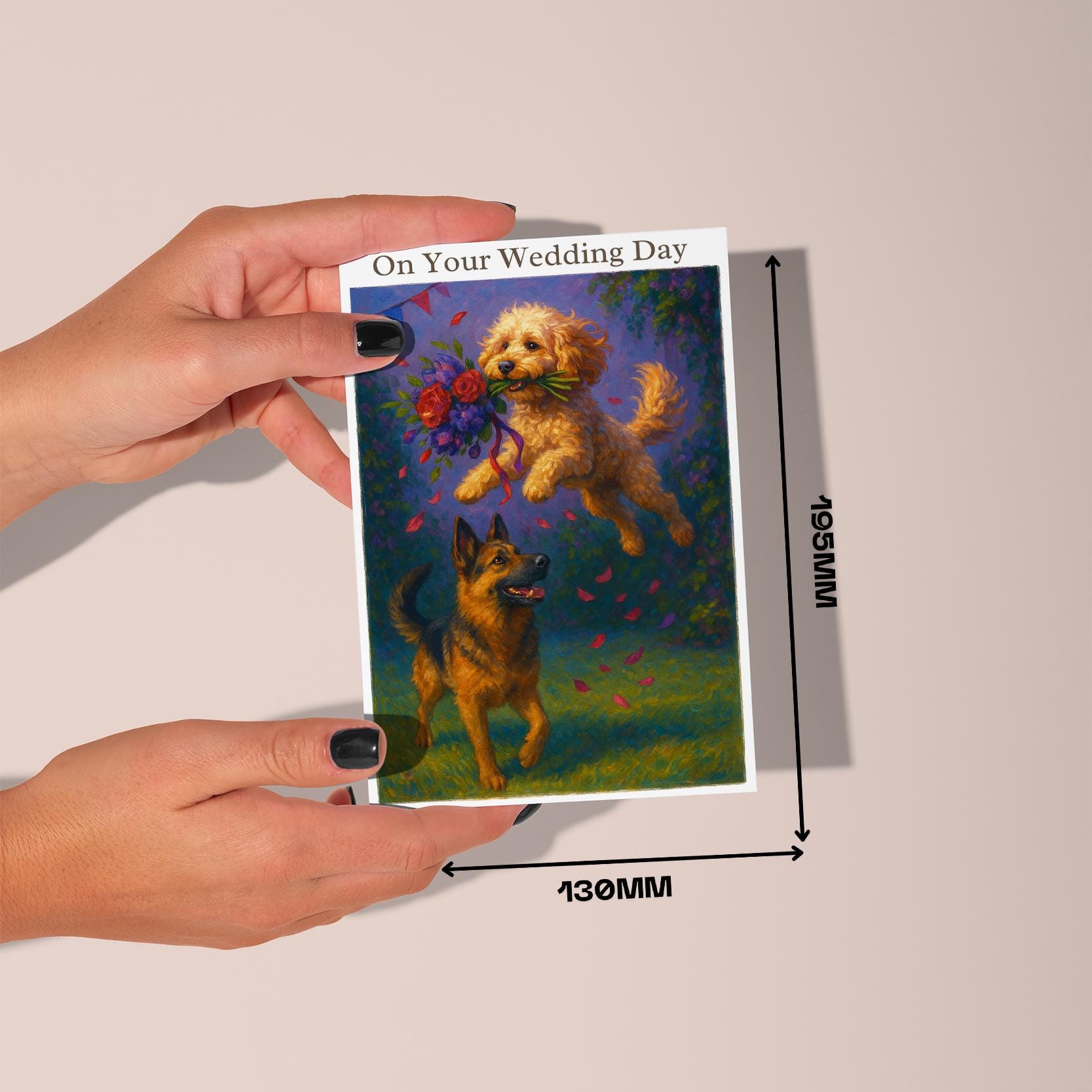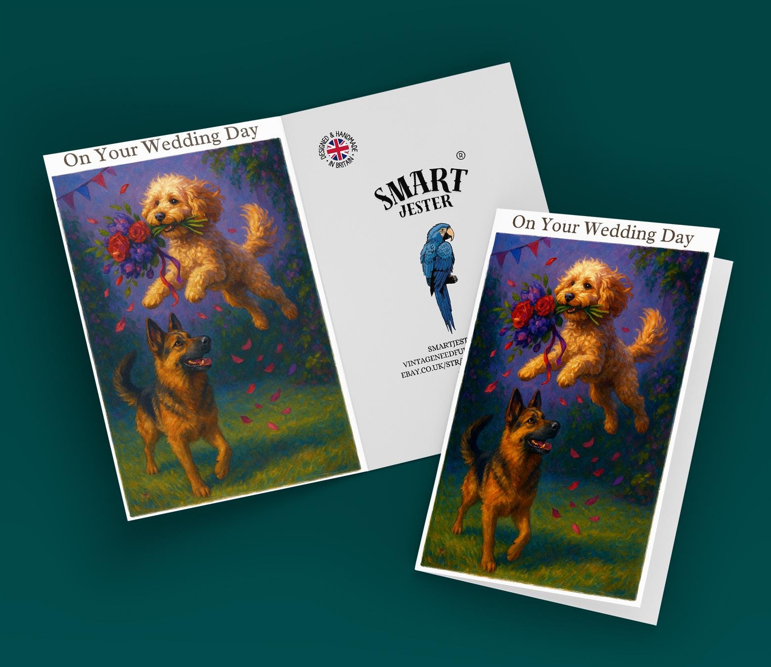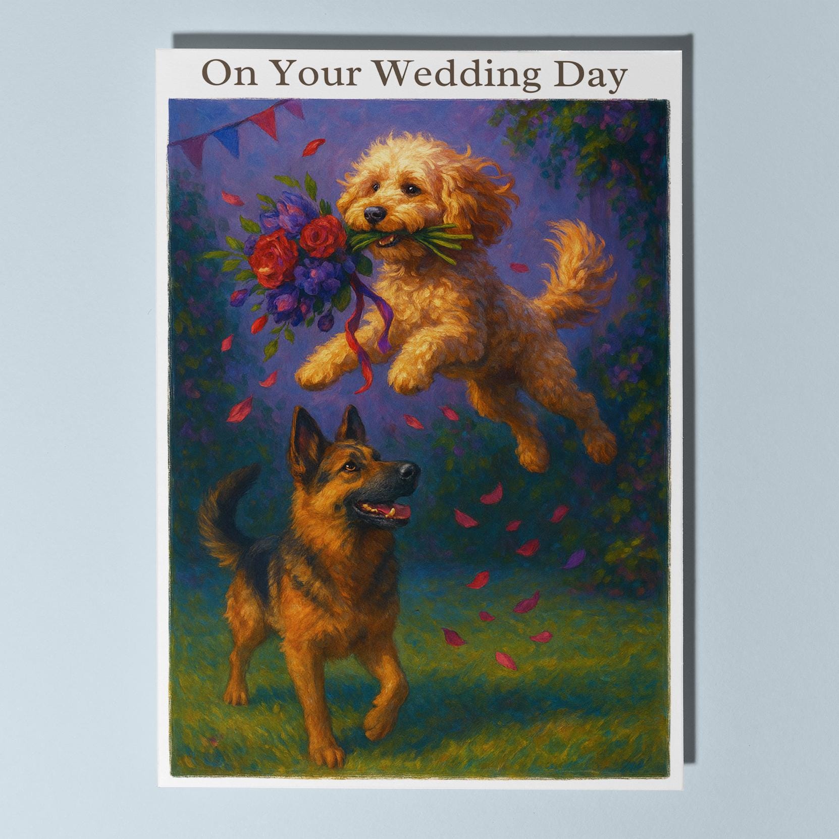 BLANK INTERIOR FOR A PERSONAL TOUCH: Our Dogs breeds collection - Wedding Edition - Cockapoo and German Shepherd Dog Duo - Bouquet Chase - On your wedding day Card and other whimsical designs feature a blank interior, giving you ample space to write a personal message from the heart. Perfect for any occasion, each card comes with a matching white envelope, making it easy to send your unique sentiments to loved ones.