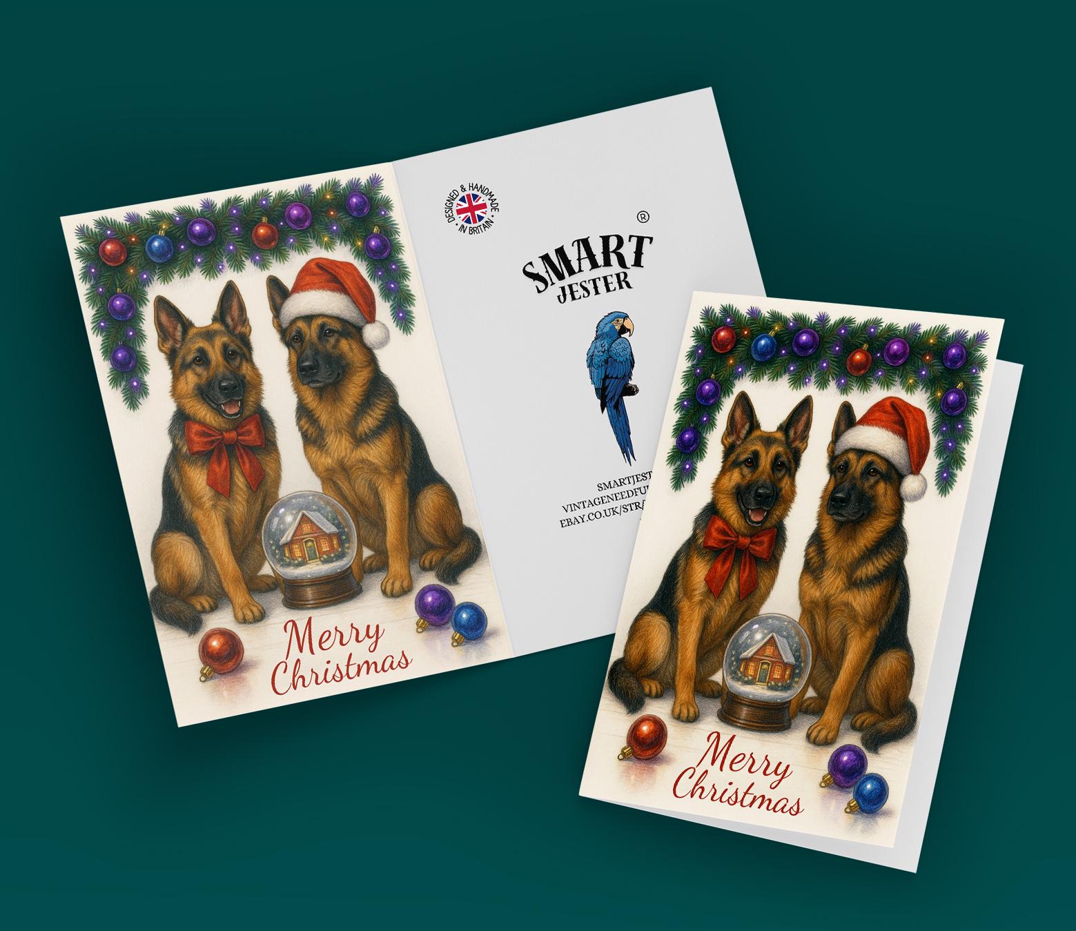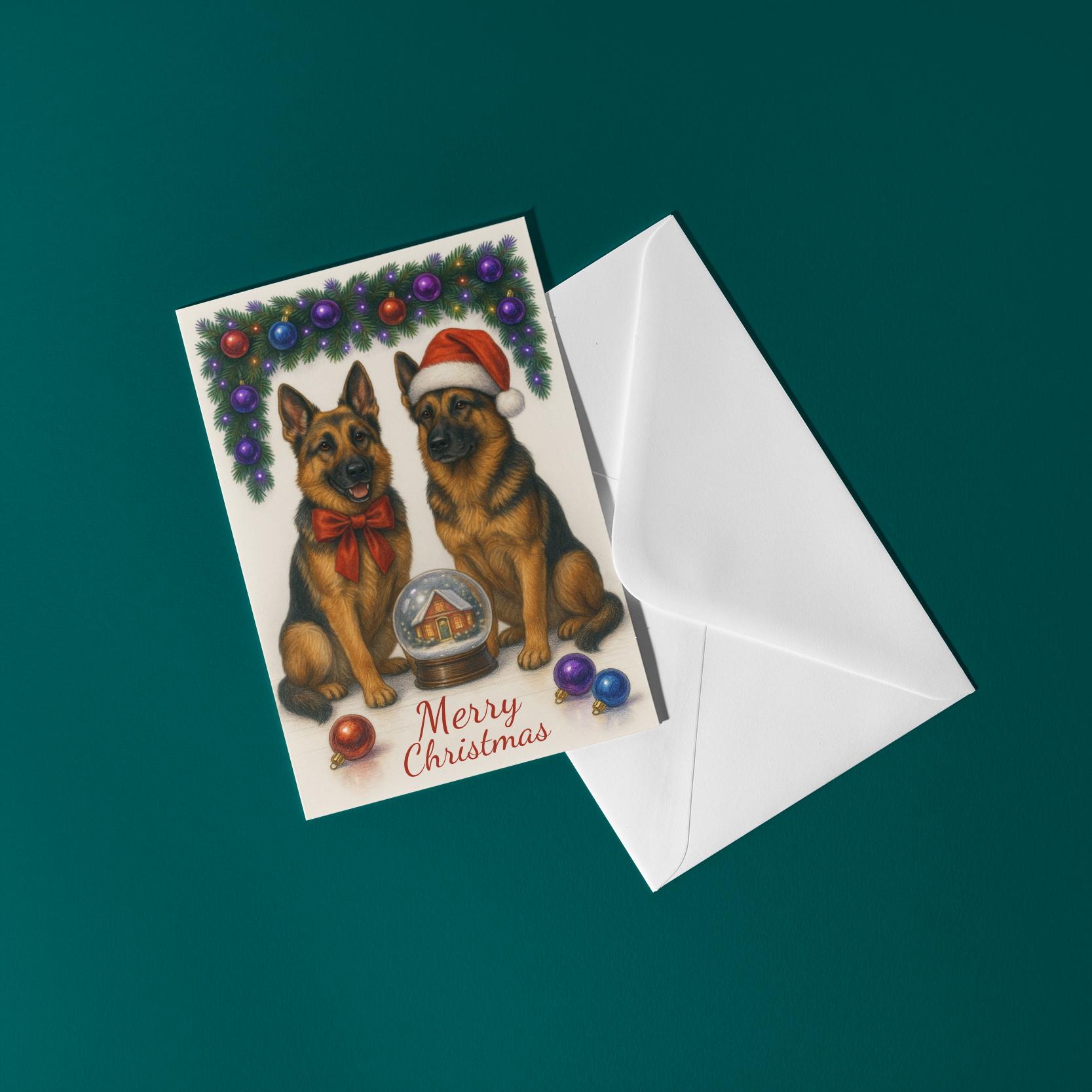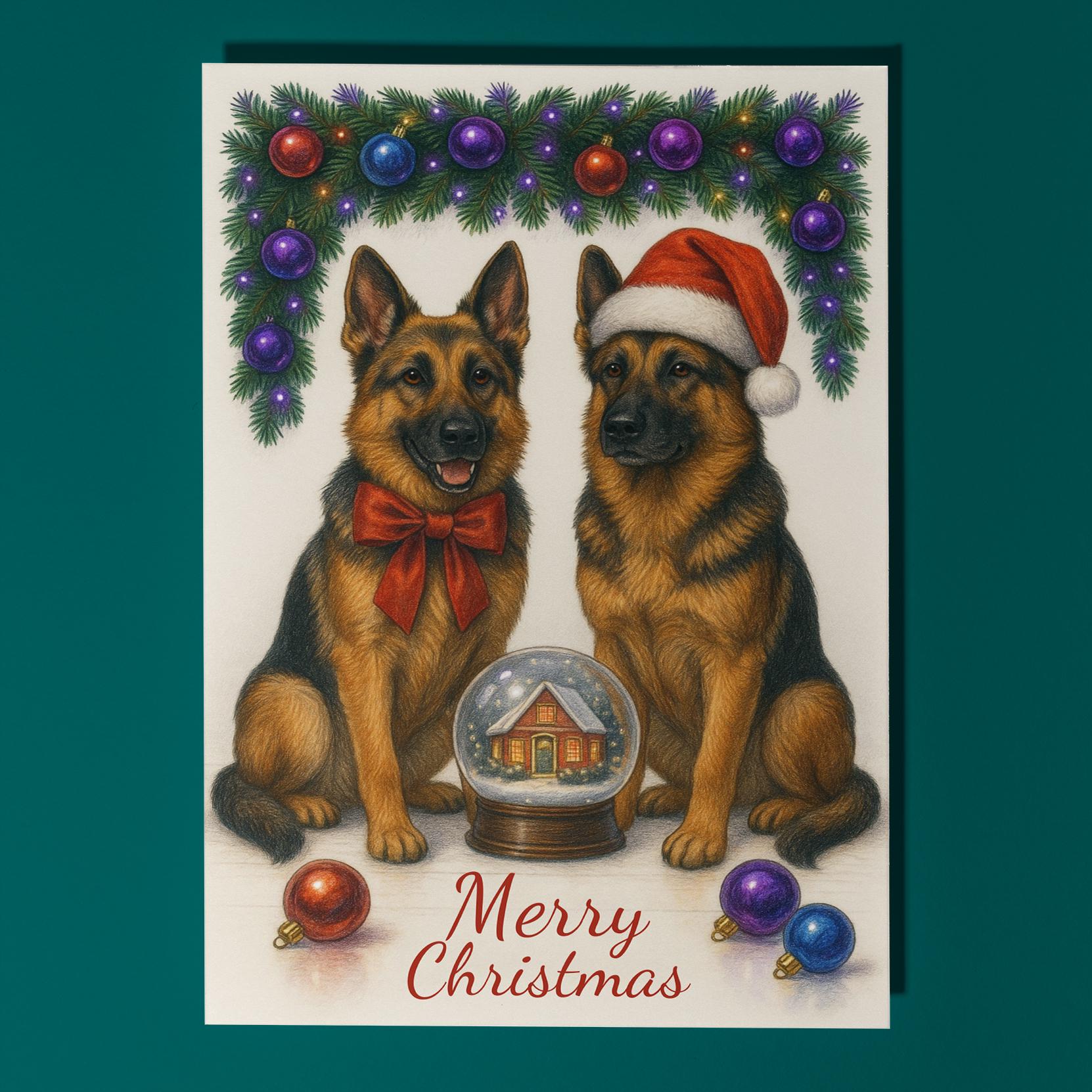 BLANK INTERIOR FOR A PERSONAL TOUCH: Part of the - Dog Breeds Collection - Santa’s Helpers Collection - German Shepherd Dogs Duo in Santa Hat - Cozy Nose and Snow Globe - Merry Christmas! Card and other whimsical designs feature a blank interior, giving you ample space to write a personal message from the heart. Perfect for any occasion, each card comes with a matching white envelope, making it easy to send your unique sentiments to loved ones.
