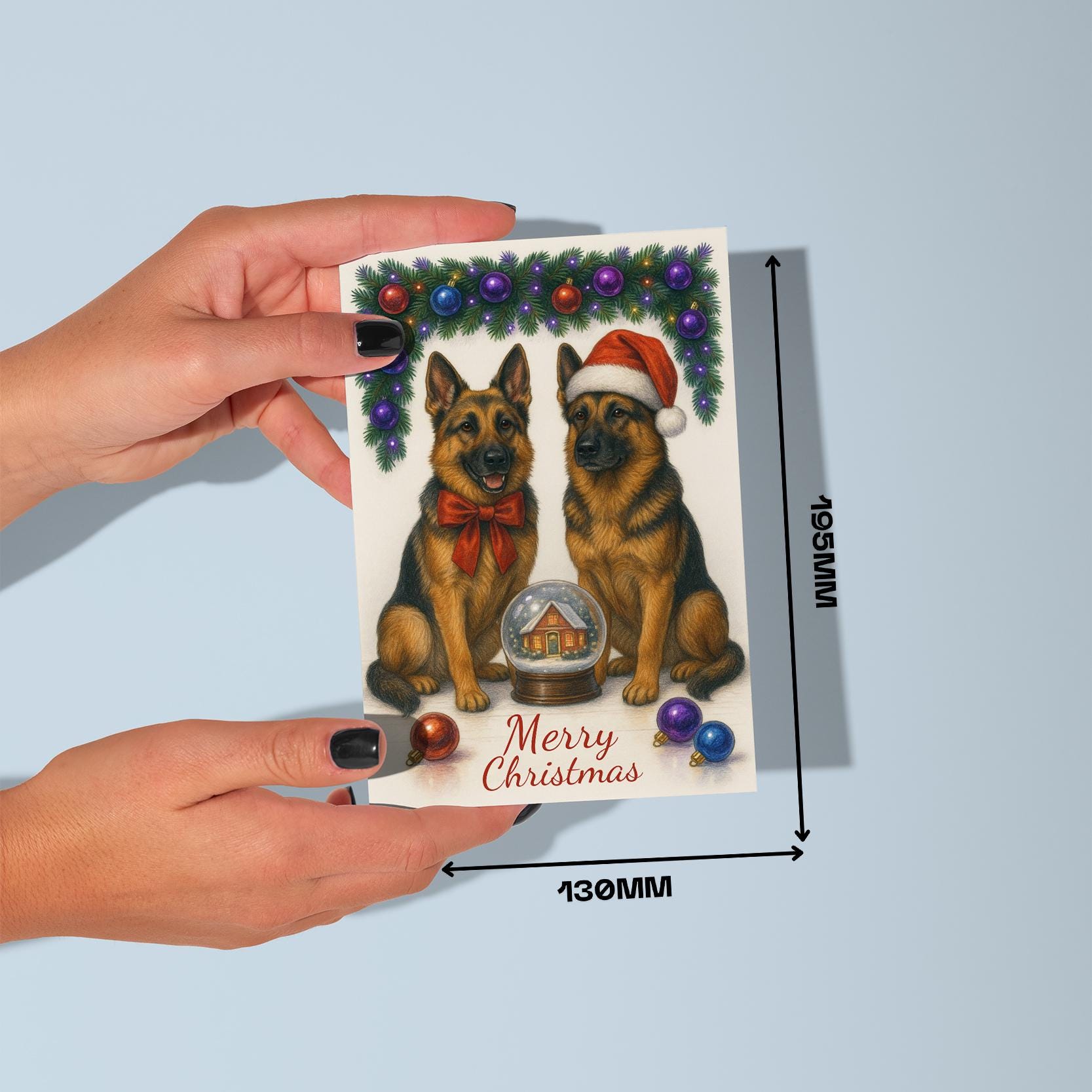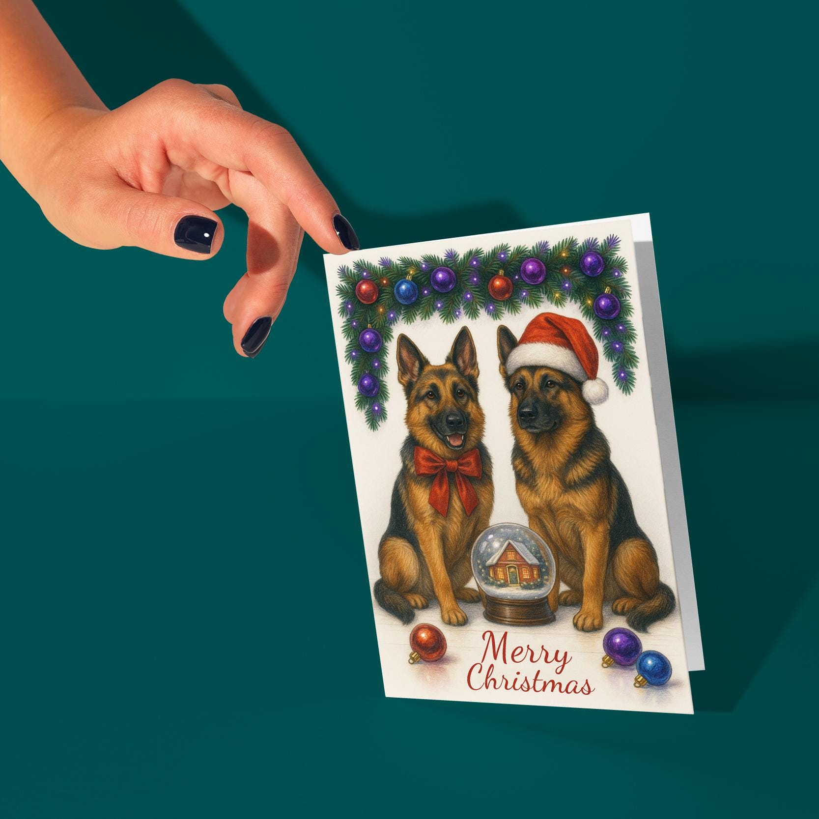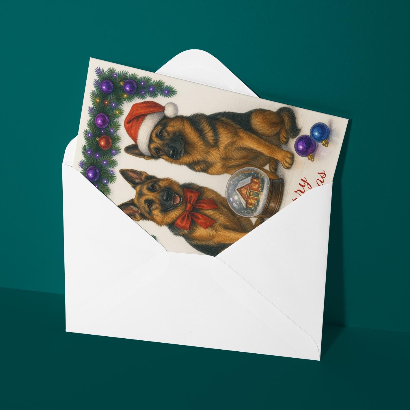 BLANK INTERIOR FOR A PERSONAL TOUCH: Part of the - Dog Breeds Collection - Santa’s Helpers Collection - German Shepherd Dogs Duo in Santa Hat - Cozy Nose and Snow Globe - Merry Christmas! Card and other whimsical designs feature a blank interior, giving you ample space to write a personal message from the heart. Perfect for any occasion, each card comes with a matching white envelope, making it easy to send your unique sentiments to loved ones.