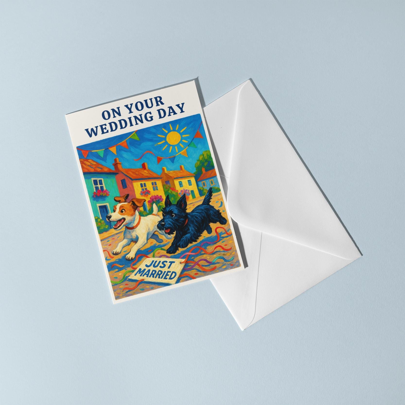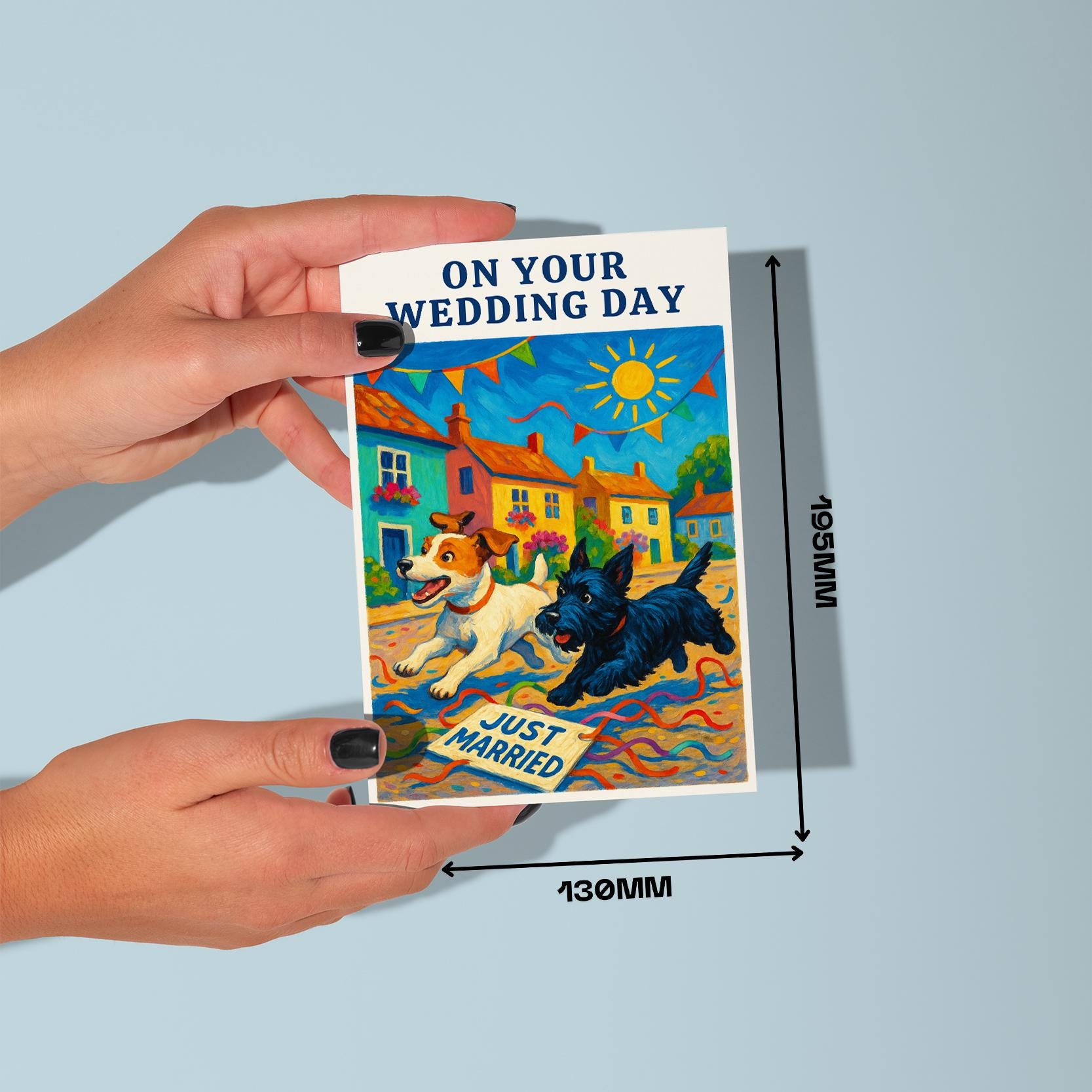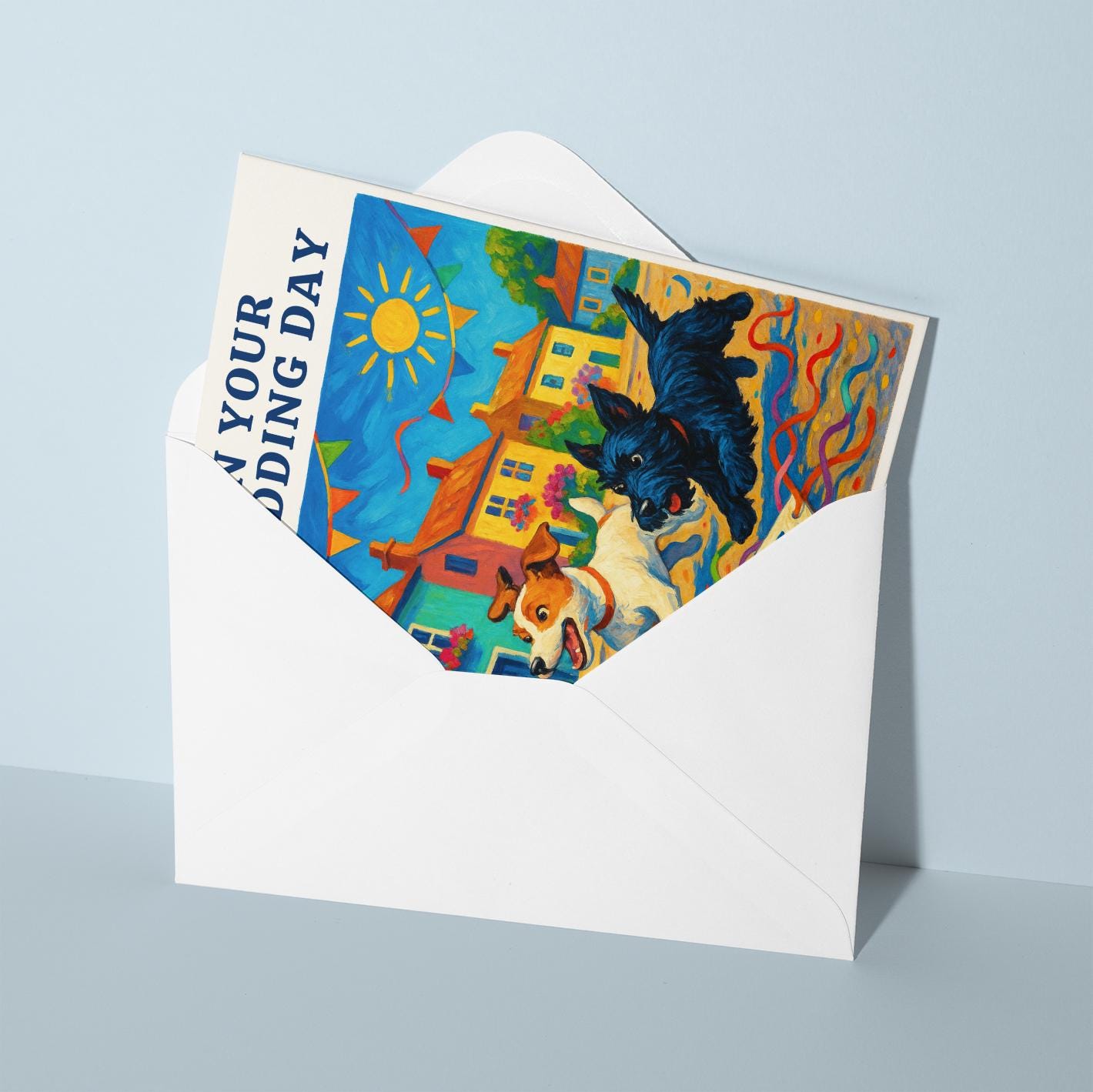 BLANK INTERIOR FOR A PERSONAL TOUCH: Our Dogs breeds collection - Wedding Edition - Jack Russell & Scottish Terrier - Just Married - On Your Wedding Day Card and other whimsical designs feature a blank interior, giving you ample space to write a personal message from the heart. Perfect for any occasion, each card comes with a matching white envelope, making it easy to send your unique sentiments to loved ones.
