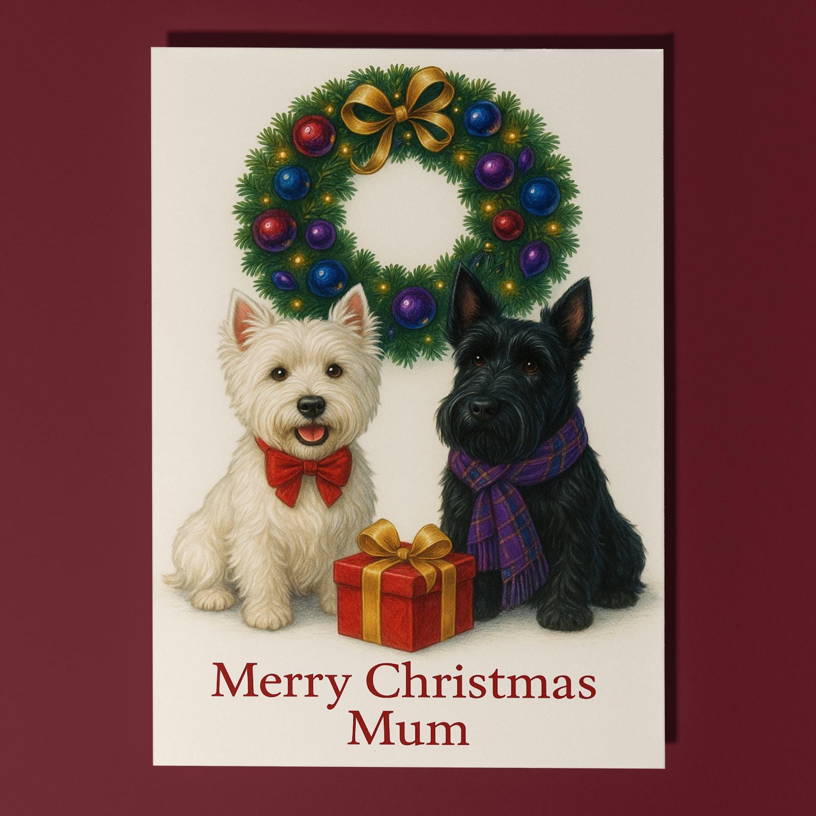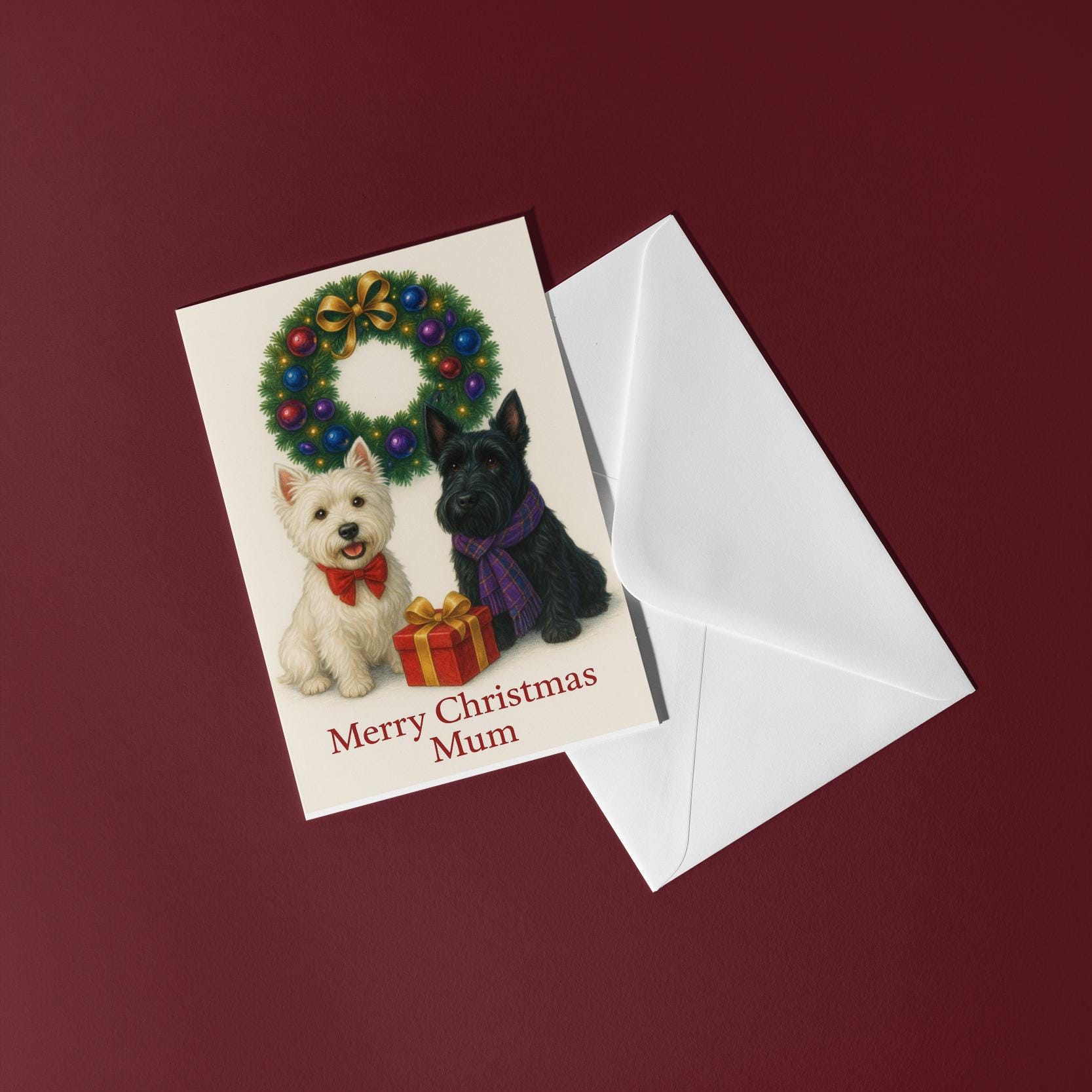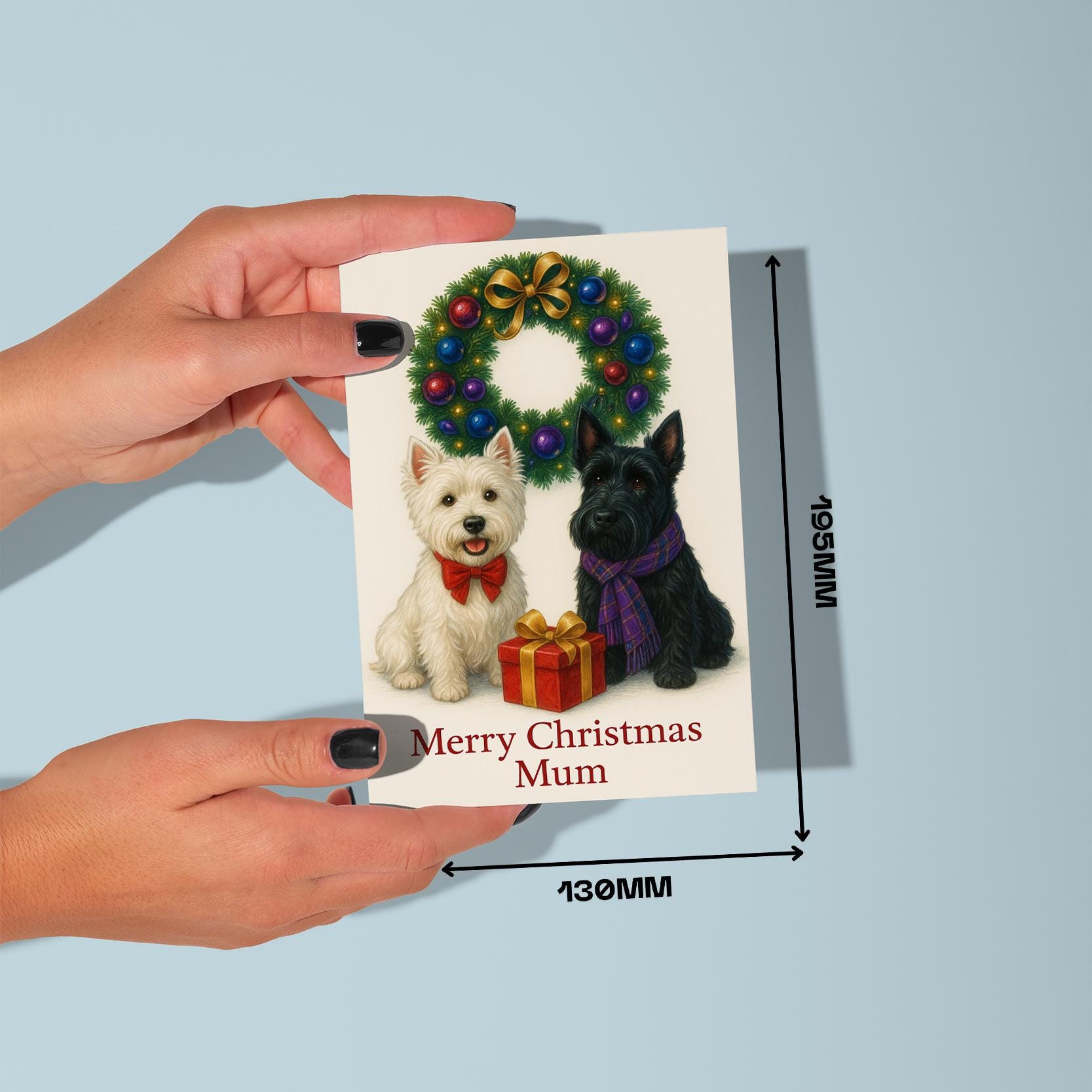 BLANK INTERIOR FOR A PERSONAL TOUCH: Part of the - Dog Breeds Collection - Santa’s Helpers Collection - West Highland White Terrier and Scottish Terrier Dogs Duo - Merry Christmas Mum Card and other whimsical designs feature a blank interior, giving you ample space to write a personal message from the heart. Perfect for any occasion, each card comes with a matching white envelope, making it easy to send your unique sentiments to loved ones.