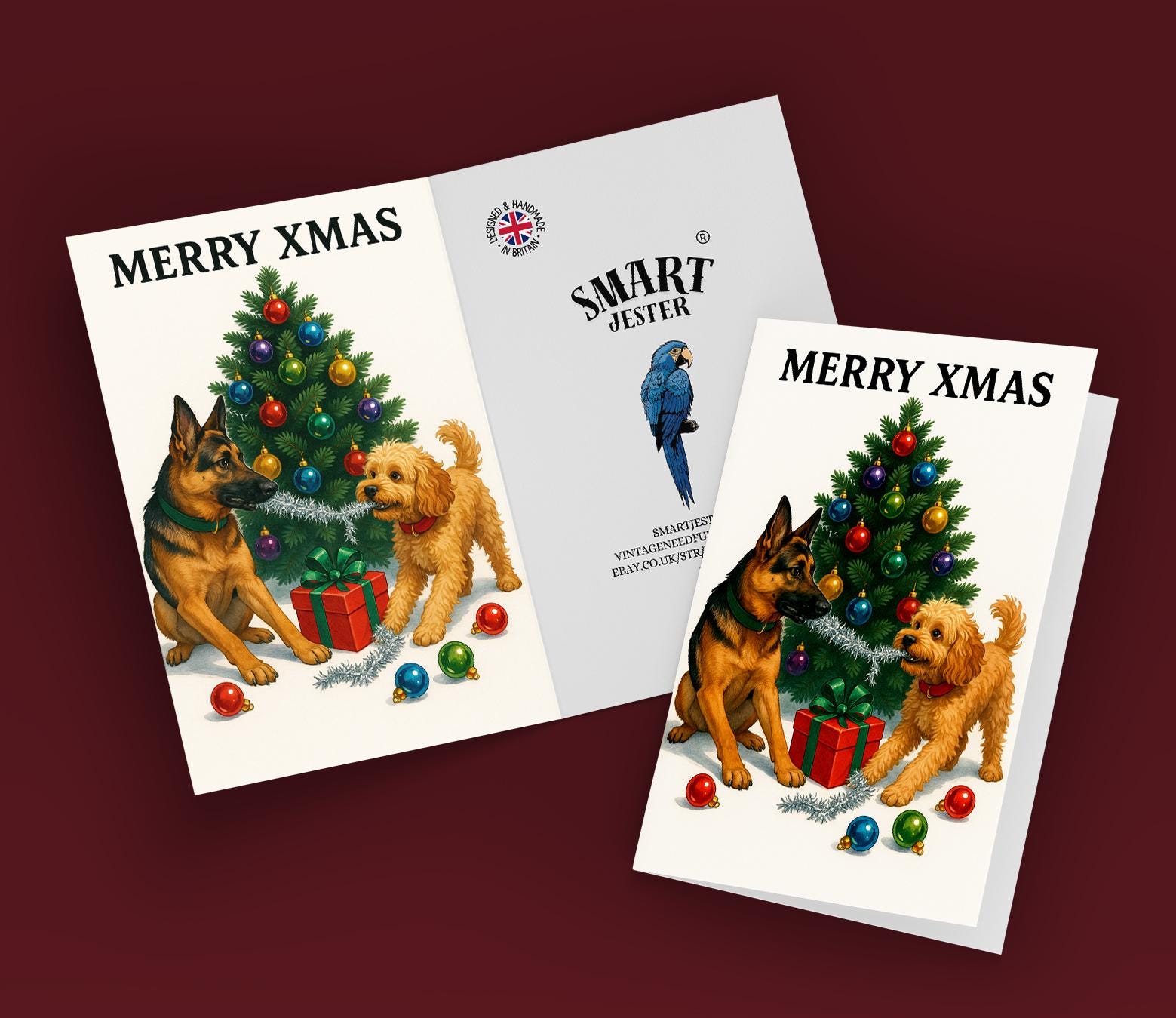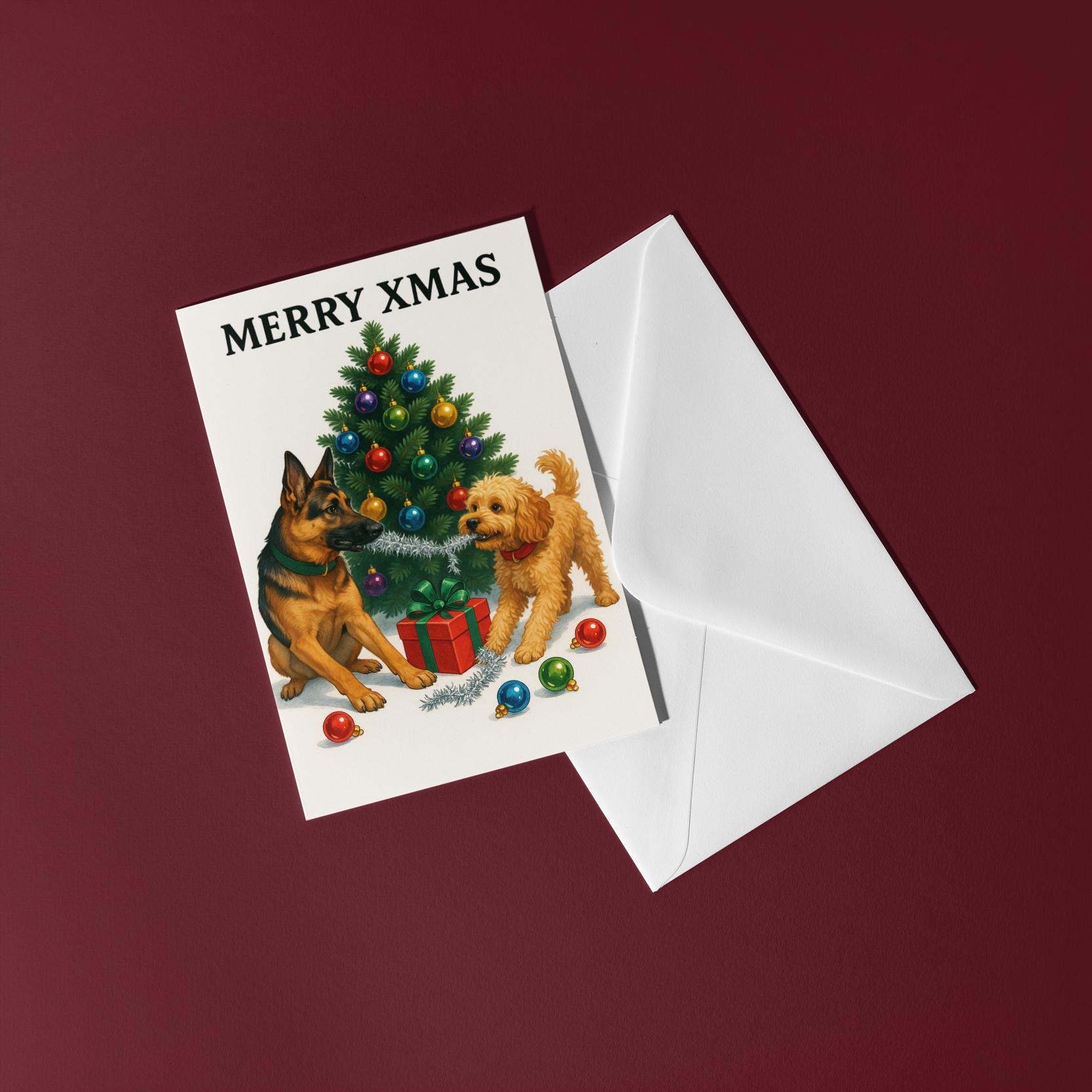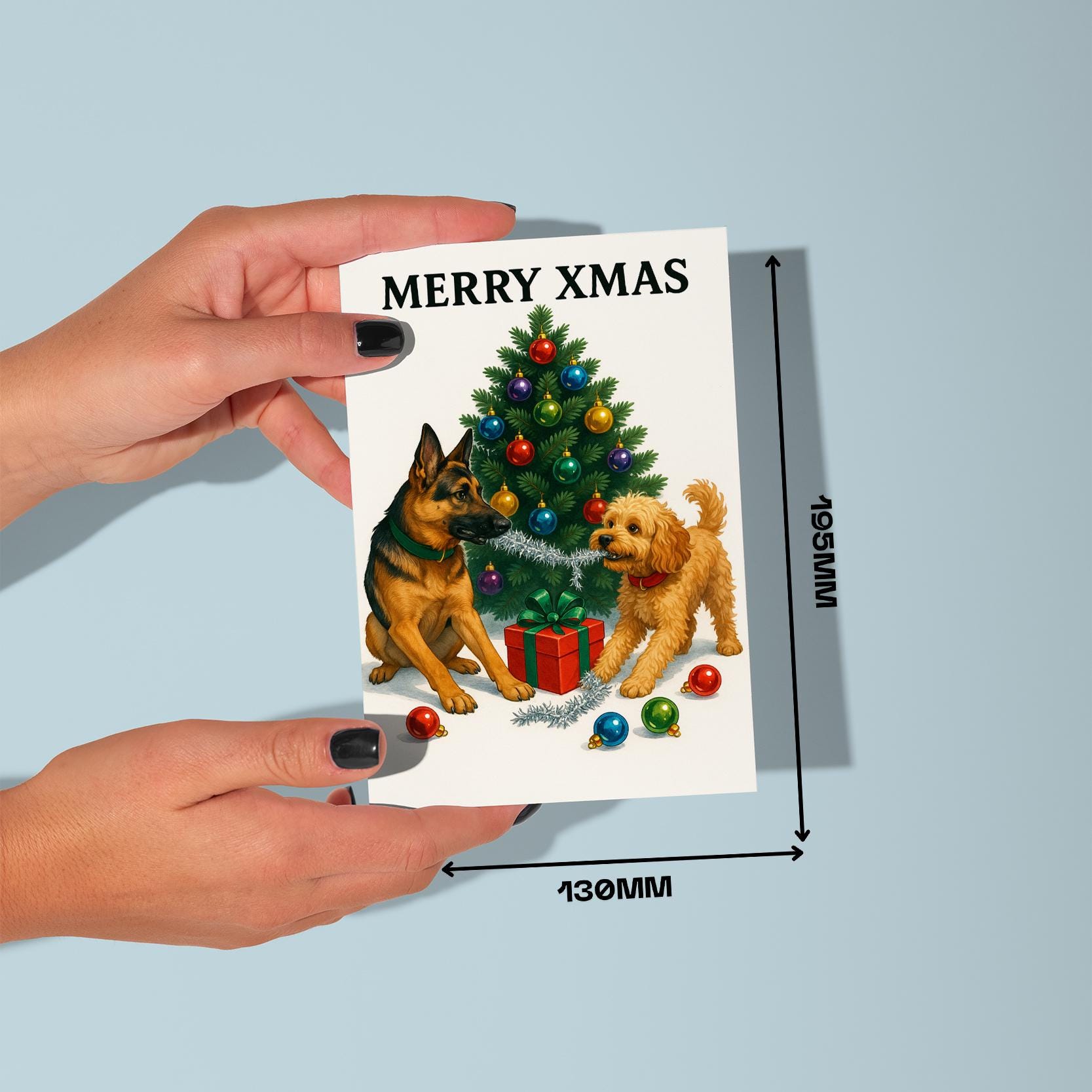 BLANK INTERIOR FOR A PERSONAL TOUCH: Part of the - Dog Breeds Collection - Santa’s Helpers Collection - German Shepherd and Cockapoo Dogs Duo - Festive Tug of Joy - Merry Xmas Card and other whimsical designs feature a blank interior, giving you ample space to write a personal message from the heart. Perfect for any occasion, each card comes with a matching white envelope, making it easy to send your unique sentiments to loved ones.