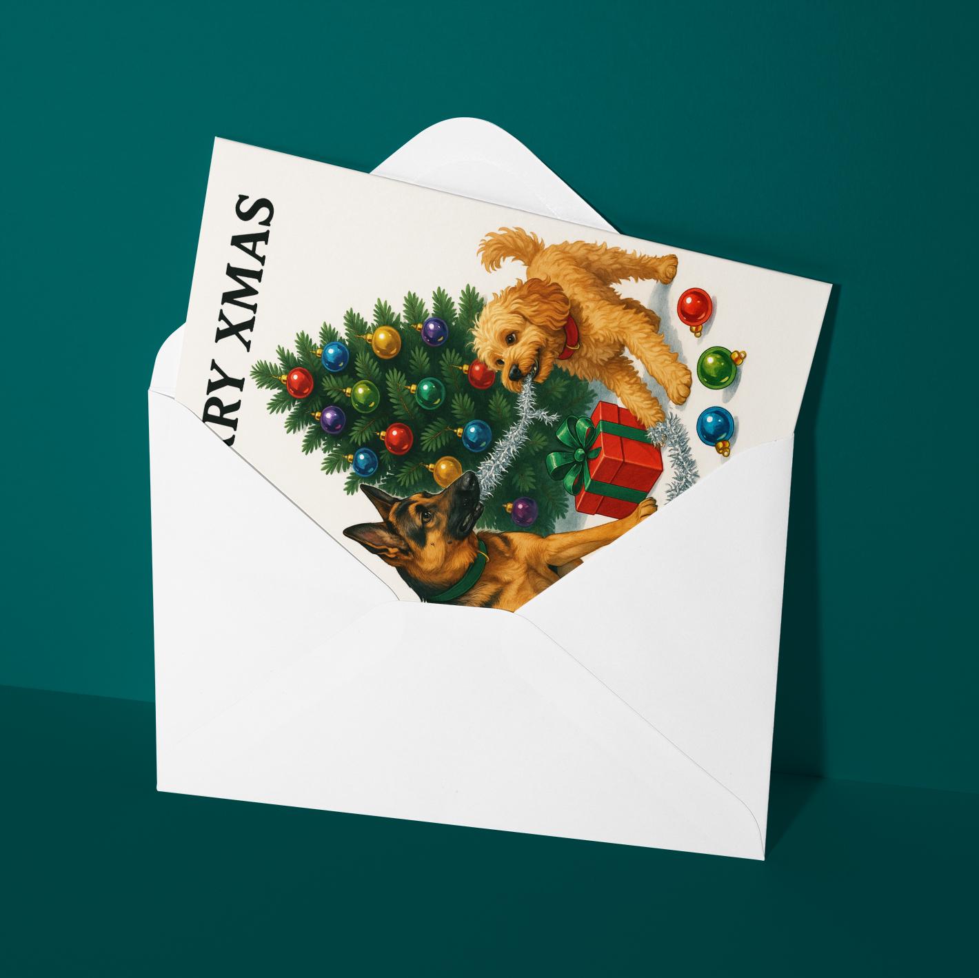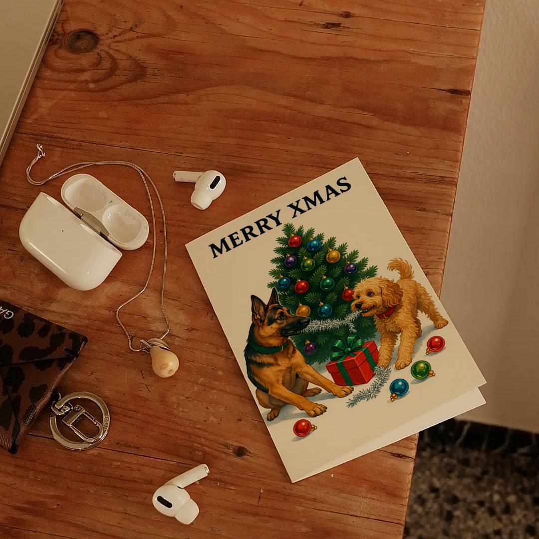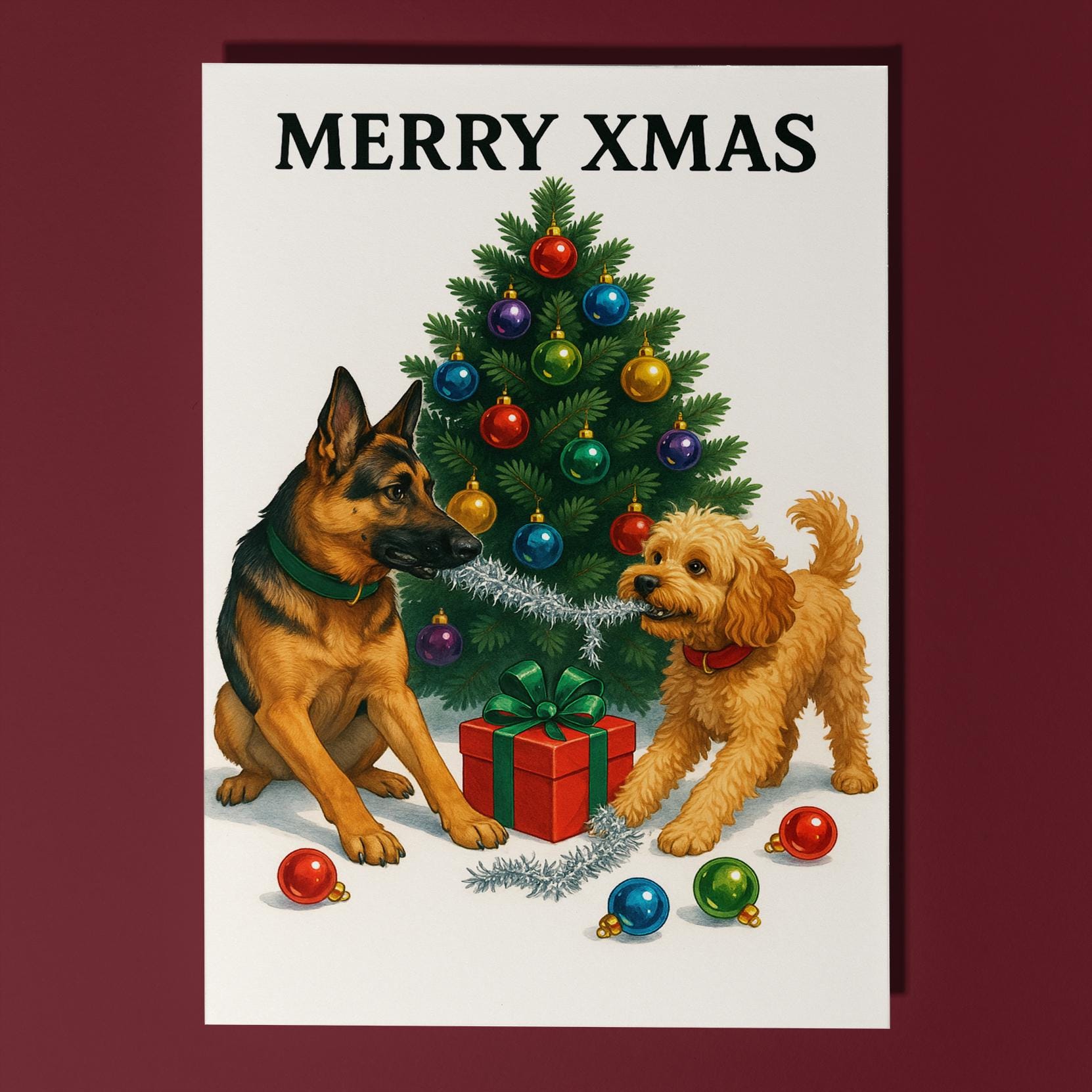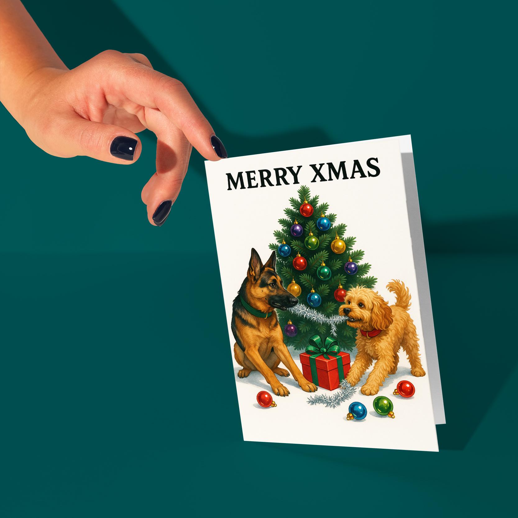 BLANK INTERIOR FOR A PERSONAL TOUCH: Part of the - Dog Breeds Collection - Santa’s Helpers Collection - German Shepherd and Cockapoo Dogs Duo - Festive Tug of Joy - Merry Xmas Card and other whimsical designs feature a blank interior, giving you ample space to write a personal message from the heart. Perfect for any occasion, each card comes with a matching white envelope, making it easy to send your unique sentiments to loved ones.