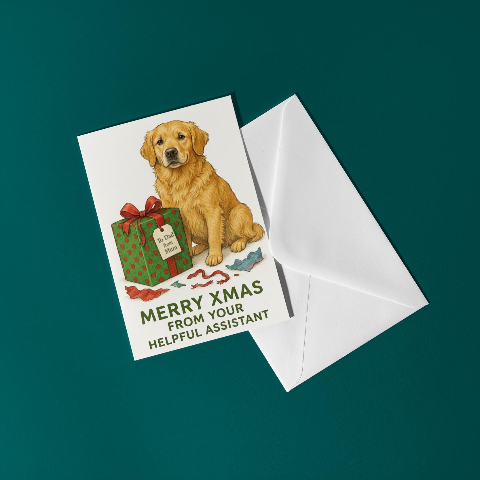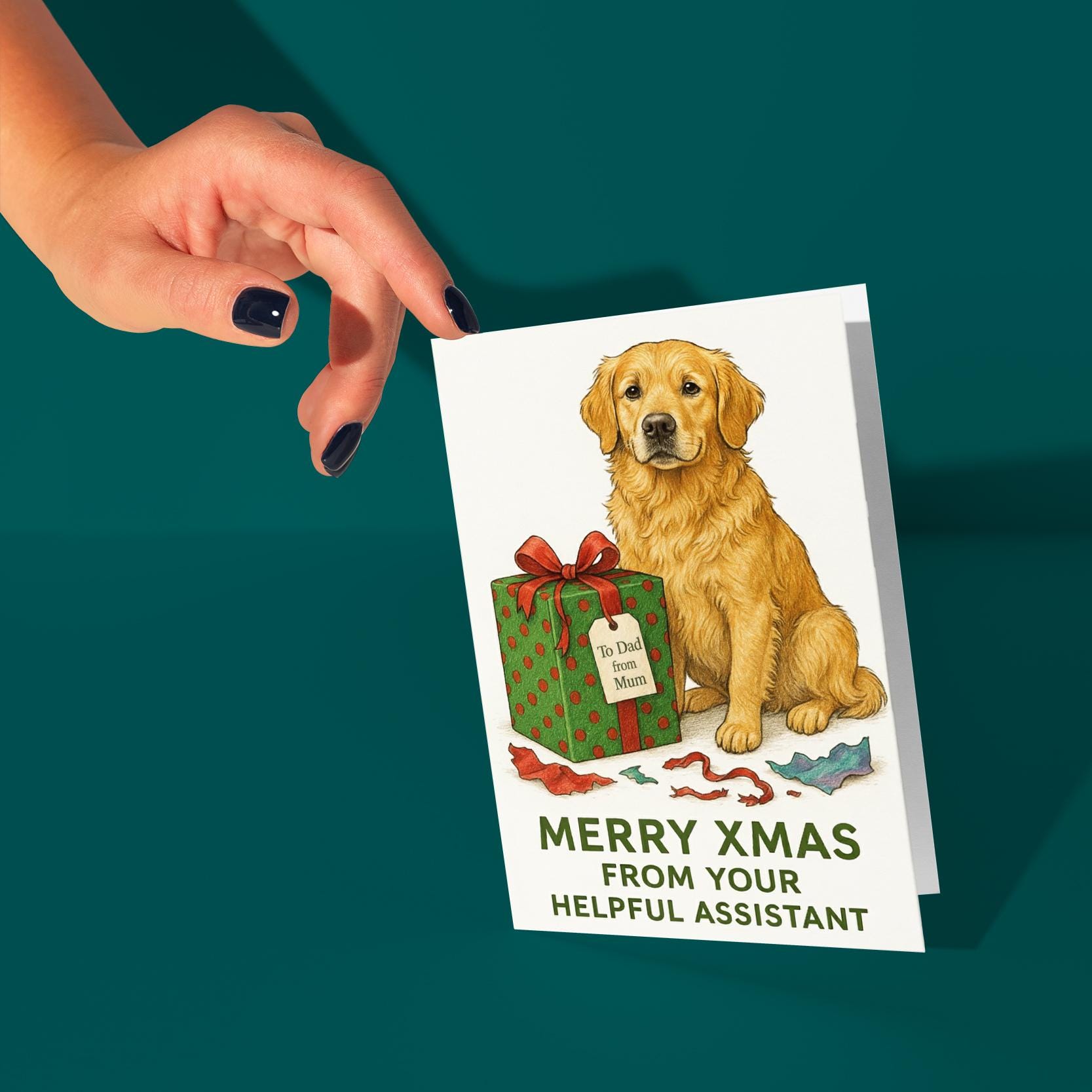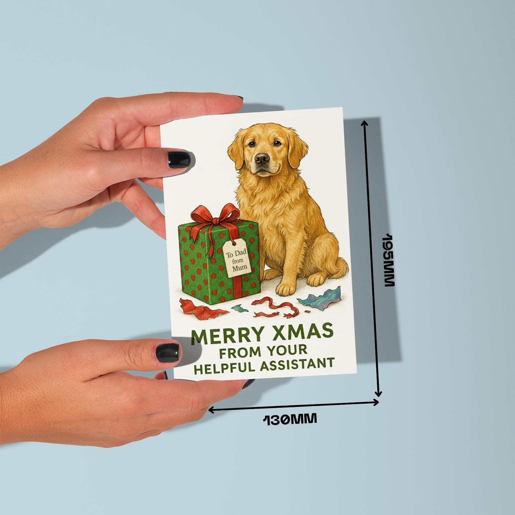 BLANK INTERIOR FOR A PERSONAL TOUCH: Part of the - Dog Breeds Collection - Santa’s Helpers Collection - Golden Retriever Santa’s Wrapping Assistant - To Dad from Mum - Merry Xmas from your helpful Assistant - Merry Xmas Card and other whimsical designs feature a blank interior, giving you ample space to write a personal message from the heart. Perfect for any occasion, each card comes with a matching white envelope, making it easy to send your unique sentiments to loved ones.