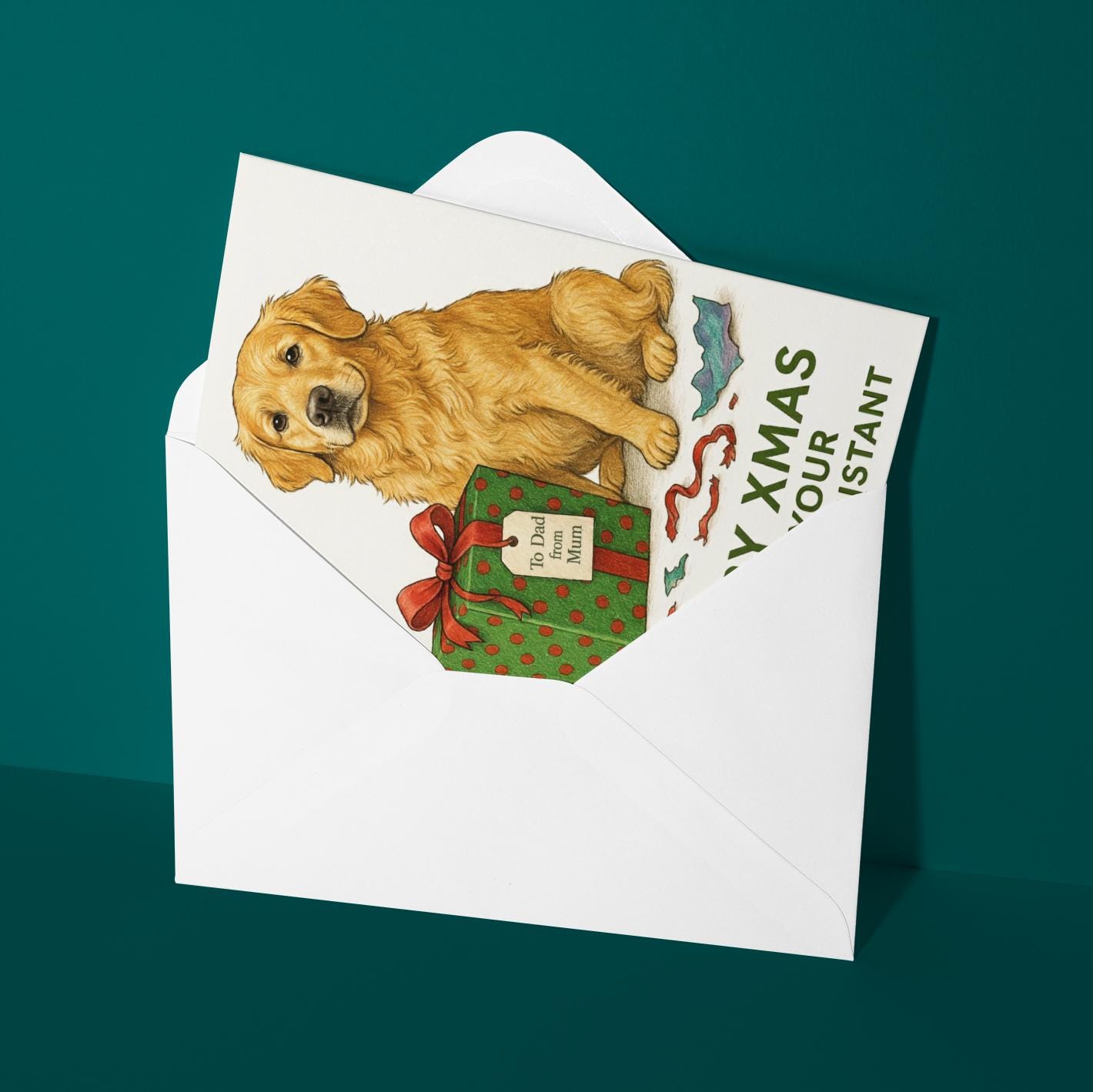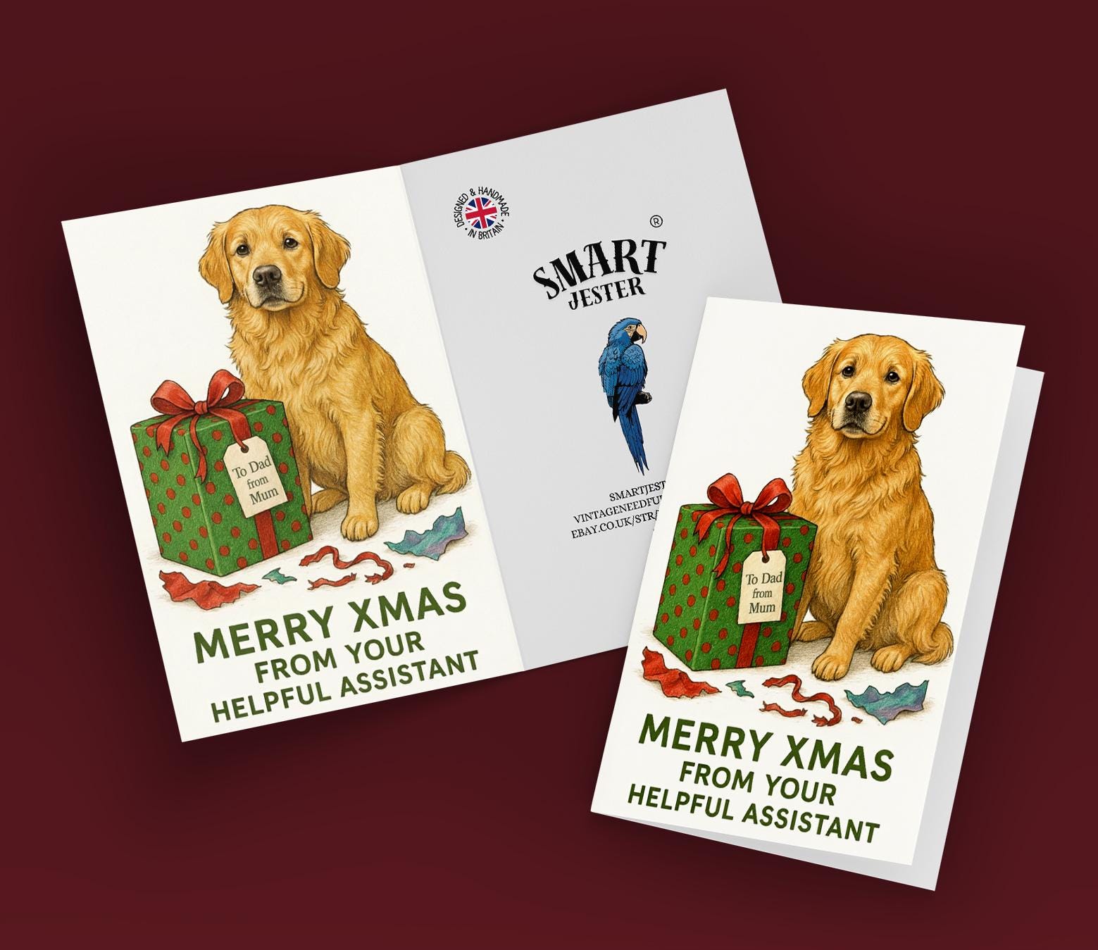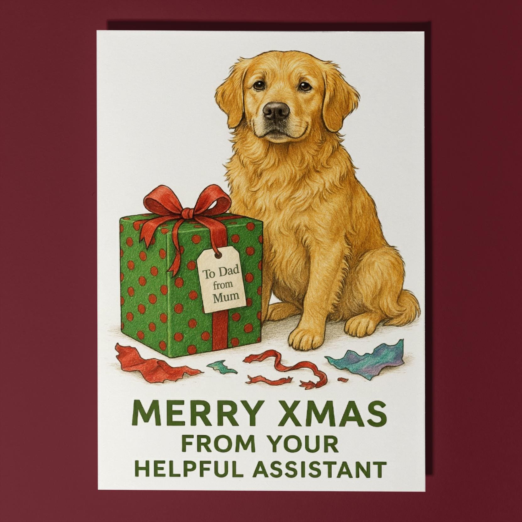 BLANK INTERIOR FOR A PERSONAL TOUCH: Part of the - Dog Breeds Collection - Santa’s Helpers Collection - Golden Retriever Santa’s Wrapping Assistant - To Dad from Mum - Merry Xmas from your helpful Assistant - Merry Xmas Card and other whimsical designs feature a blank interior, giving you ample space to write a personal message from the heart. Perfect for any occasion, each card comes with a matching white envelope, making it easy to send your unique sentiments to loved ones.