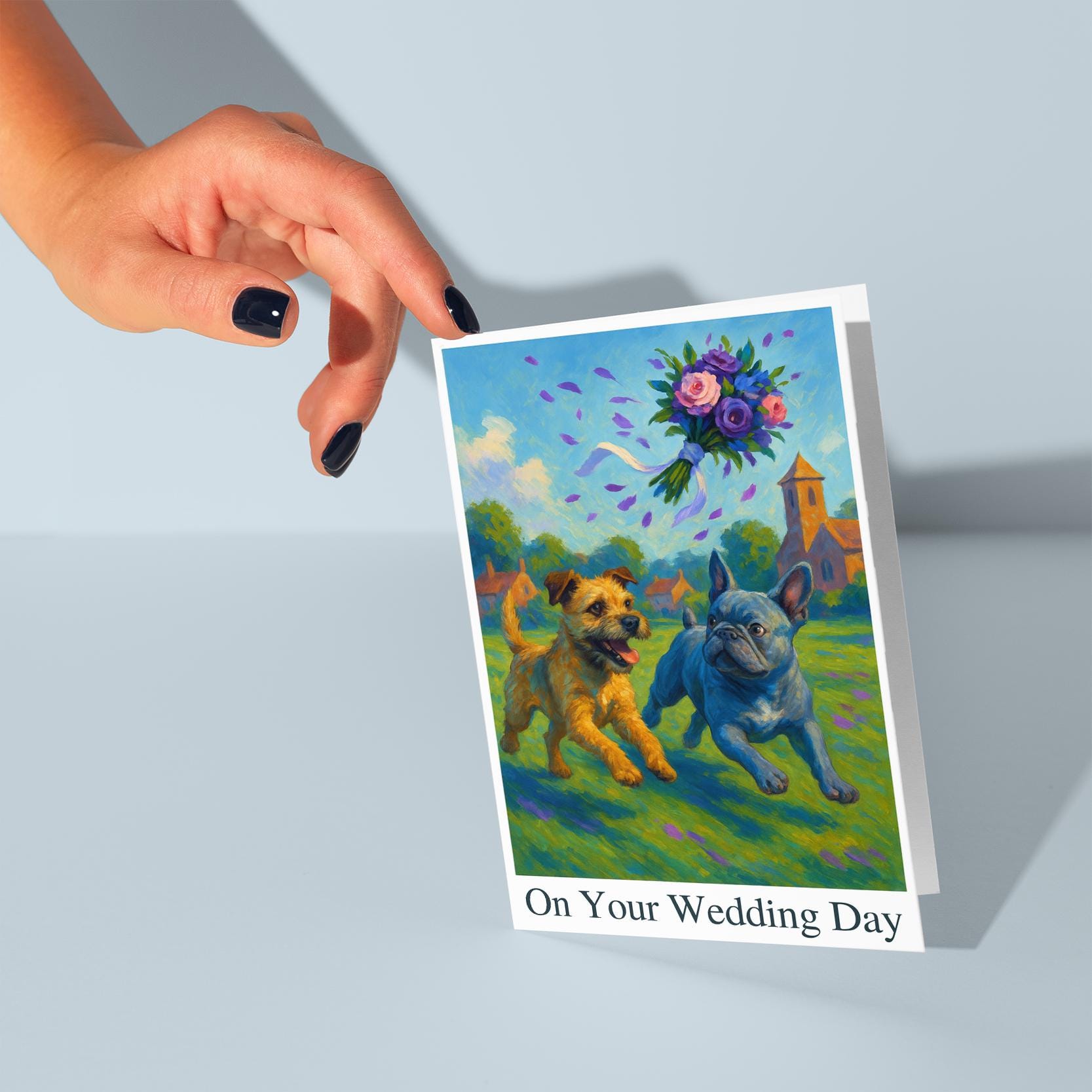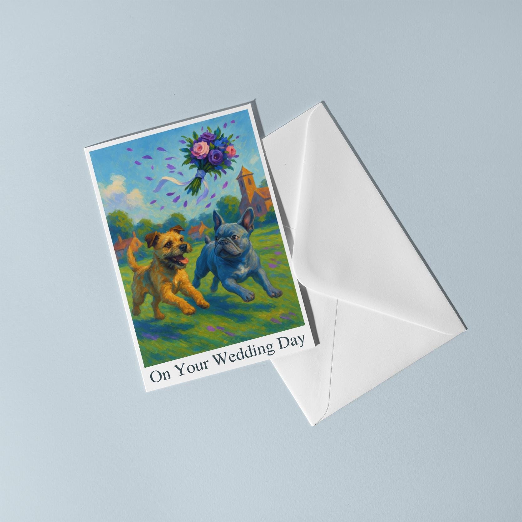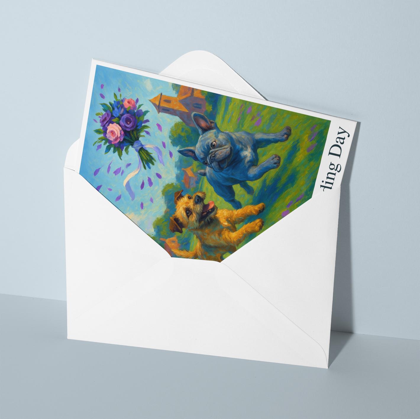BLANK INTERIOR FOR A PERSONAL TOUCH: Our Dogs breeds collection - Wedding Edition - Border Terrier and French Bulldog Dog Duo - Bouquet Chase - On your wedding day Card and other whimsical designs feature a blank interior, giving you ample space to write a personal message from the heart. Perfect for any occasion, each card comes with a matching white envelope, making it easy to send your unique sentiments to loved ones.