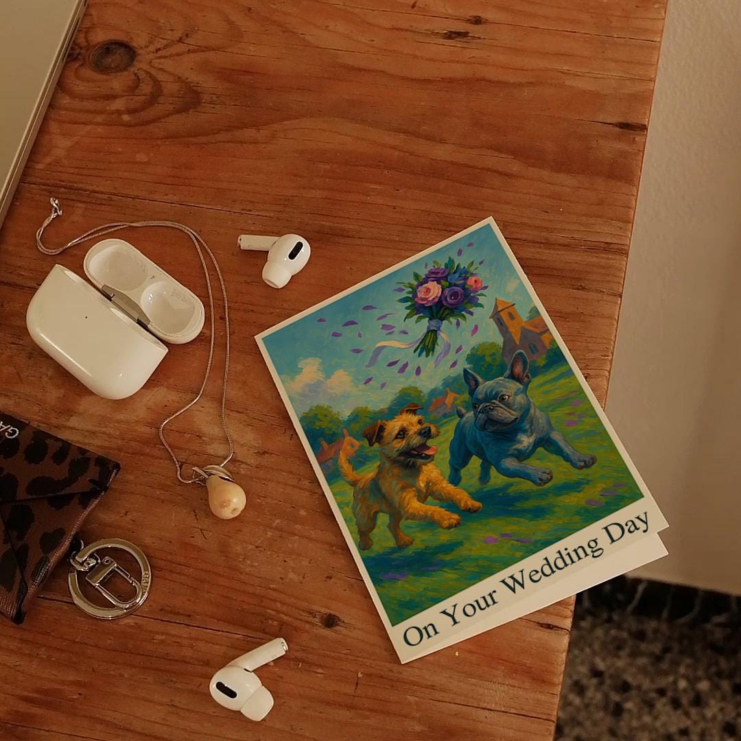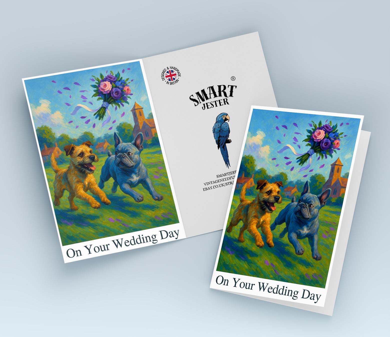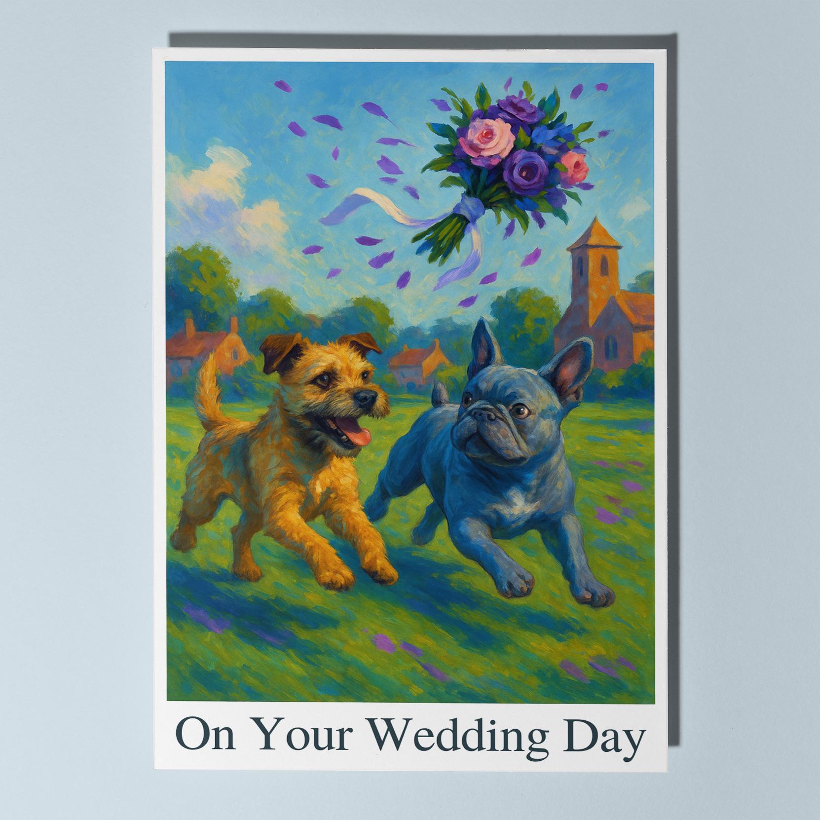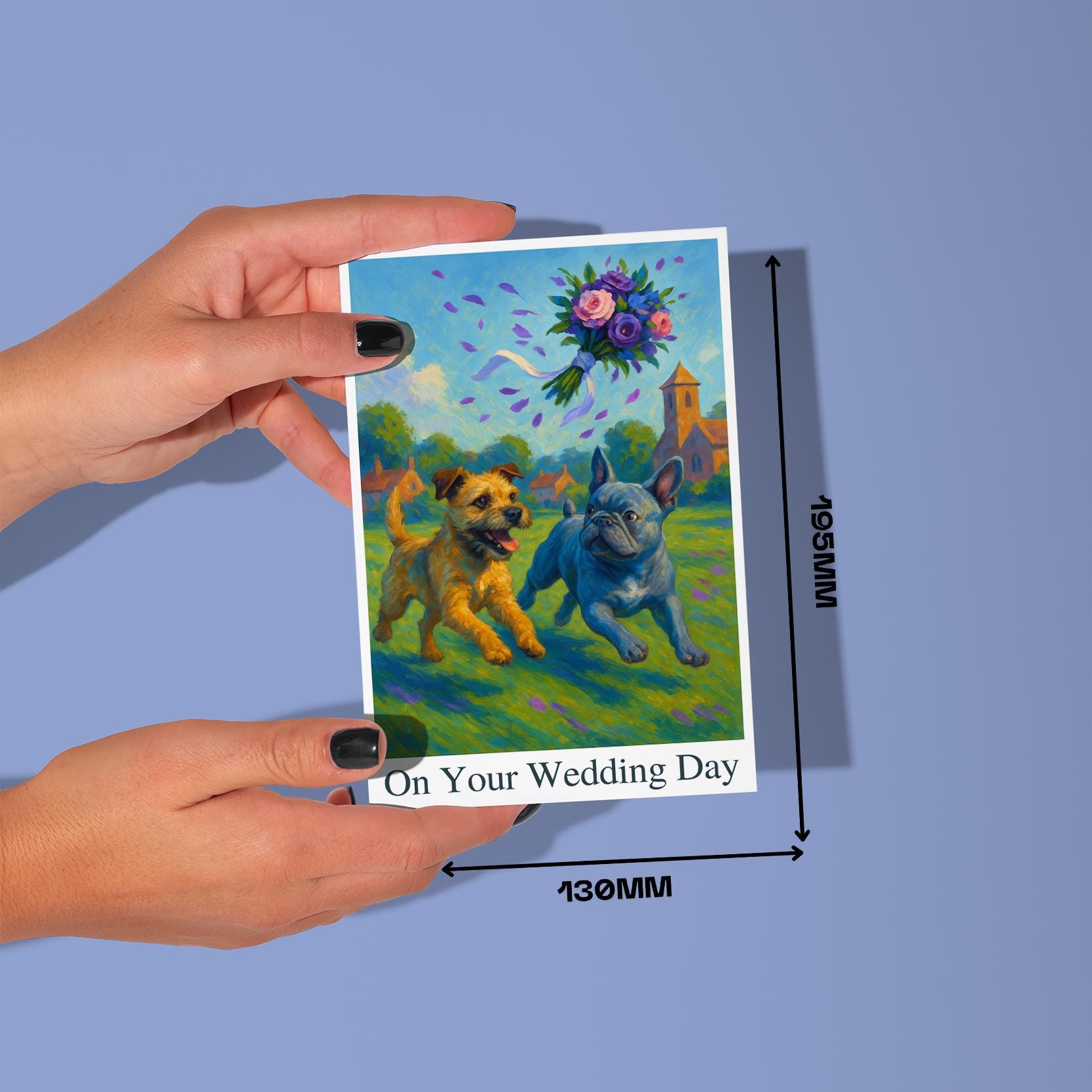 BLANK INTERIOR FOR A PERSONAL TOUCH: Our Dogs breeds collection - Wedding Edition - Border Terrier and French Bulldog Dog Duo - Bouquet Chase - On your wedding day Card and other whimsical designs feature a blank interior, giving you ample space to write a personal message from the heart. Perfect for any occasion, each card comes with a matching white envelope, making it easy to send your unique sentiments to loved ones.