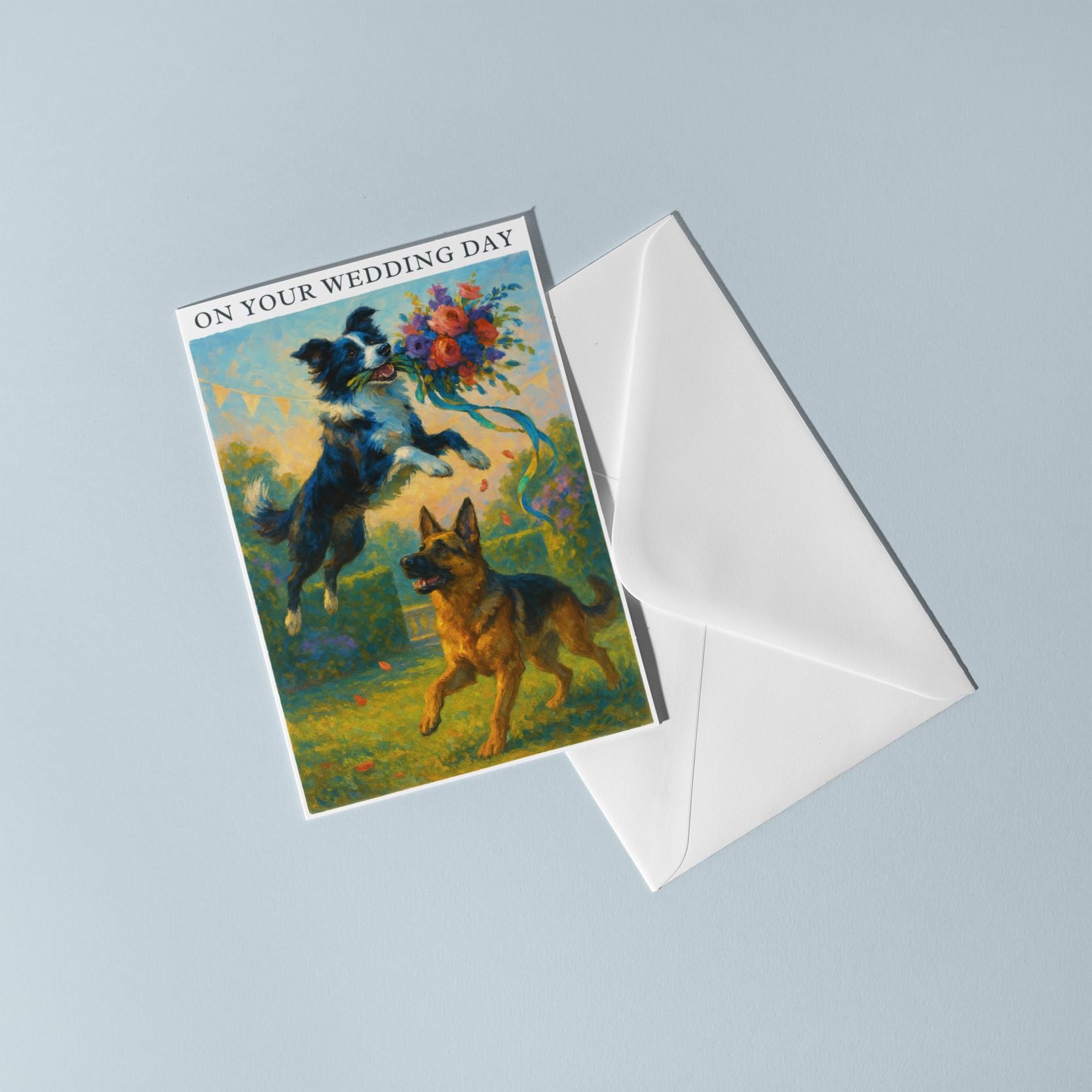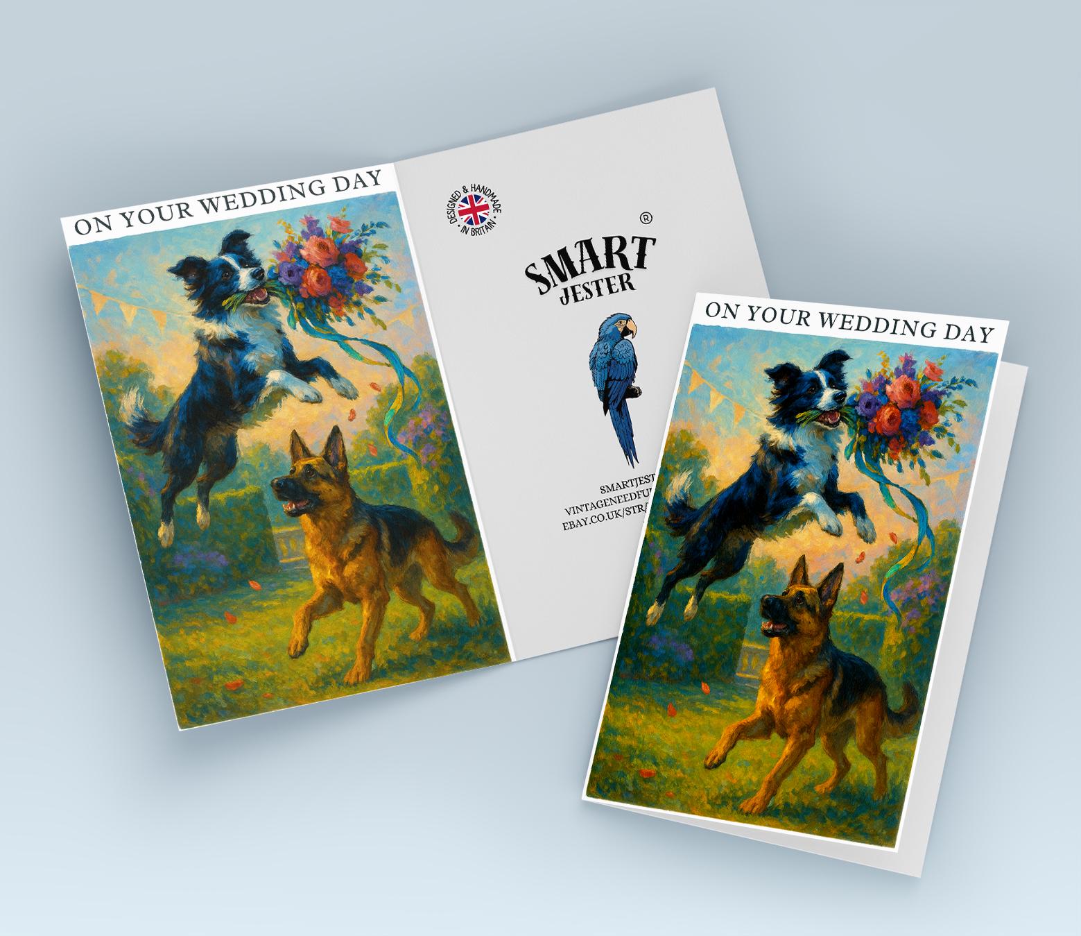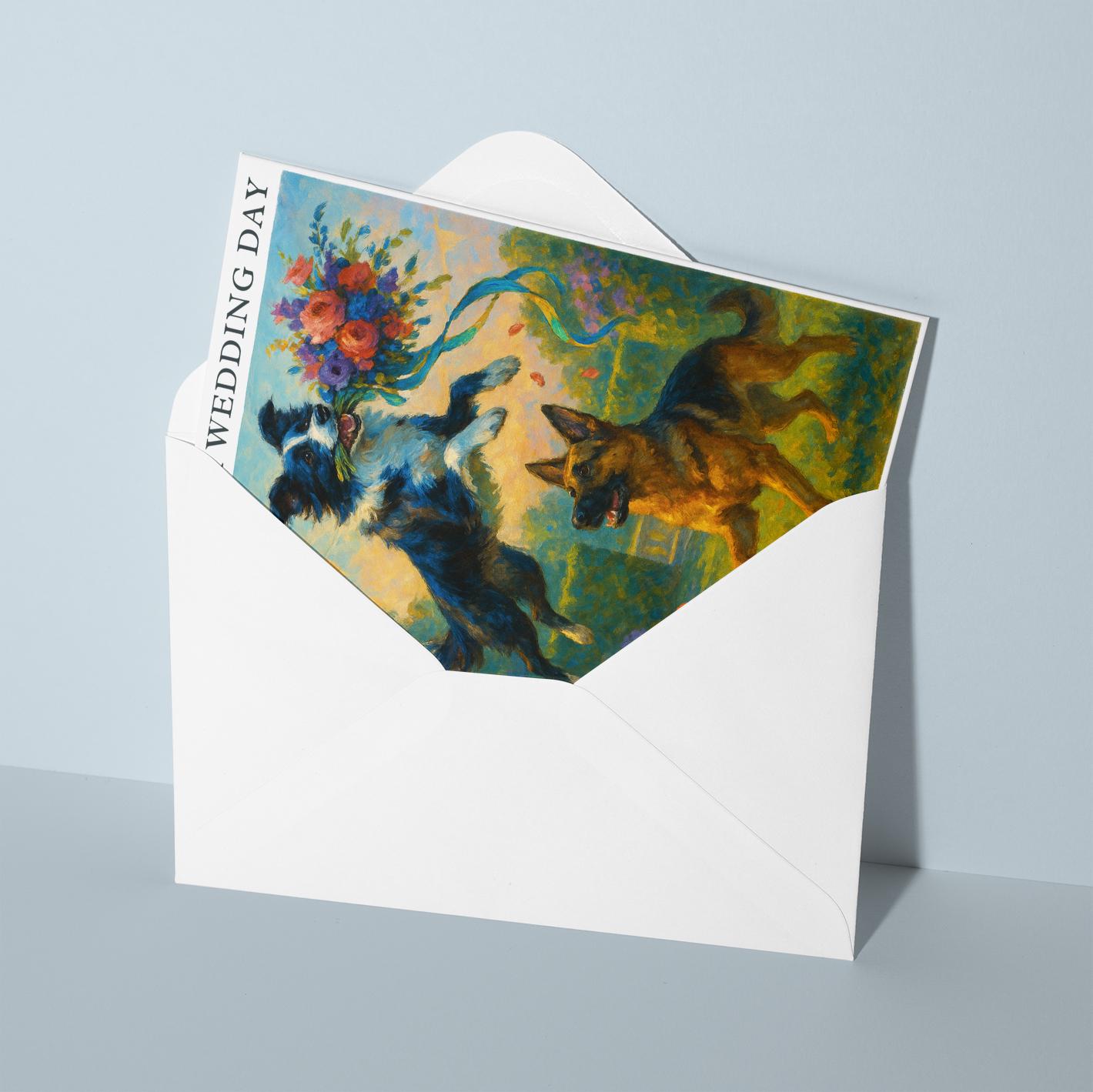 BLANK INTERIOR FOR A PERSONAL TOUCH: Our Dogs breeds collection - Wedding Edition - Border collie and German Shepherd Dog Duo - Bouquet Chase - On your wedding day Card and other whimsical designs feature a blank interior, giving you ample space to write a personal message from the heart. Perfect for any occasion, each card comes with a matching white envelope, making it easy to send your unique sentiments to loved ones.