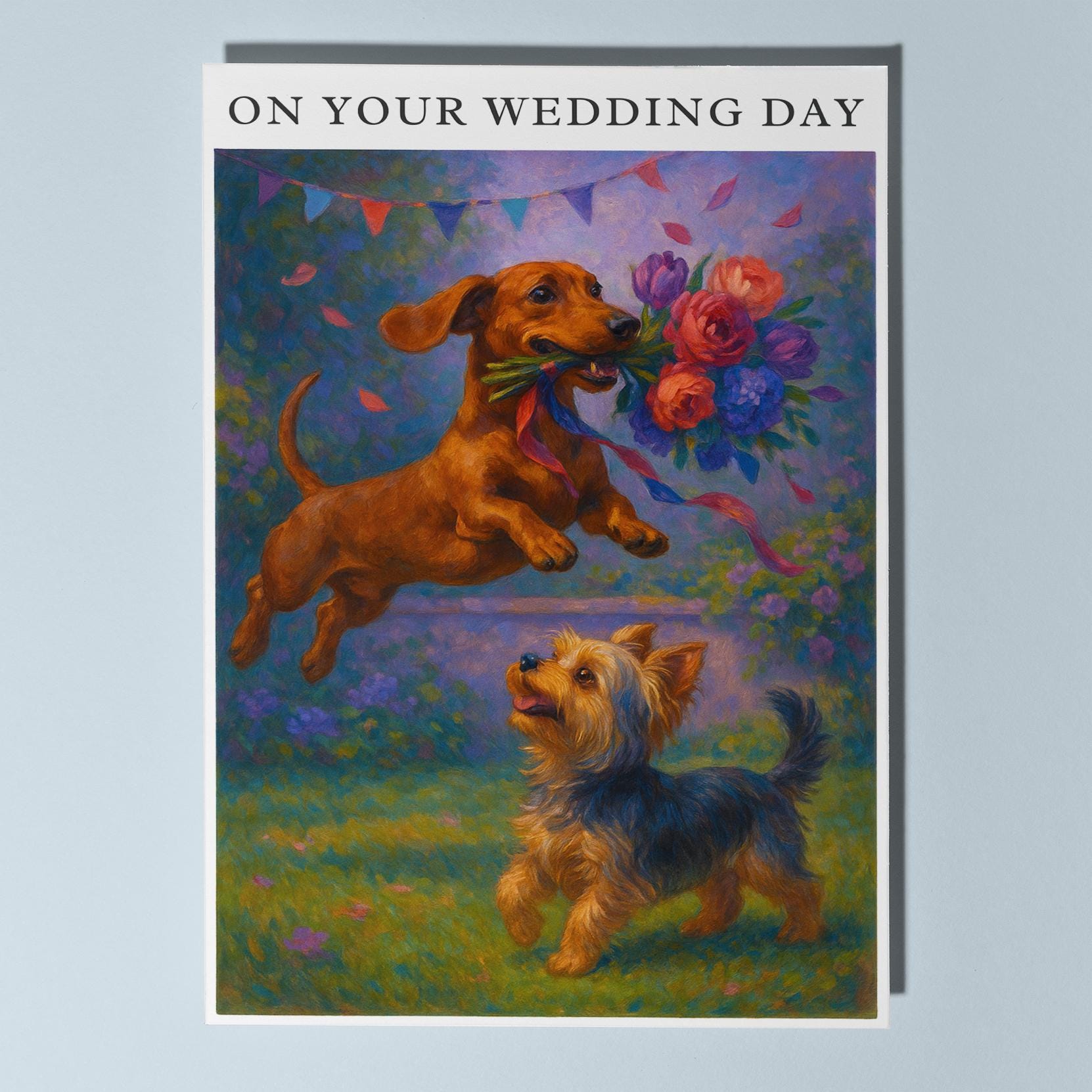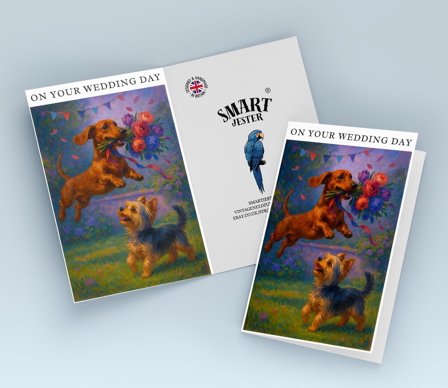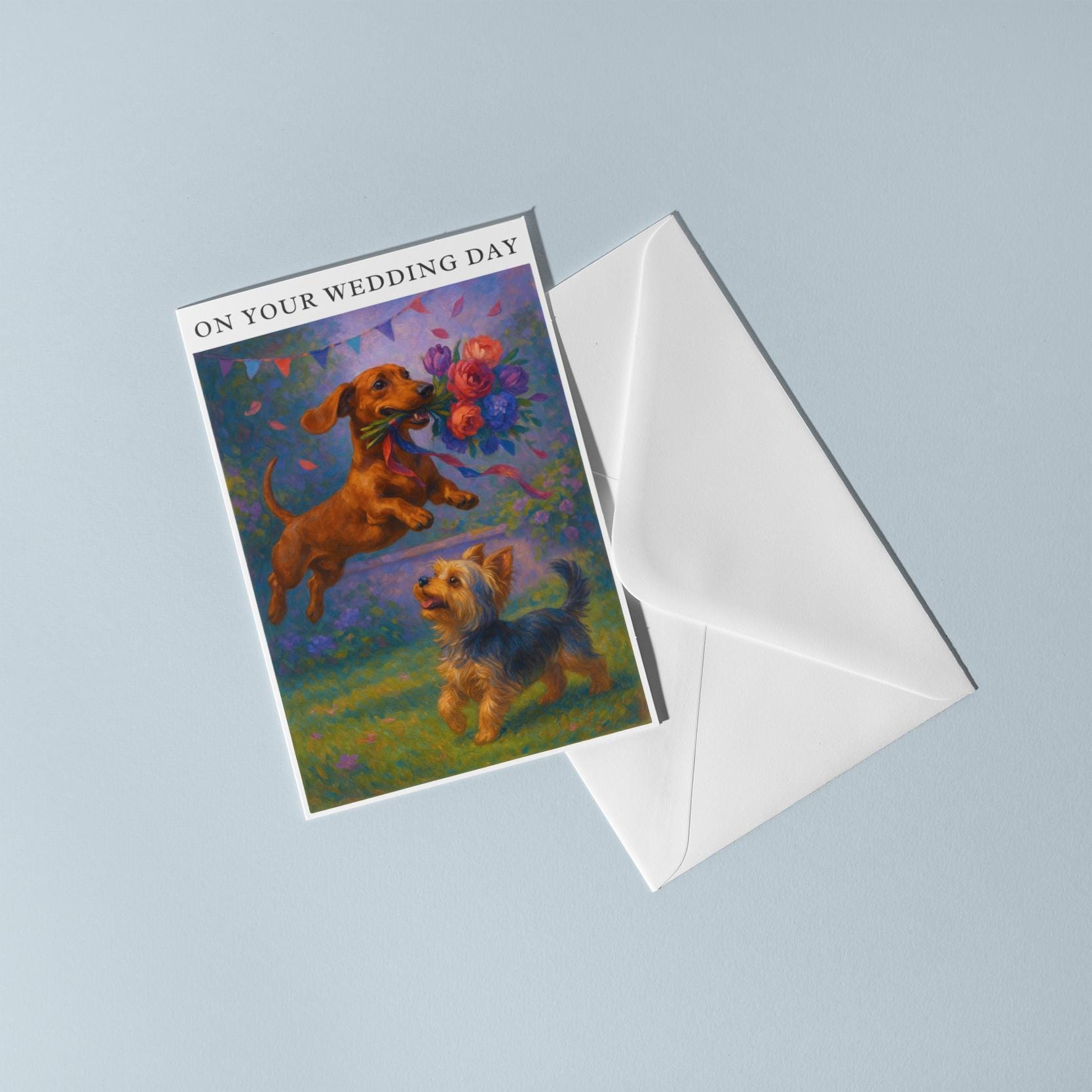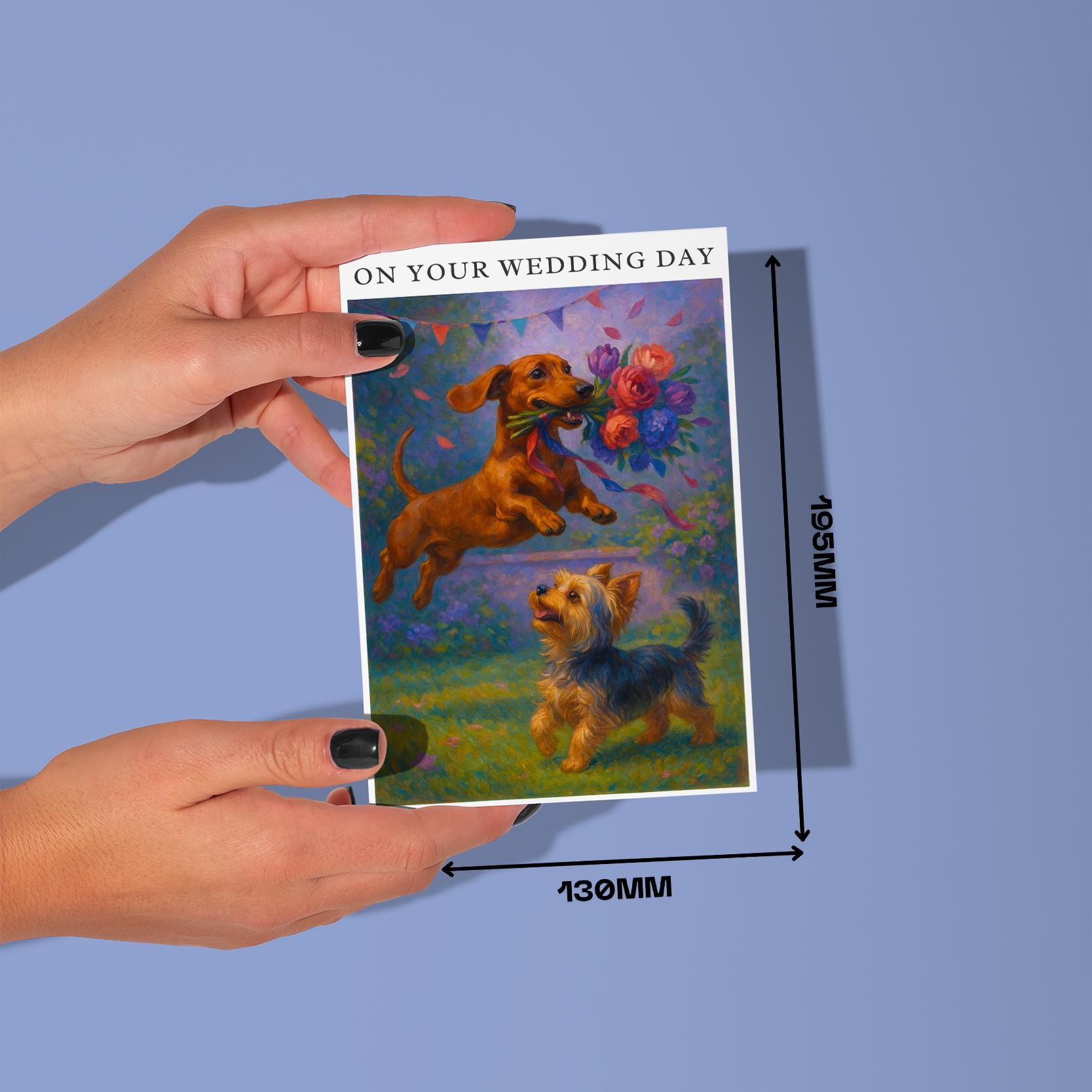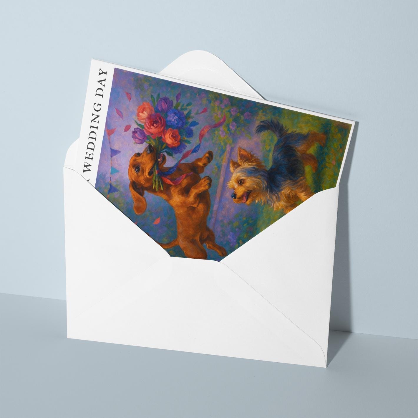 BLANK INTERIOR FOR A PERSONAL TOUCH: Our Dogs breeds collection - Wedding Edition - Dachshund and Yorkshire terrier Dogs Duo - Bouquet Chase - On your wedding day Card and other whimsical designs feature a blank interior, giving you ample space to write a personal message from the heart. Perfect for any occasion, each card comes with a matching white envelope, making it easy to send your unique sentiments to loved ones.