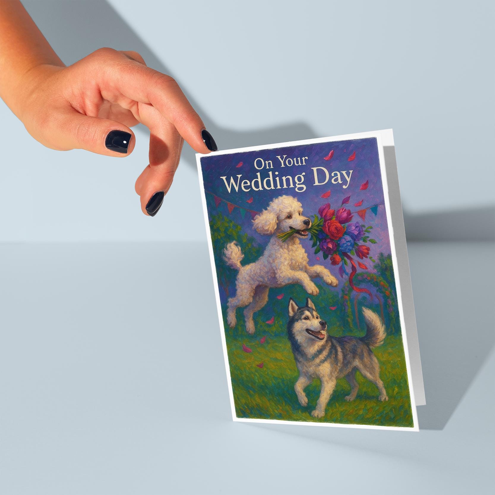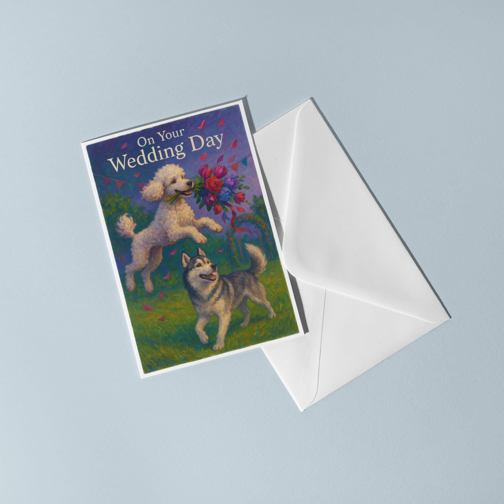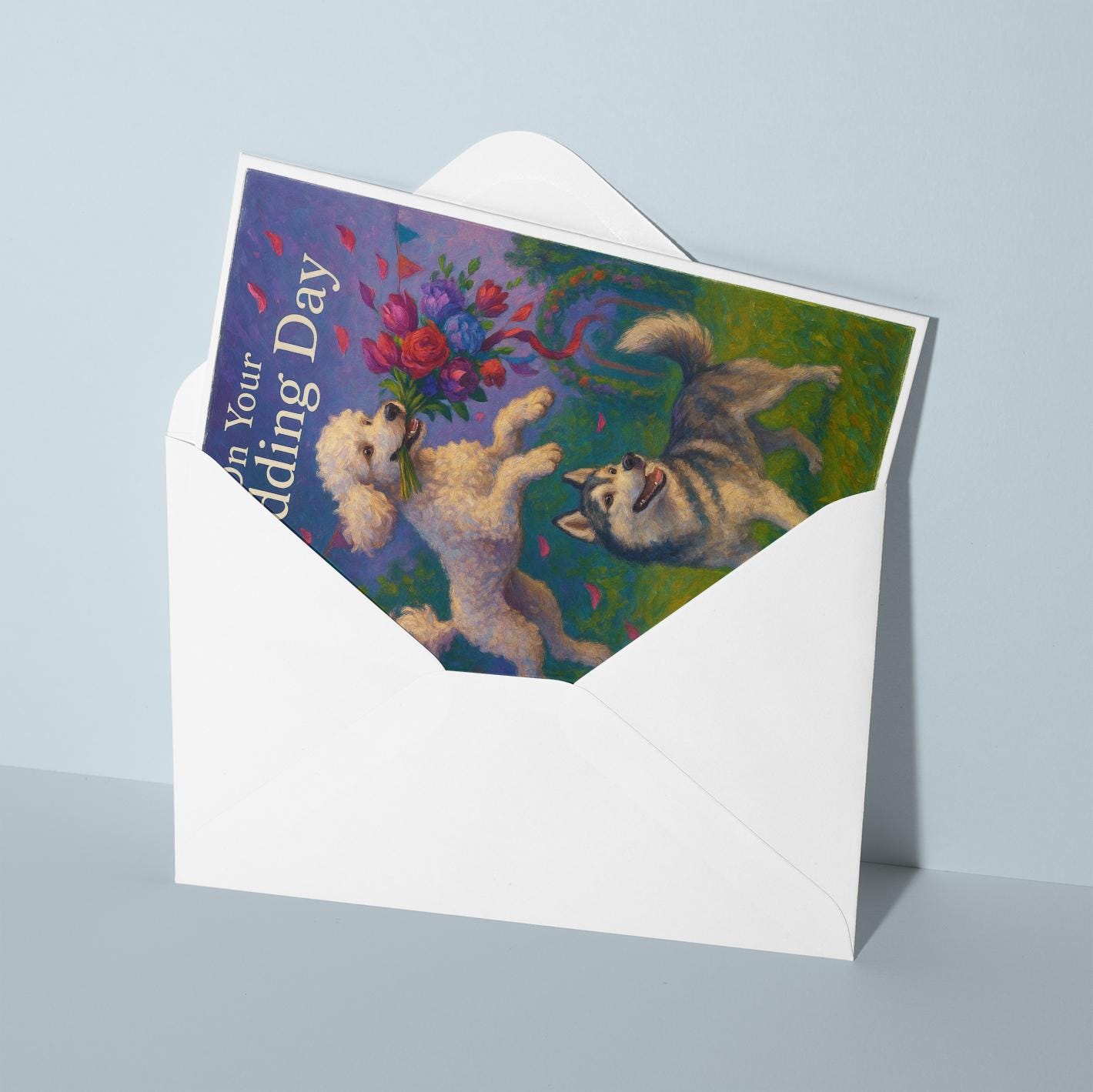 BLANK INTERIOR FOR A PERSONAL TOUCH: Our Dogs breeds collection - Wedding Edition - Poodle and Husky Dogs Duo - Bouquet Chase - On your wedding day Card and other whimsical designs feature a blank interior, giving you ample space to write a personal message from the heart. Perfect for any occasion, each card comes with a matching white envelope, making it easy to send your unique sentiments to loved ones.