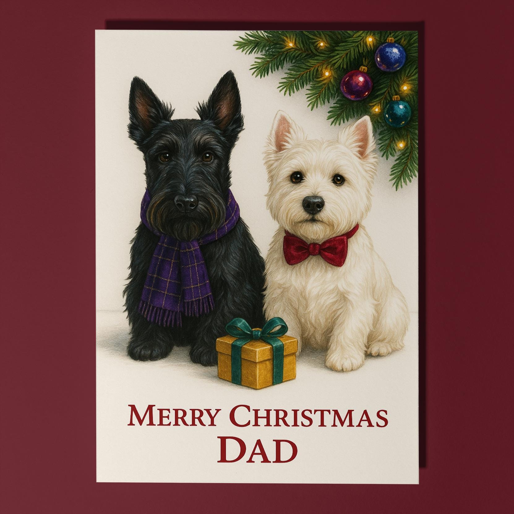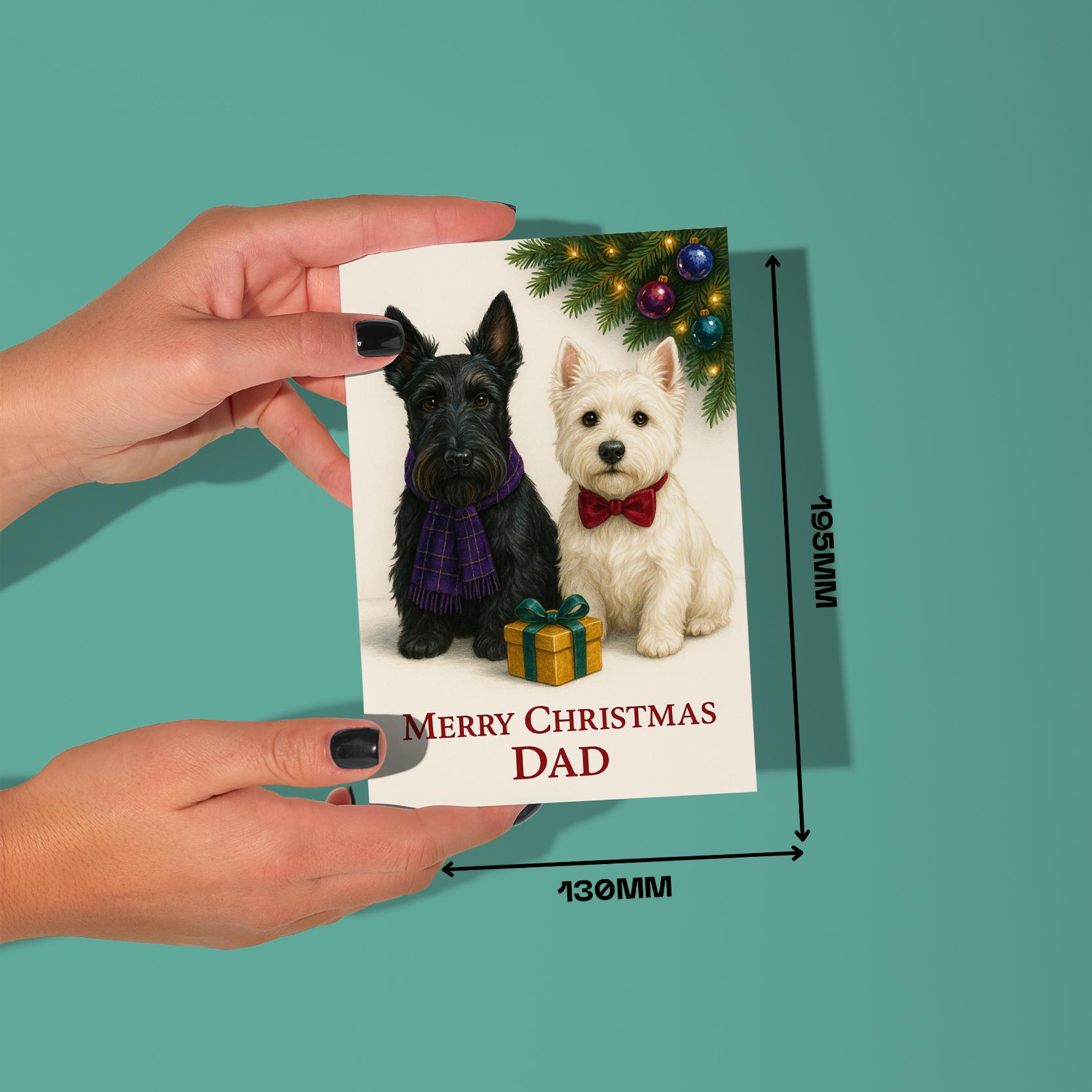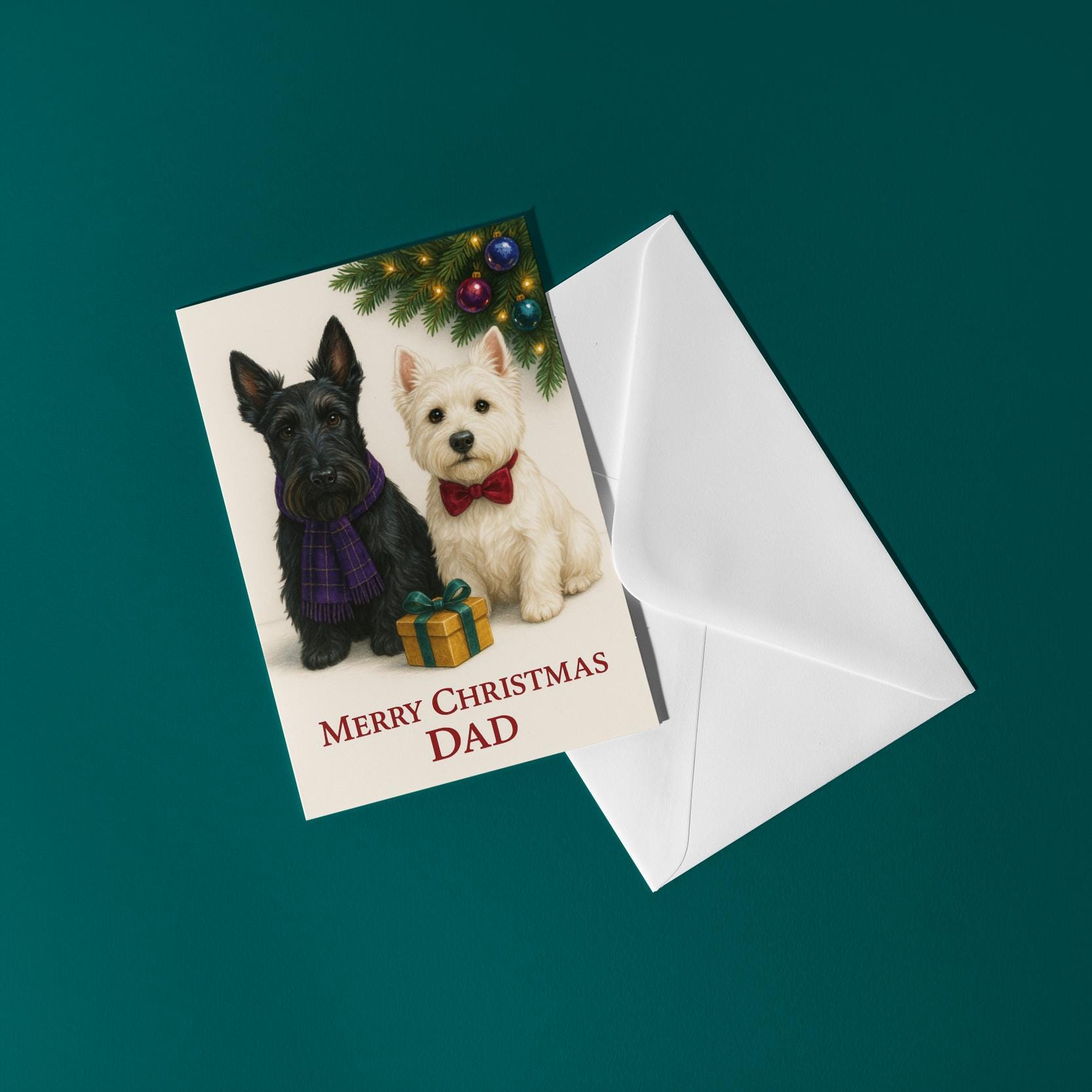 BLANK INTERIOR FOR A PERSONAL TOUCH: Part of the - Dog Breeds Collection - Santa’s Helpers Collection - West highland white terrier and Scottish Terrier Dogs Duo - Merry Christmas Dad Card and other whimsical designs feature a blank interior, giving you ample space to write a personal message from the heart. Perfect for any occasion, each card comes with a matching white envelope, making it easy to send your unique sentiments to loved ones.