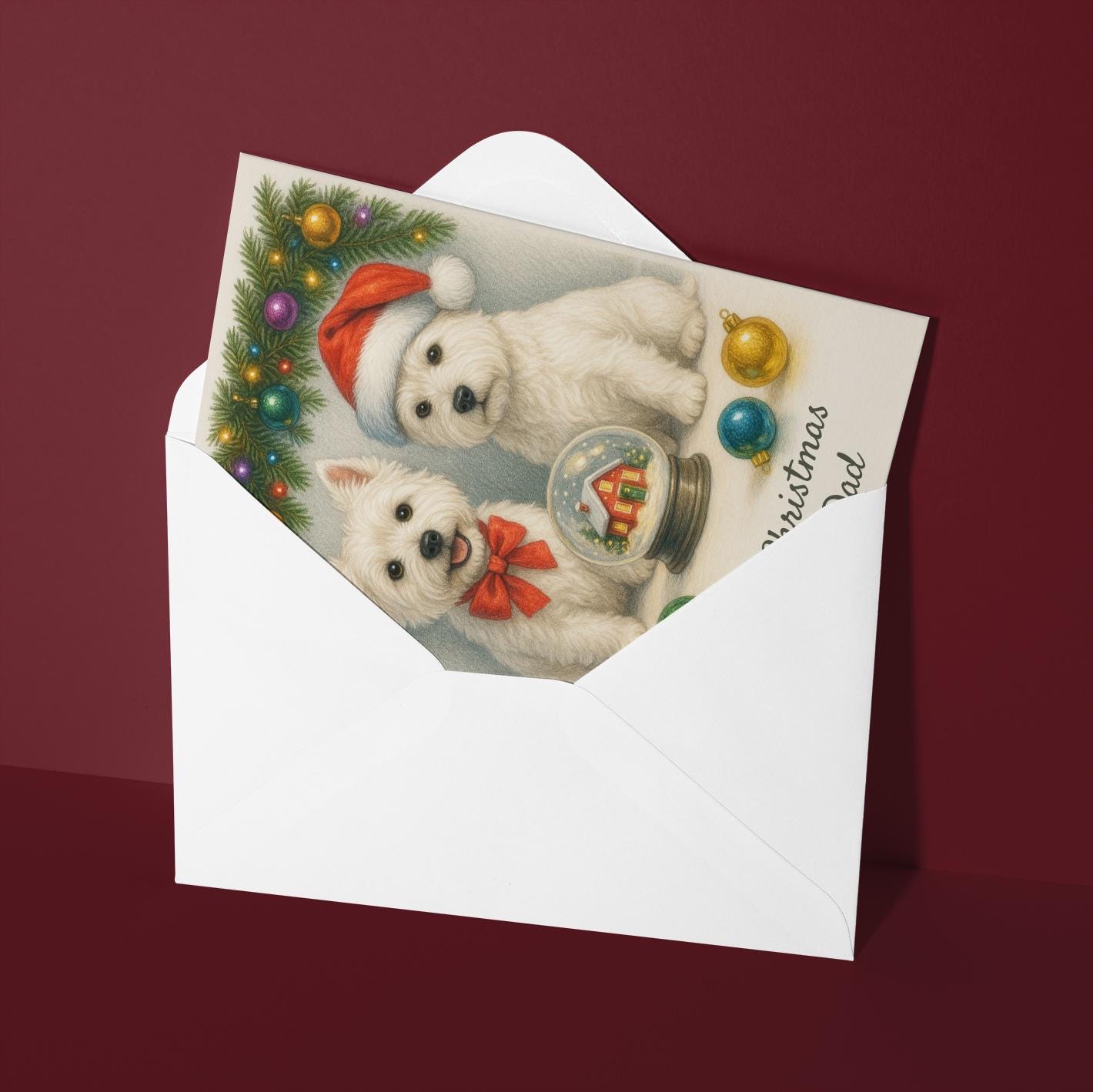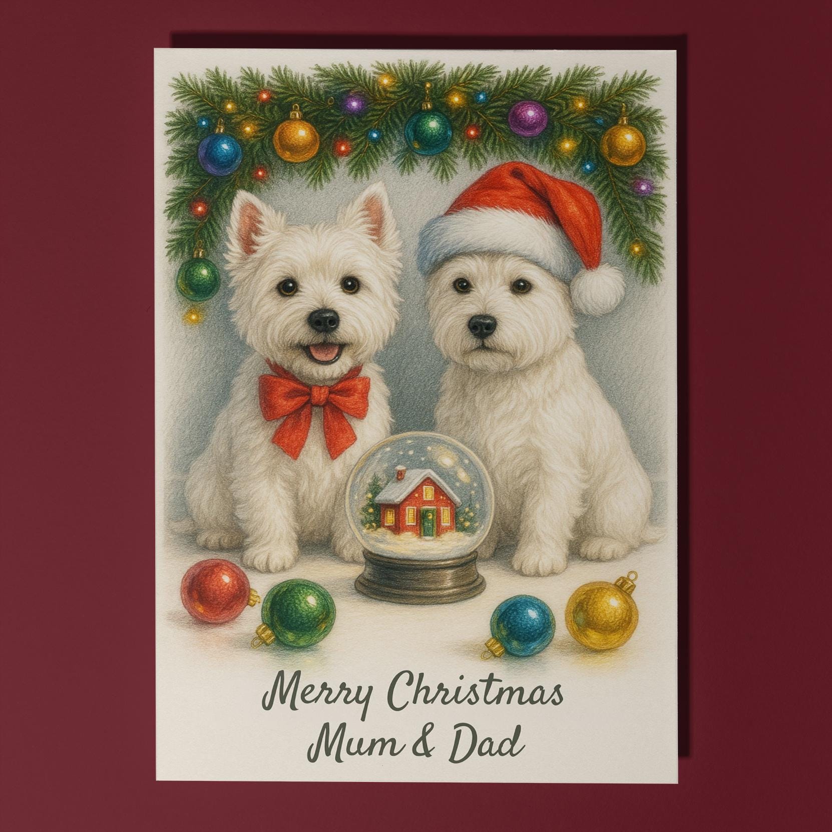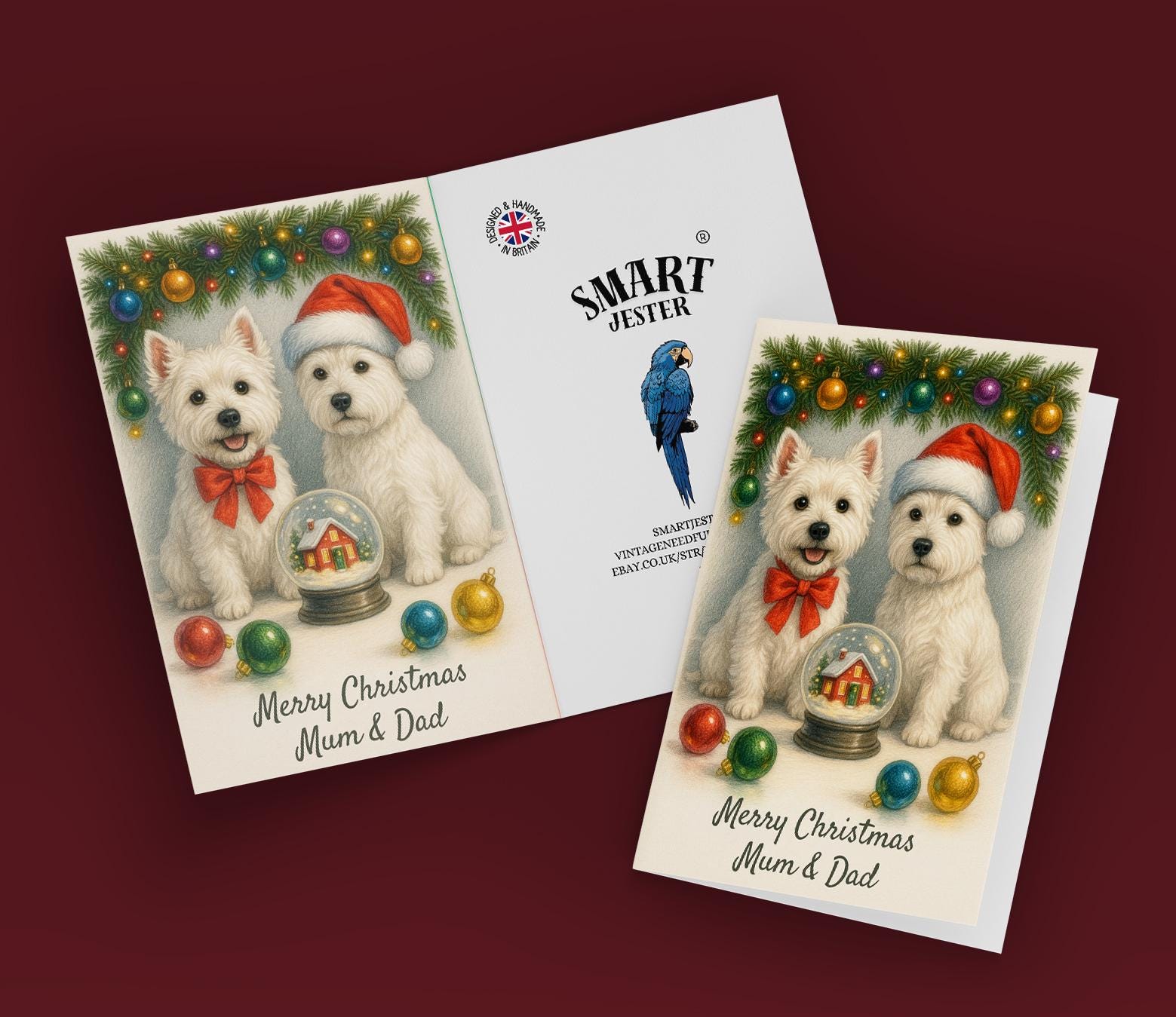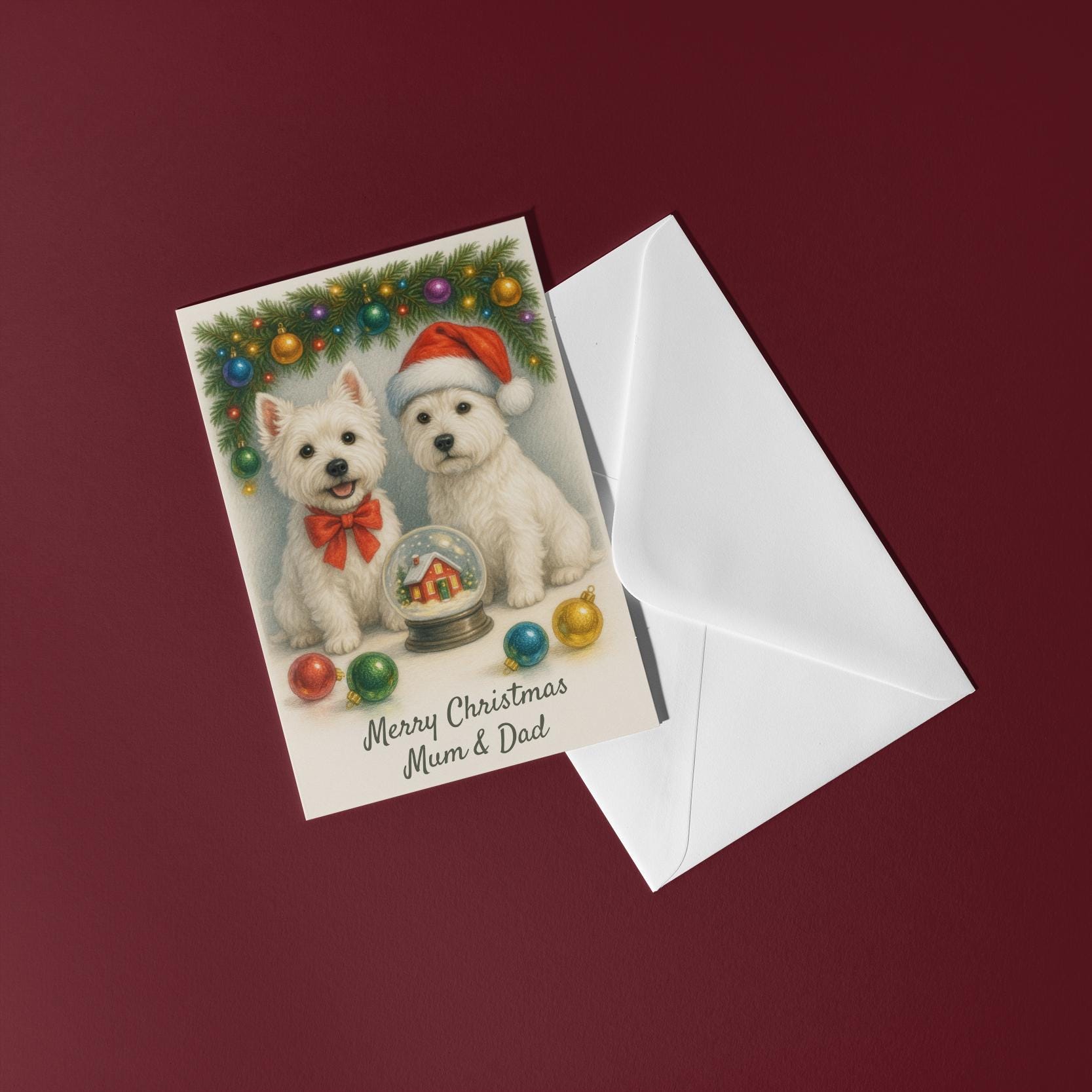 BLANK INTERIOR FOR A PERSONAL TOUCH: Part of the - Dog Breeds Collection - Santa’s Helpers Collection - West Highland Terriers Dogs Duo - Cozy Nose and Snow Globe - Merry Christmas Mum and Dad! Card and other whimsical designs feature a blank interior, giving you ample space to write a personal message from the heart. Perfect for any occasion, each card comes with a matching white envelope, making it easy to send your unique sentiments to loved ones.