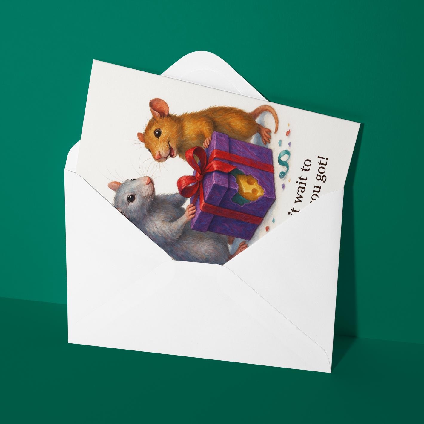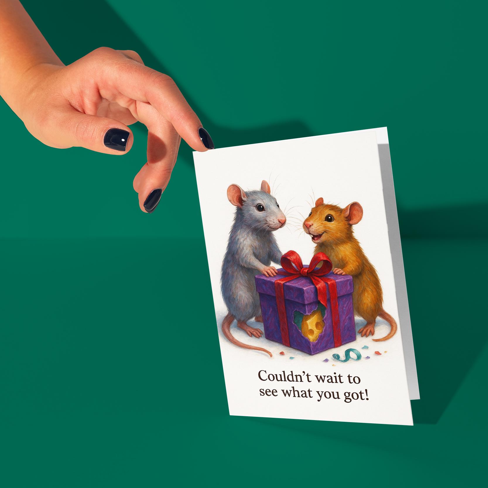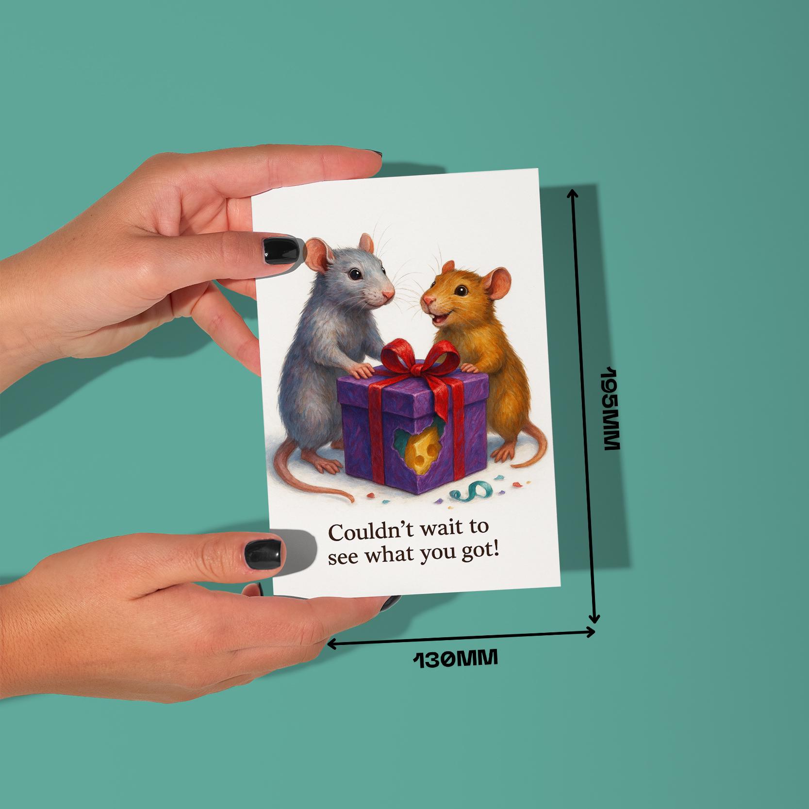 BLANK INTERIOR FOR A PERSONAL TOUCH: Our Rats collection - Two Happy Rats - What’s in the Box? Couldn't wait to see what you got - Happy Birthday Card and other whimsical designs feature a blank interior, giving you ample space to write a personal message from the heart. Perfect for any occasion, each card comes with a matching white envelope, making it easy to send your unique sentiments to loved ones