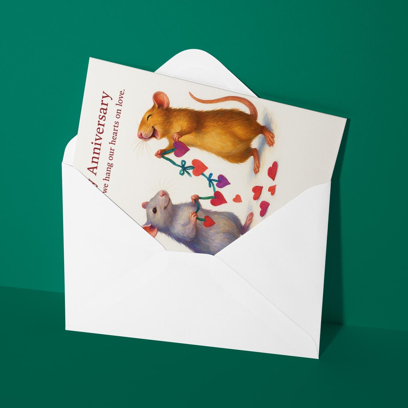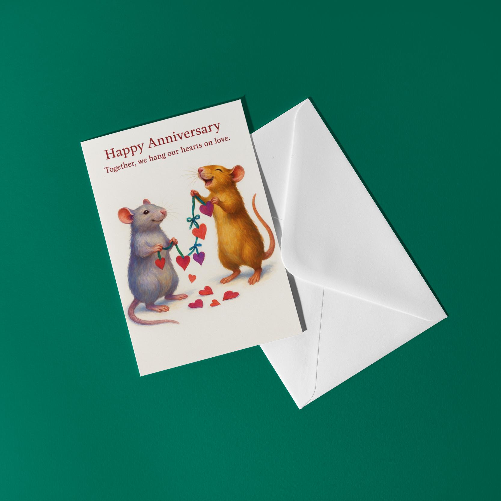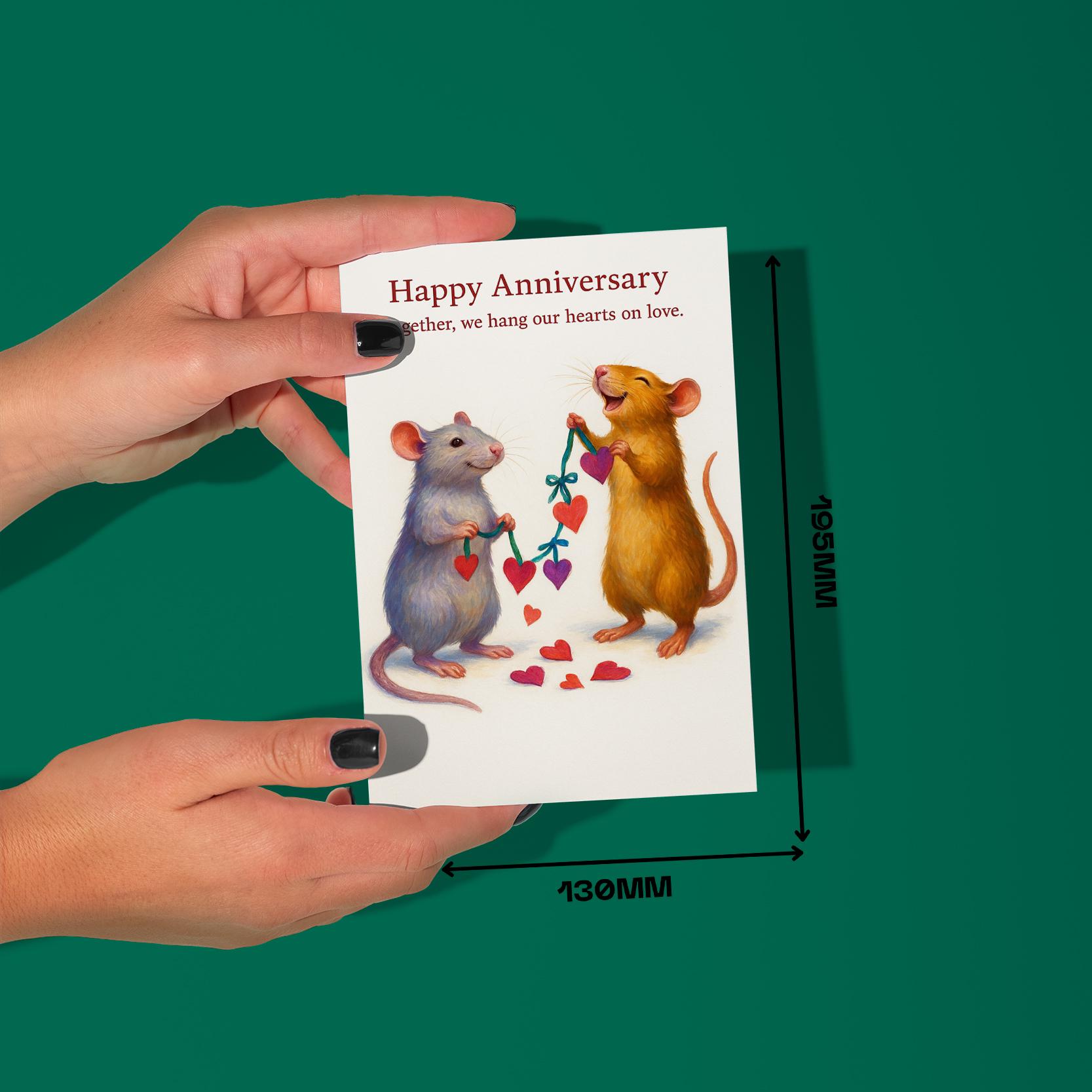 BLANK INTERIOR FOR A PERSONAL TOUCH: Our Rats collection - Two happy rats - Together, we hang our hearts on love. - Happy Anniversary Card and other whimsical designs feature a blank interior, giving you ample space to write a personal message from the heart. Perfect for any occasion, each card comes with a matching white envelope, making it easy to send your unique sentiments to loved ones