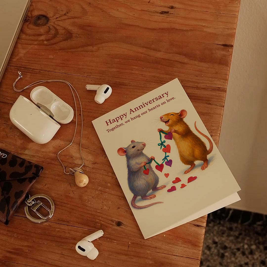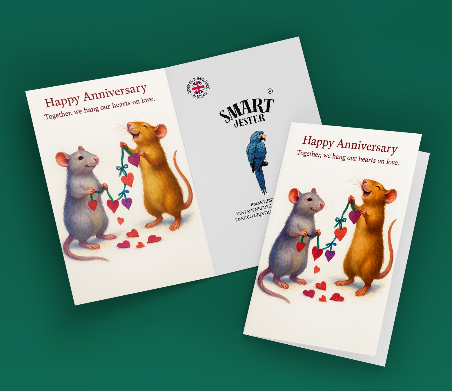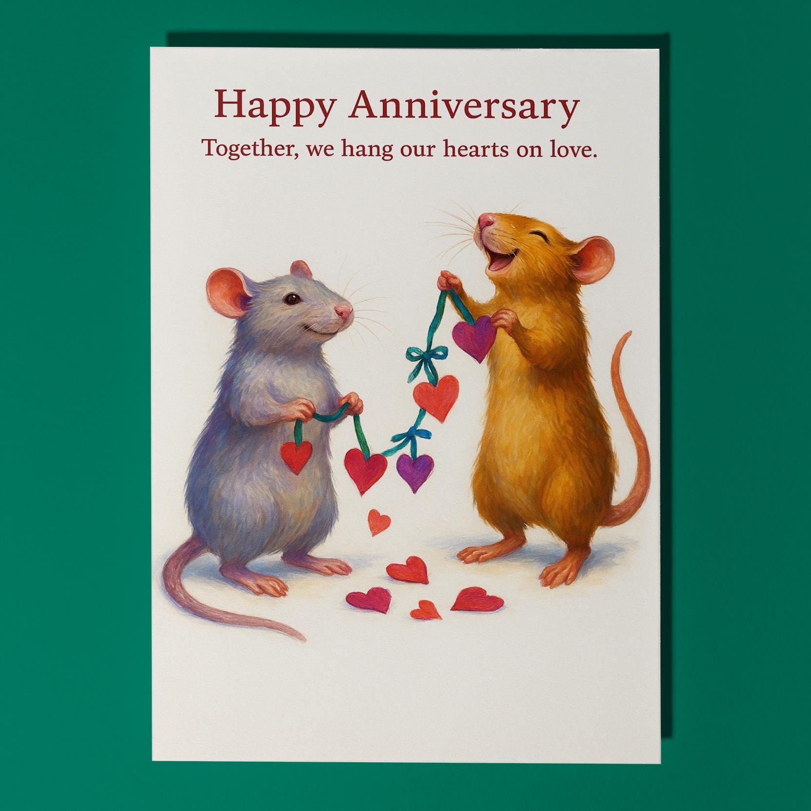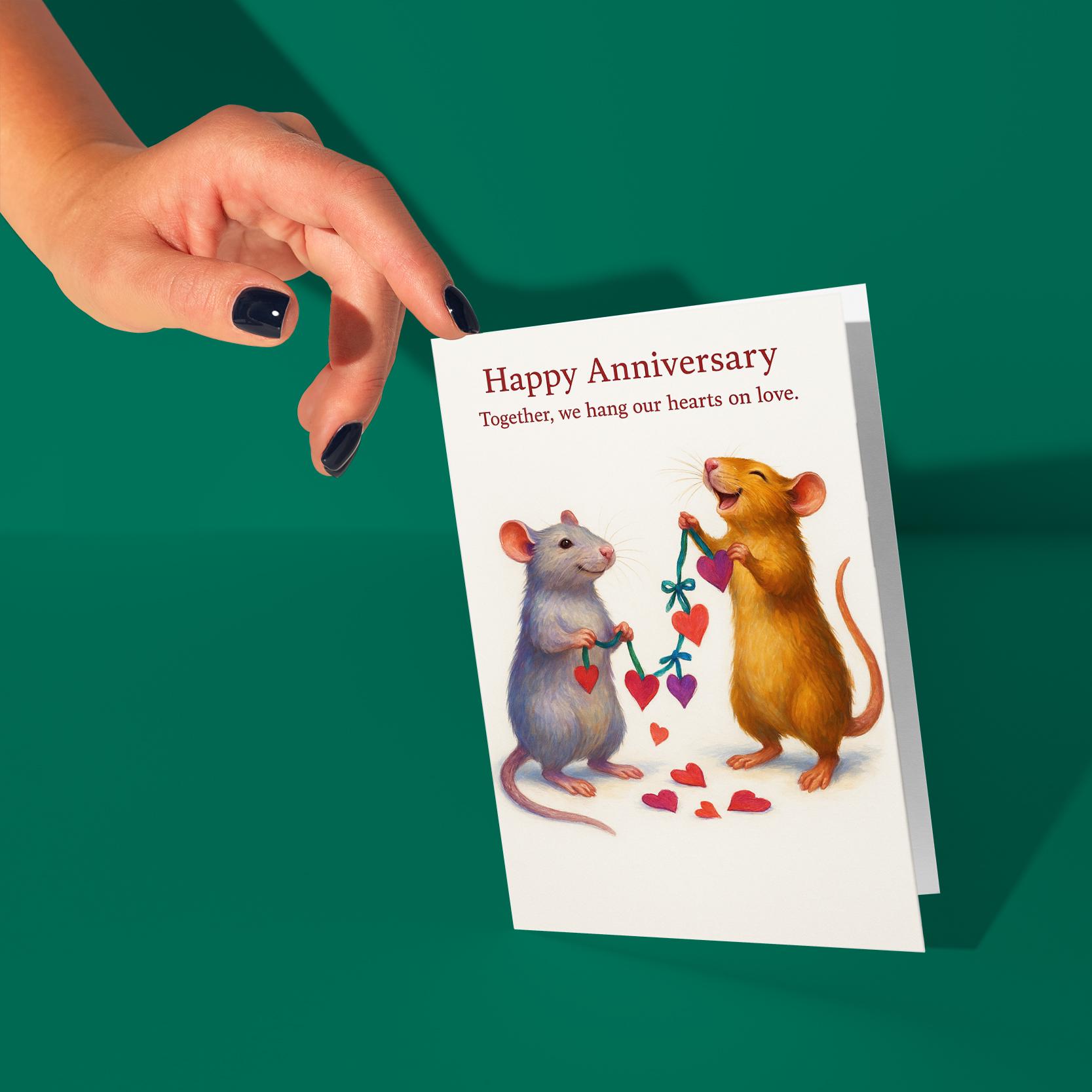 BLANK INTERIOR FOR A PERSONAL TOUCH: Our Rats collection - Two happy rats - Together, we hang our hearts on love. - Happy Anniversary Card and other whimsical designs feature a blank interior, giving you ample space to write a personal message from the heart. Perfect for any occasion, each card comes with a matching white envelope, making it easy to send your unique sentiments to loved ones
