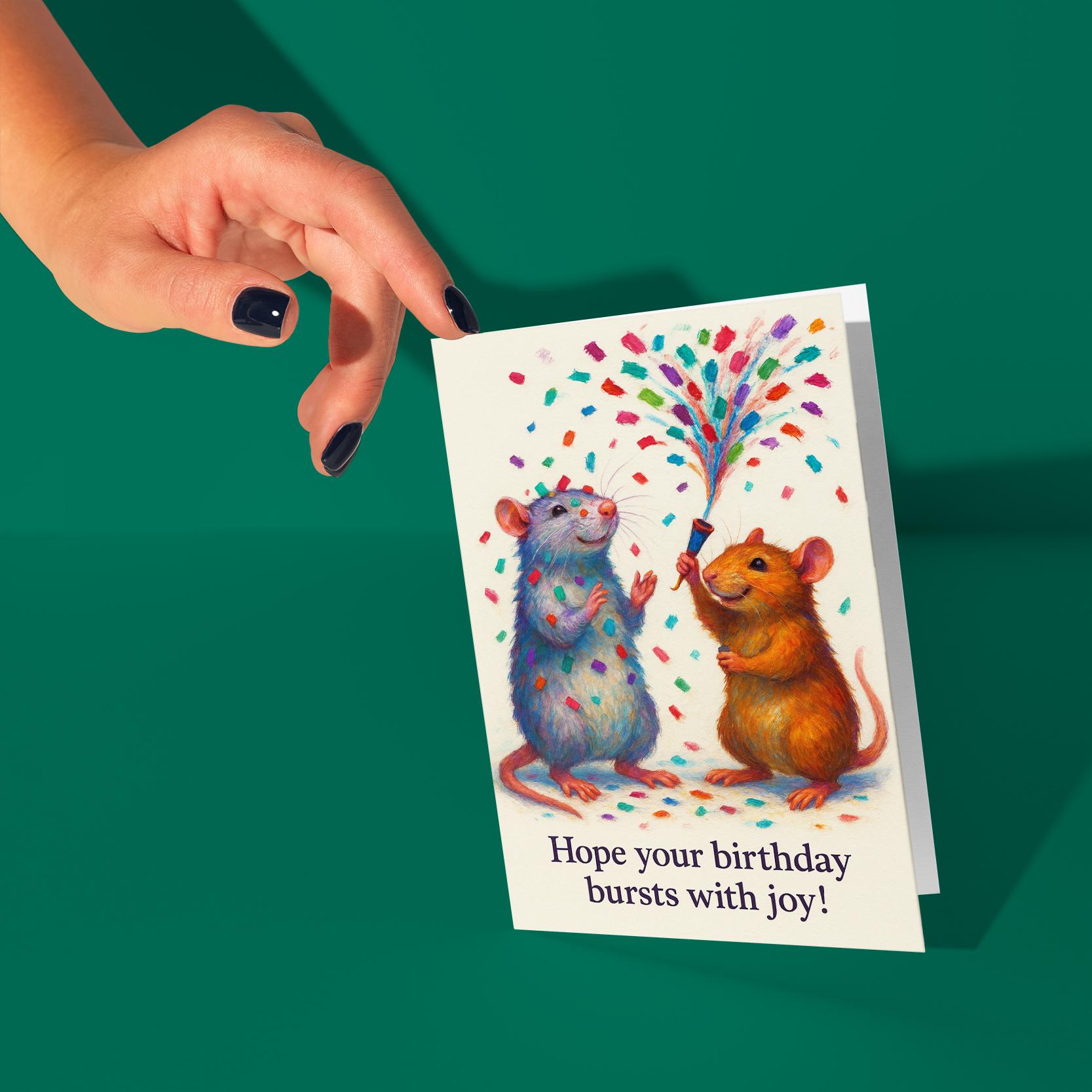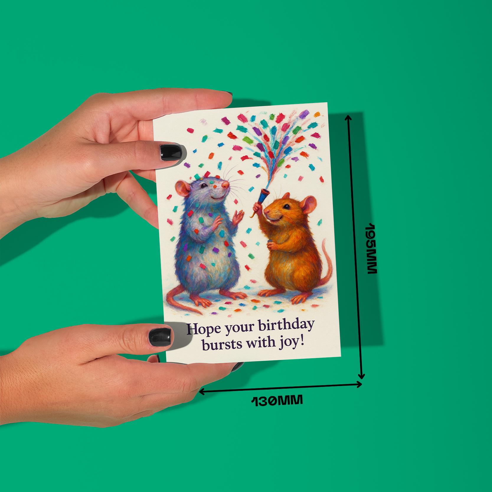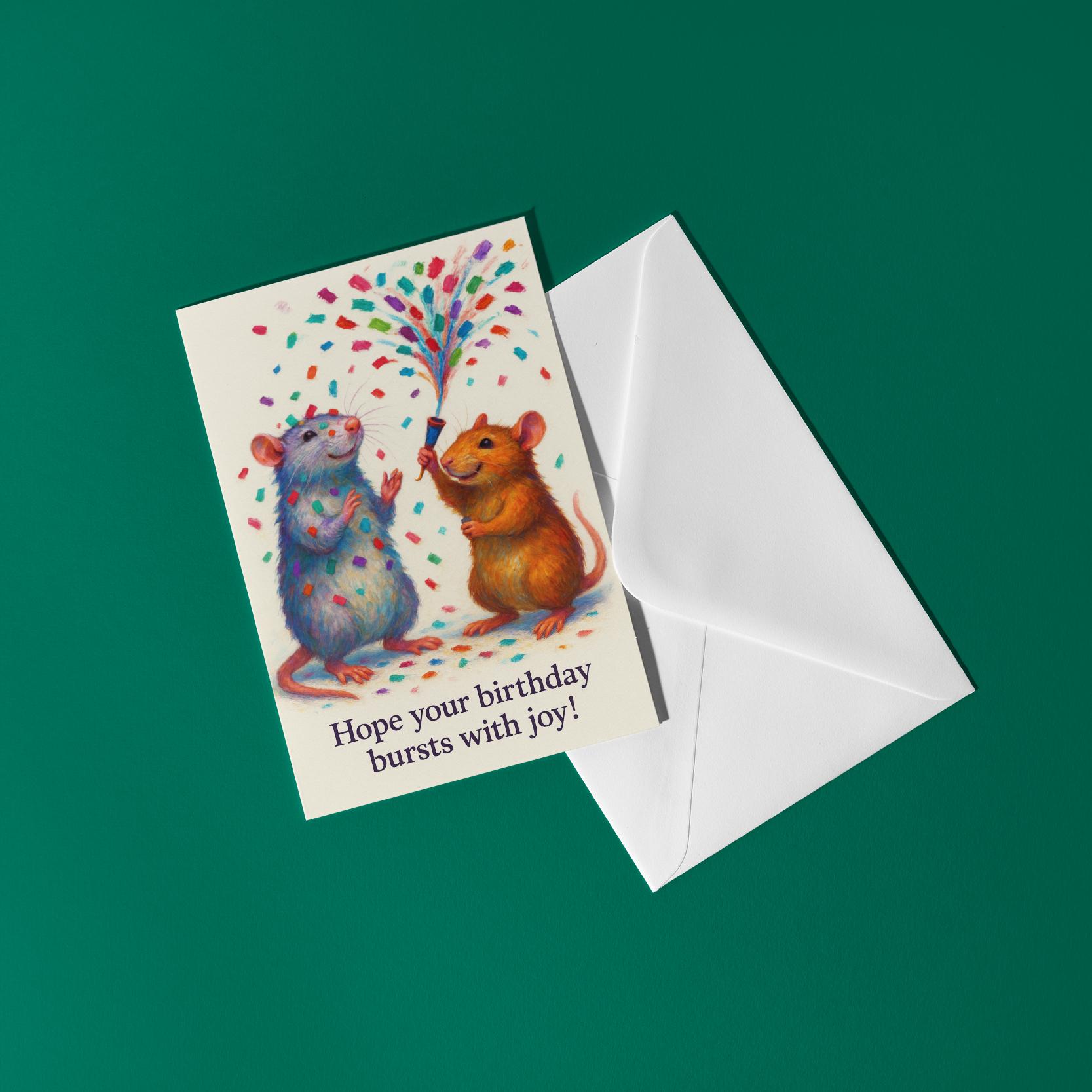 BLANK INTERIOR FOR A PERSONAL TOUCH: Our Rats collection - Two Happy Rats - Hope your birthday bursts with joy - Happy Birthday Card and other whimsical designs feature a blank interior, giving you ample space to write a personal message from the heart. Perfect for any occasion, each card comes with a matching white envelope, making it easy to send your unique sentiments to loved ones