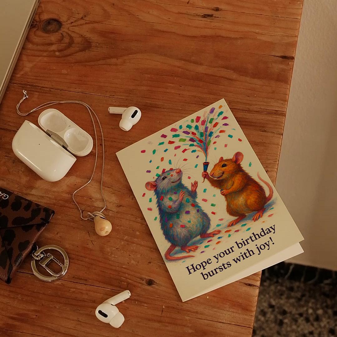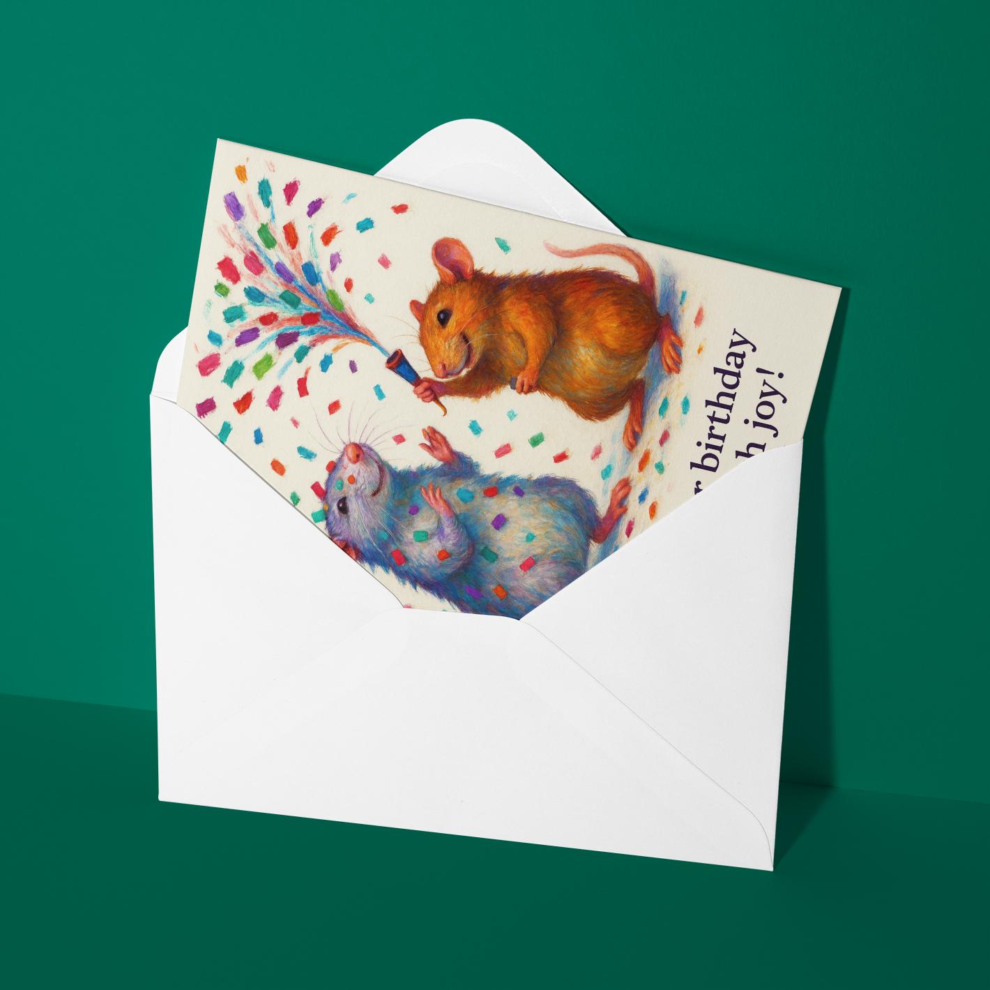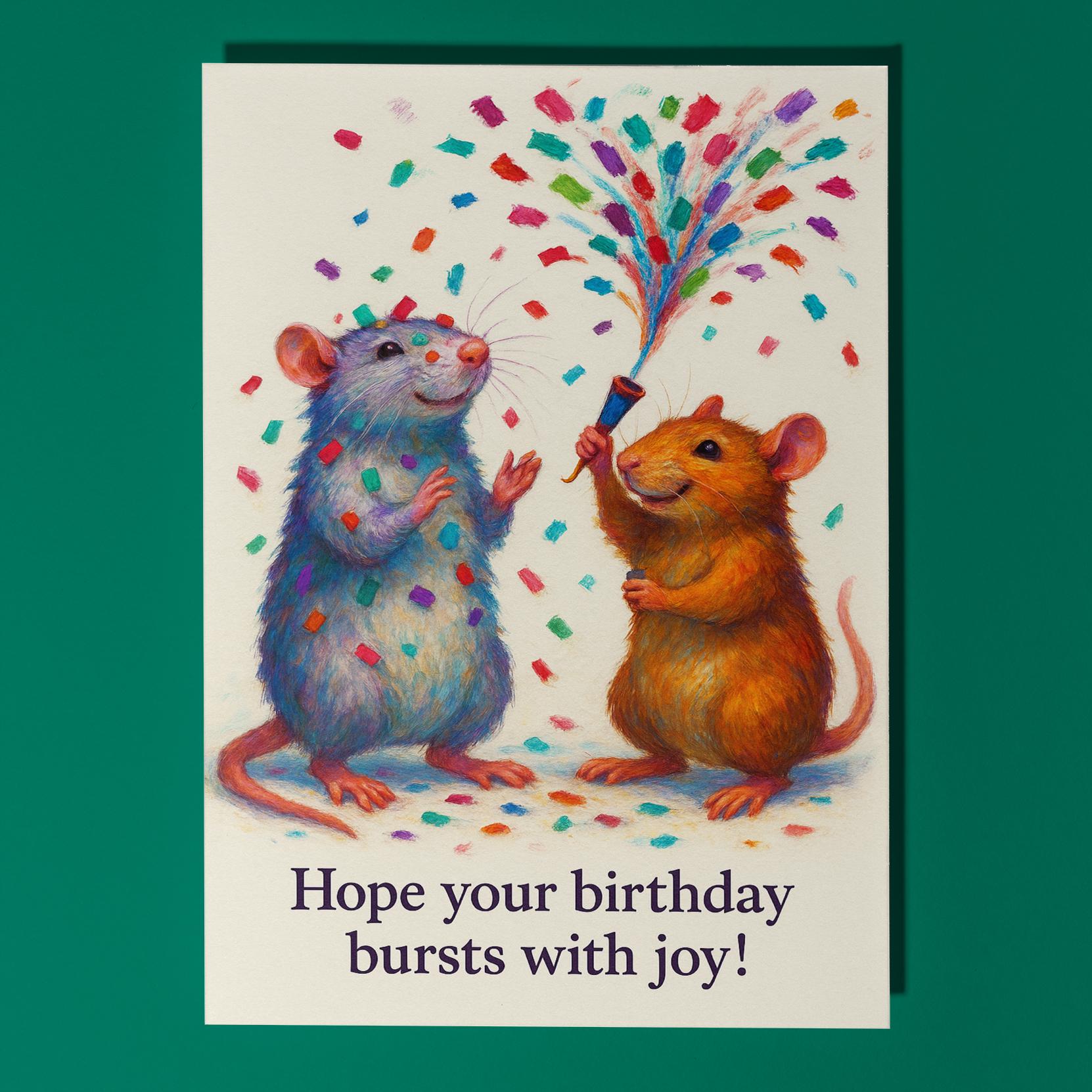 BLANK INTERIOR FOR A PERSONAL TOUCH: Our Rats collection - Two Happy Rats - Hope your birthday bursts with joy - Happy Birthday Card and other whimsical designs feature a blank interior, giving you ample space to write a personal message from the heart. Perfect for any occasion, each card comes with a matching white envelope, making it easy to send your unique sentiments to loved ones