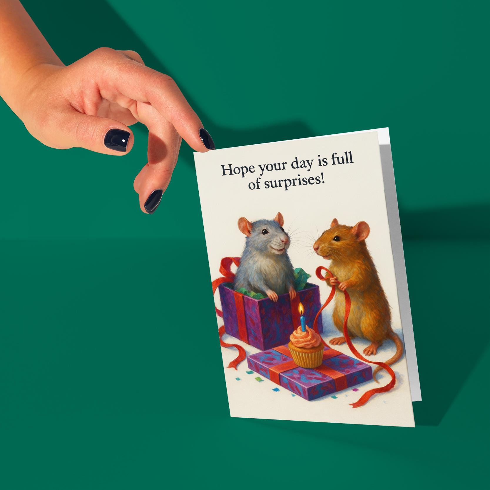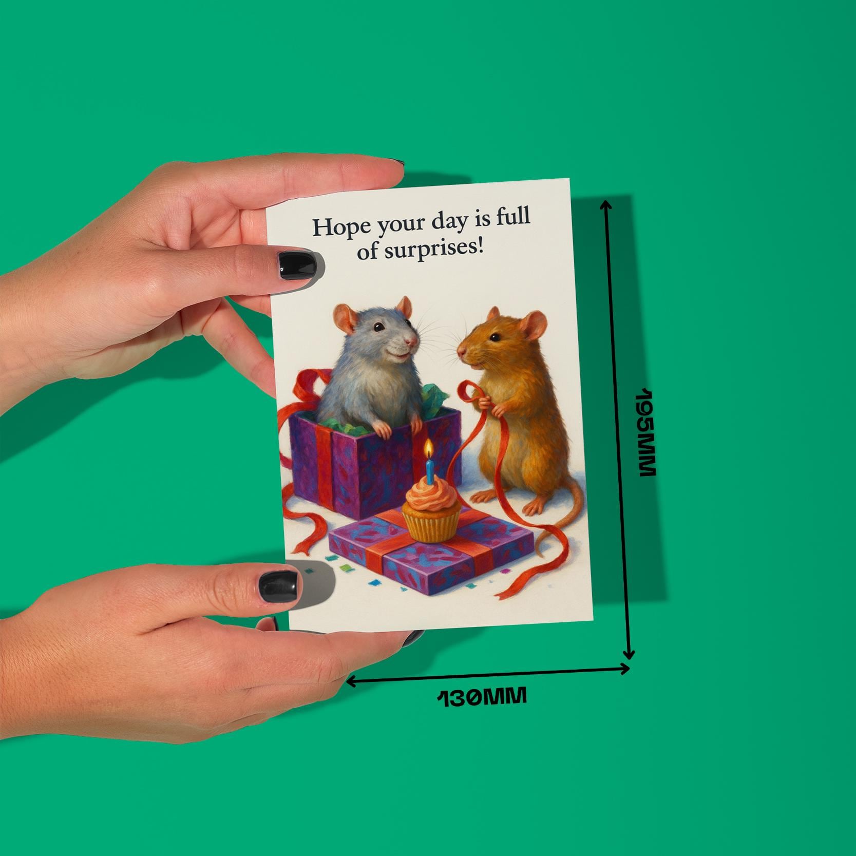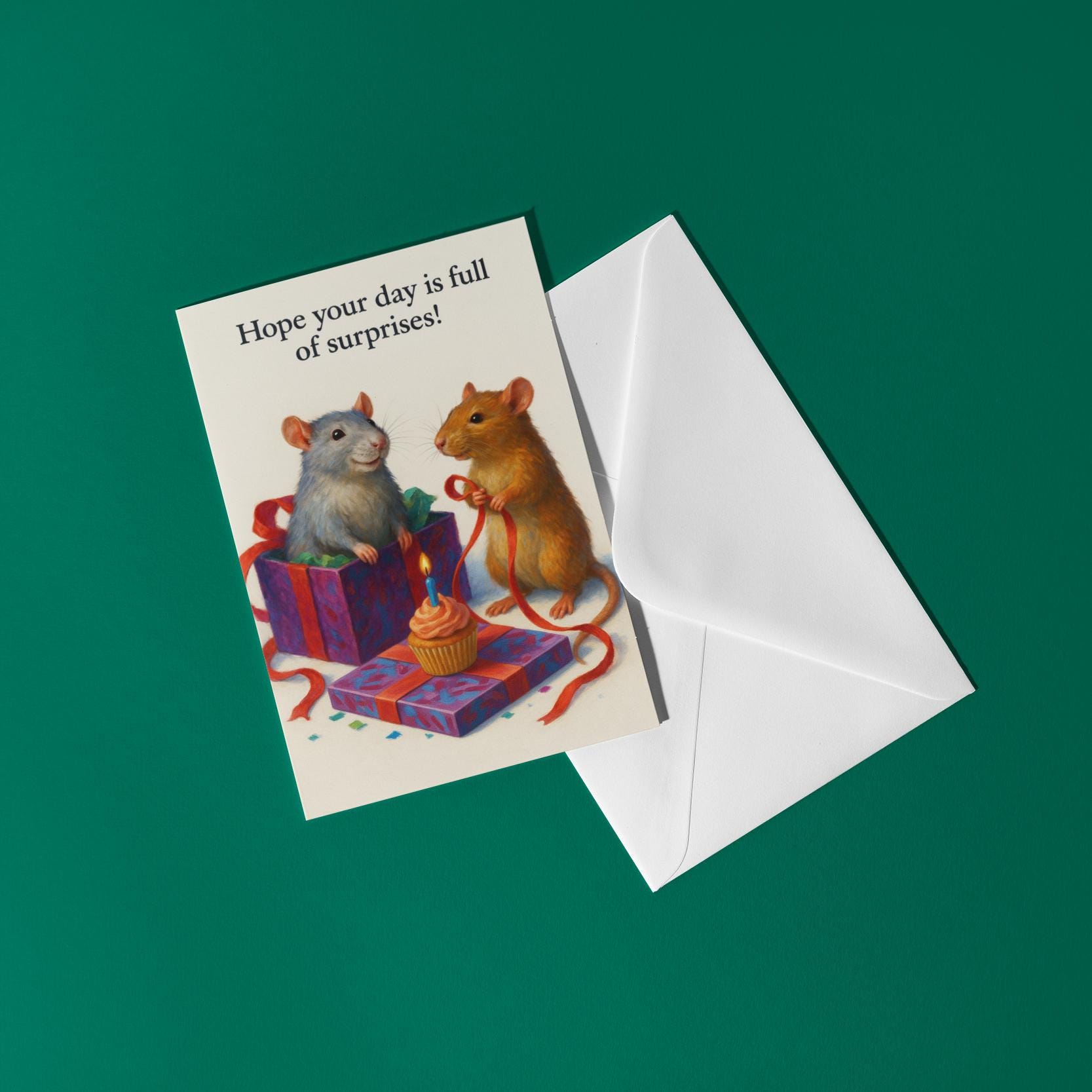 BLANK INTERIOR FOR A PERSONAL TOUCH: Our Rats collection - Two Happy Rats - Hope your day is full of surprises! - Happy Birthday Card and other whimsical designs feature a blank interior, giving you ample space to write a personal message from the heart. Perfect for any occasion, each card comes with a matching white envelope, making it easy to send your unique sentiments to loved ones