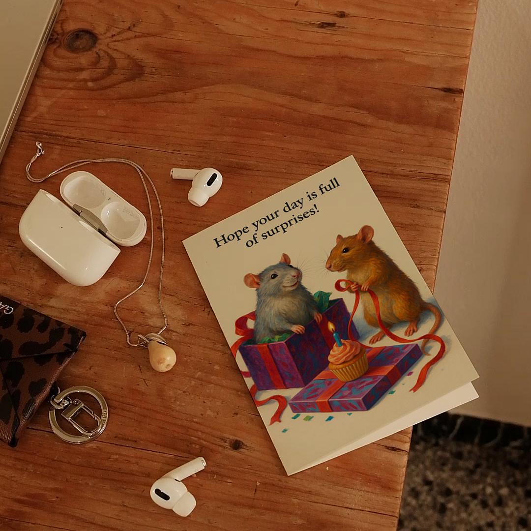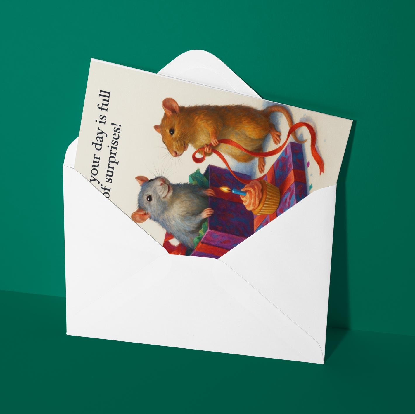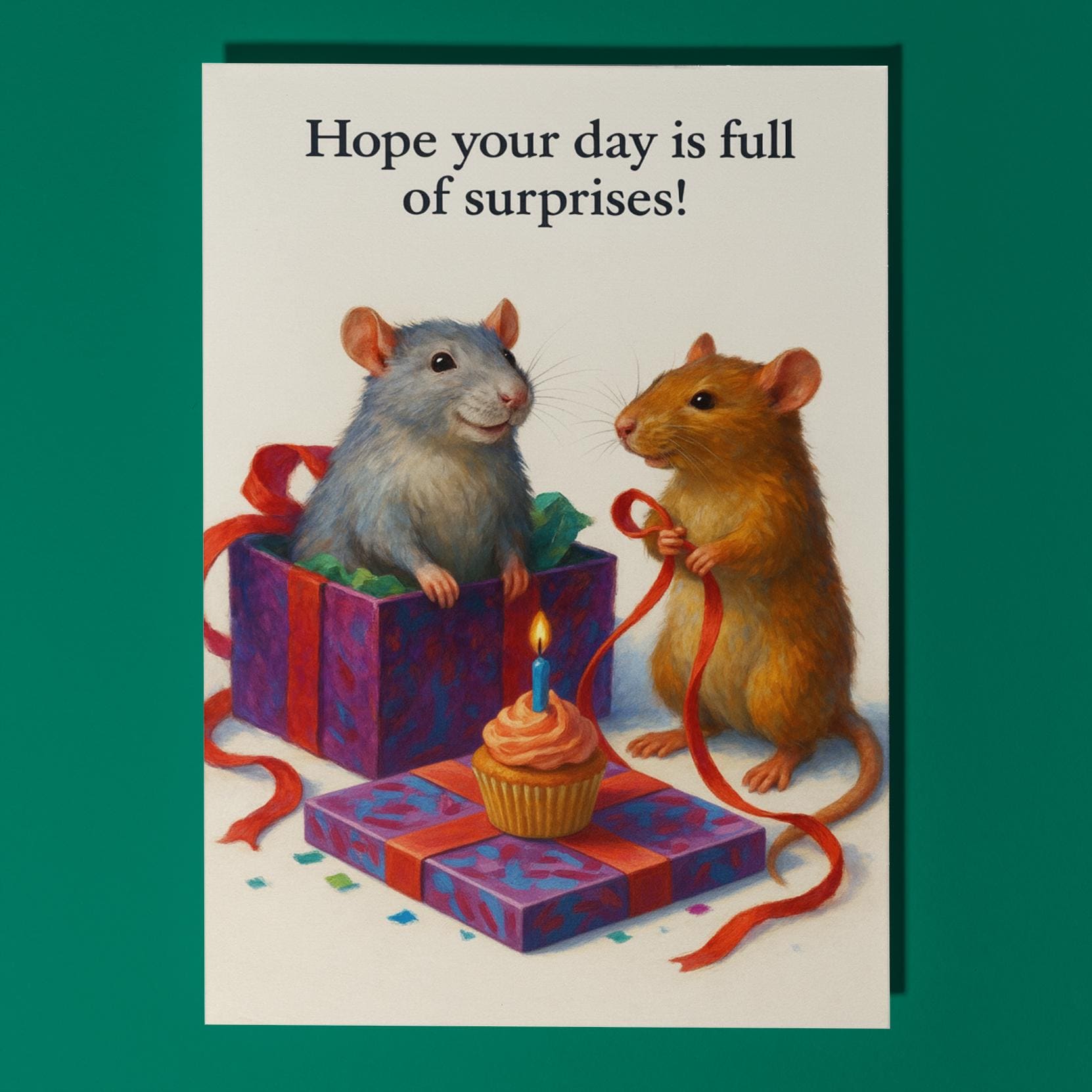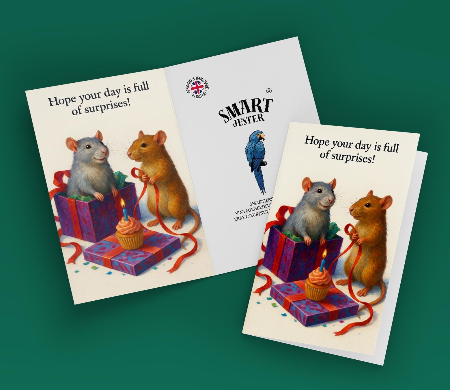 BLANK INTERIOR FOR A PERSONAL TOUCH: Our Rats collection - Two Happy Rats - Hope your day is full of surprises! - Happy Birthday Card and other whimsical designs feature a blank interior, giving you ample space to write a personal message from the heart. Perfect for any occasion, each card comes with a matching white envelope, making it easy to send your unique sentiments to loved ones