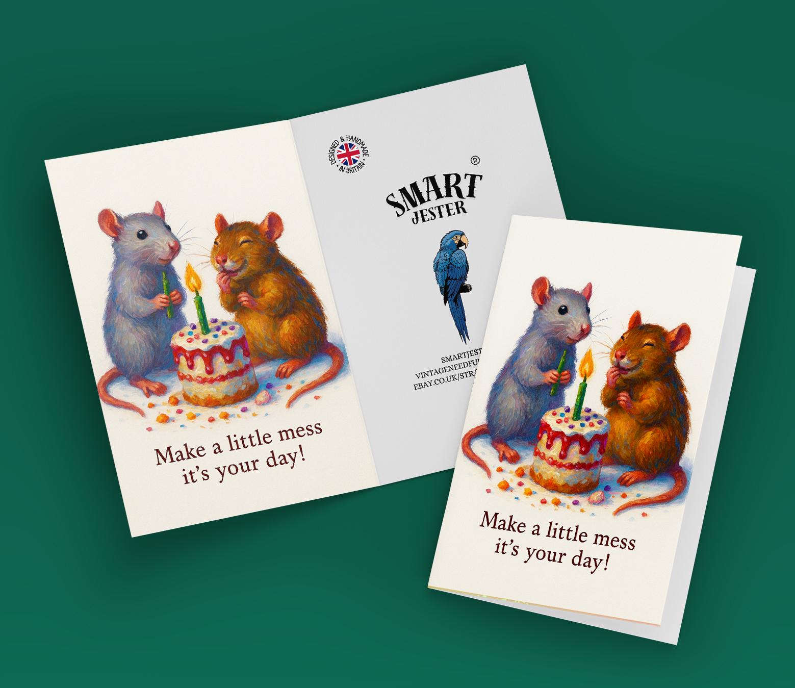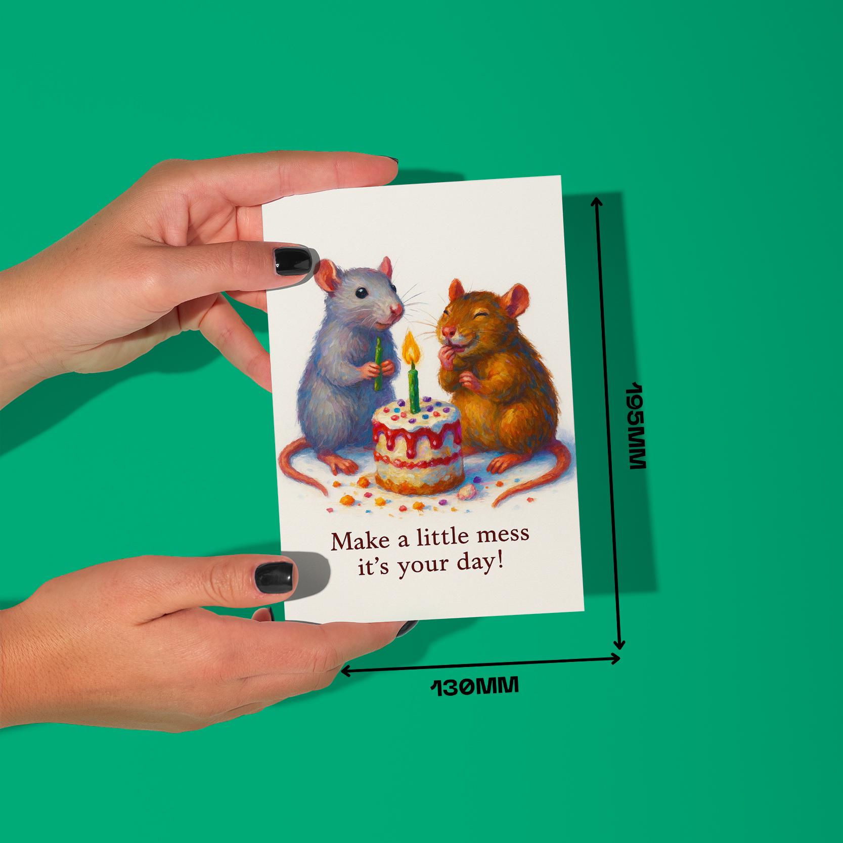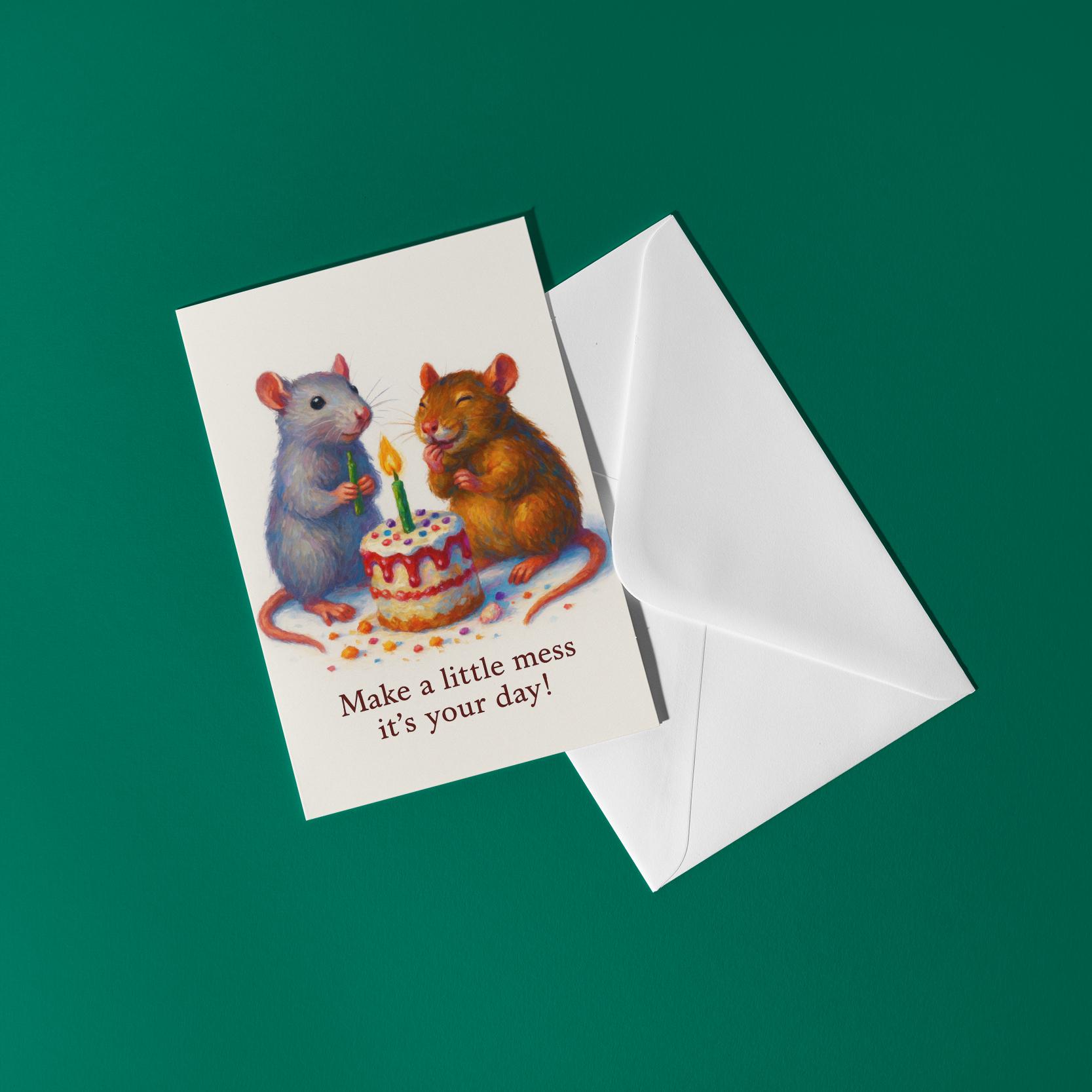 BLANK INTERIOR FOR A PERSONAL TOUCH: Our Rats collection - Two Happy Rats - Make a little mess it's your day! - Happy Birthday Card and other whimsical designs feature a blank interior, giving you ample space to write a personal message from the heart. Perfect for any occasion, each card comes with a matching white envelope, making it easy to send your unique sentiments to loved ones
