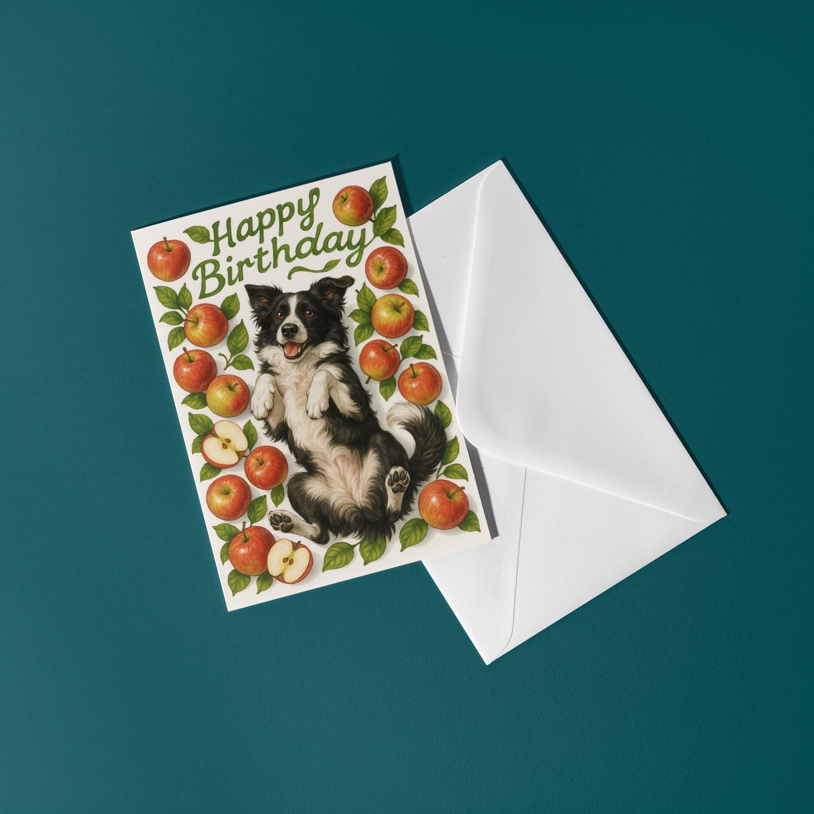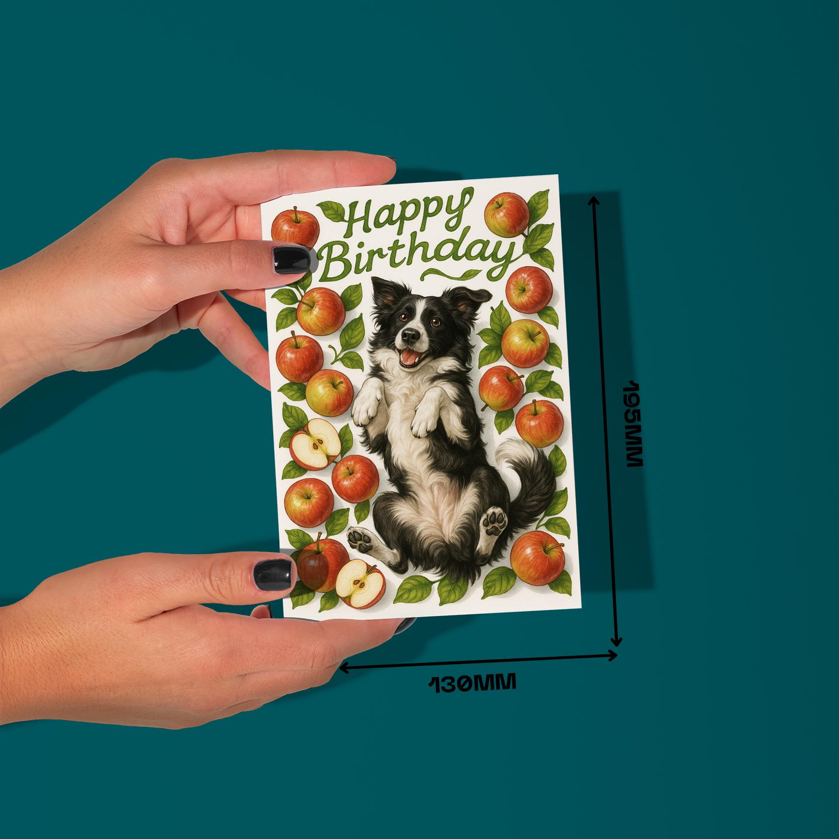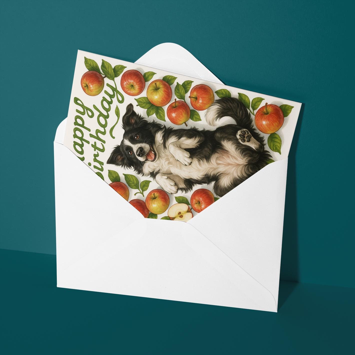 BLANK INTERIOR FOR A PERSONAL TOUCH: Our Fruity Friends Collection – Apple Border Collie - Happy Birthday! card and other whimsical designs feature a blank interior, giving you ample space to write a personal message from the heart. Perfect for any occasion, each card comes with a matching white envelope, making it easy to send your unique sentiments to loved ones.