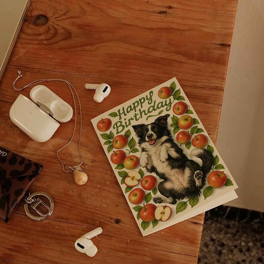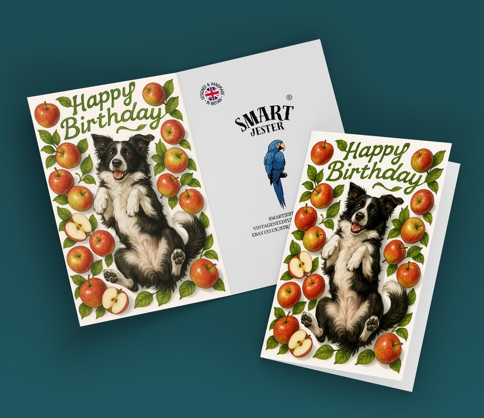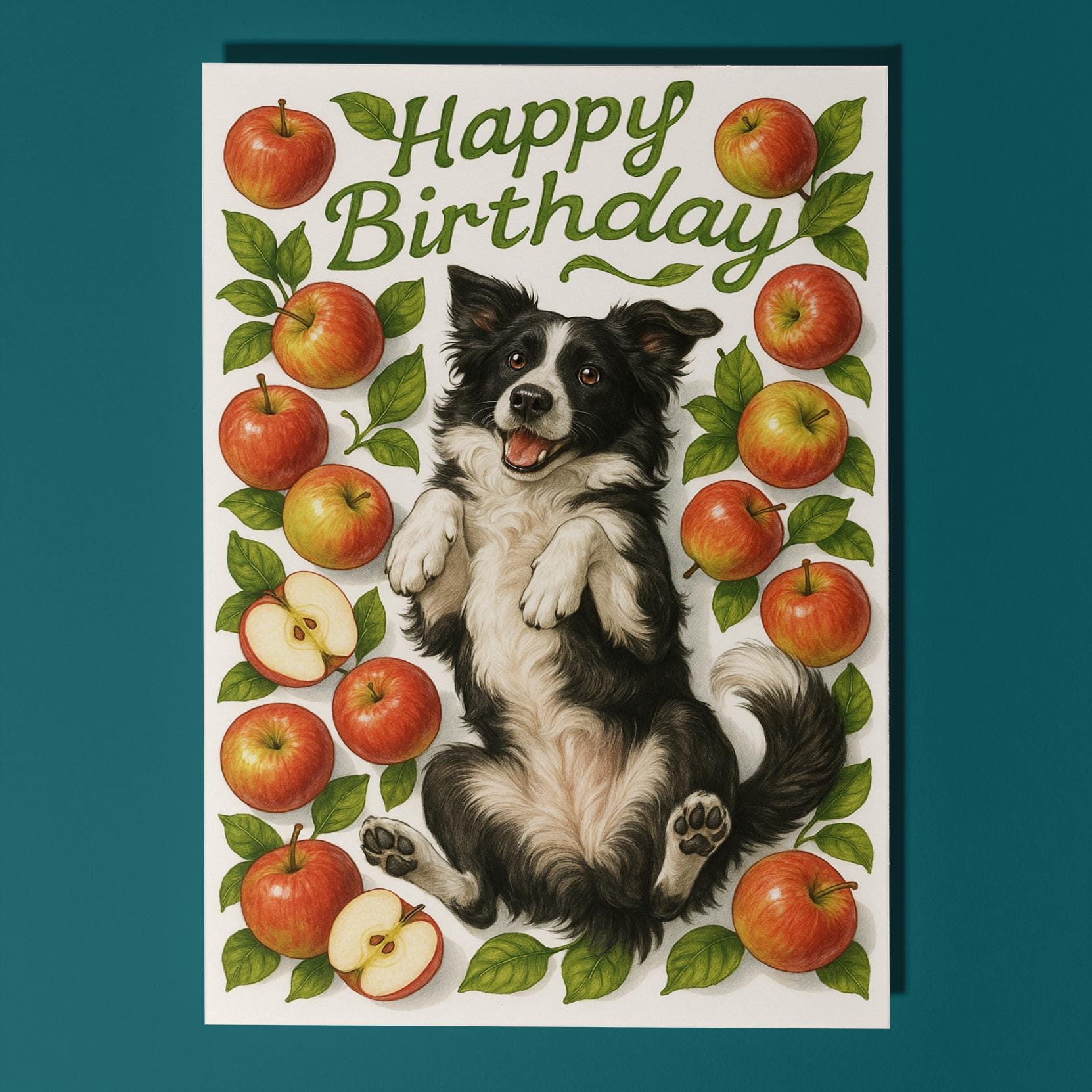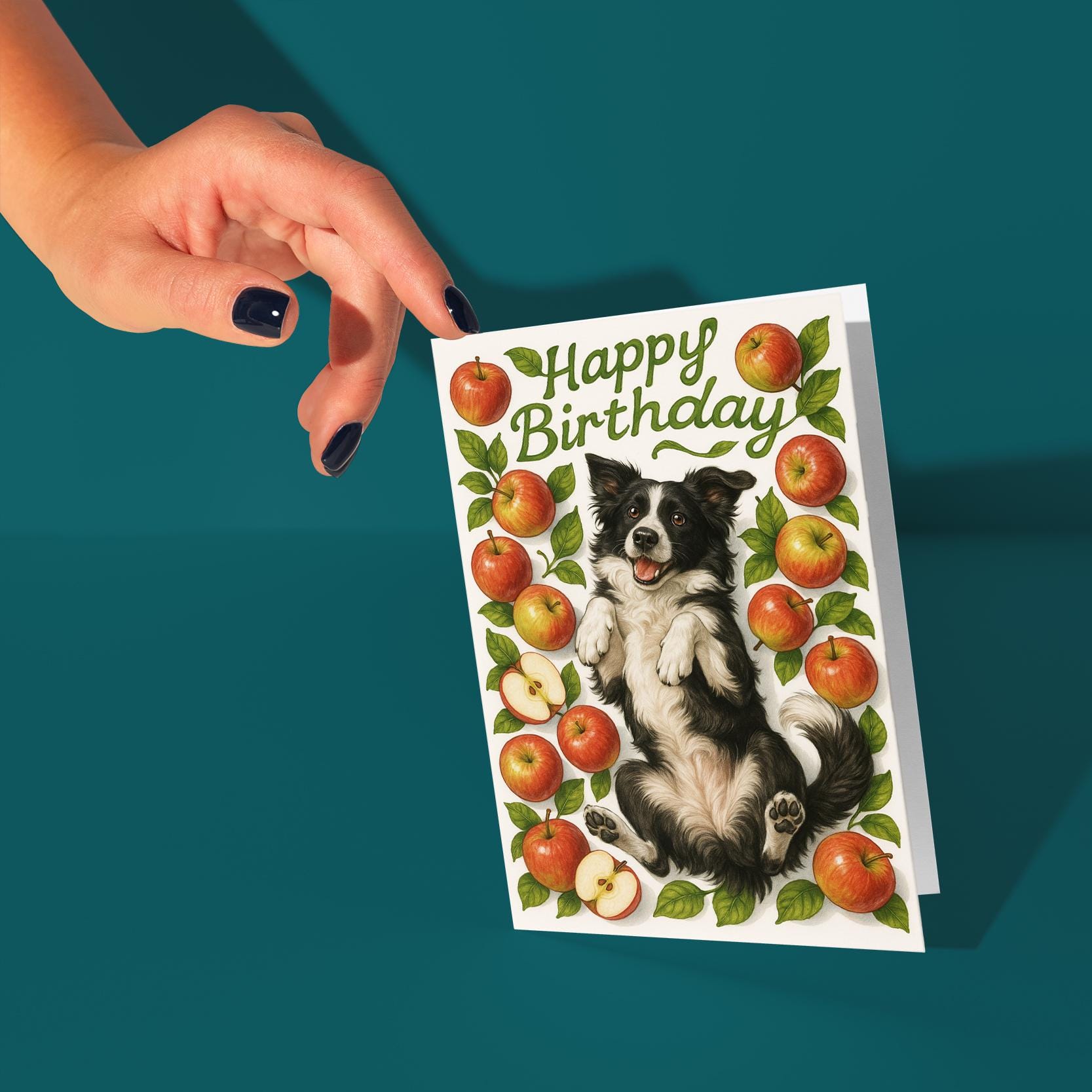 BLANK INTERIOR FOR A PERSONAL TOUCH: Our Fruity Friends Collection – Apple Border Collie - Happy Birthday! card and other whimsical designs feature a blank interior, giving you ample space to write a personal message from the heart. Perfect for any occasion, each card comes with a matching white envelope, making it easy to send your unique sentiments to loved ones.