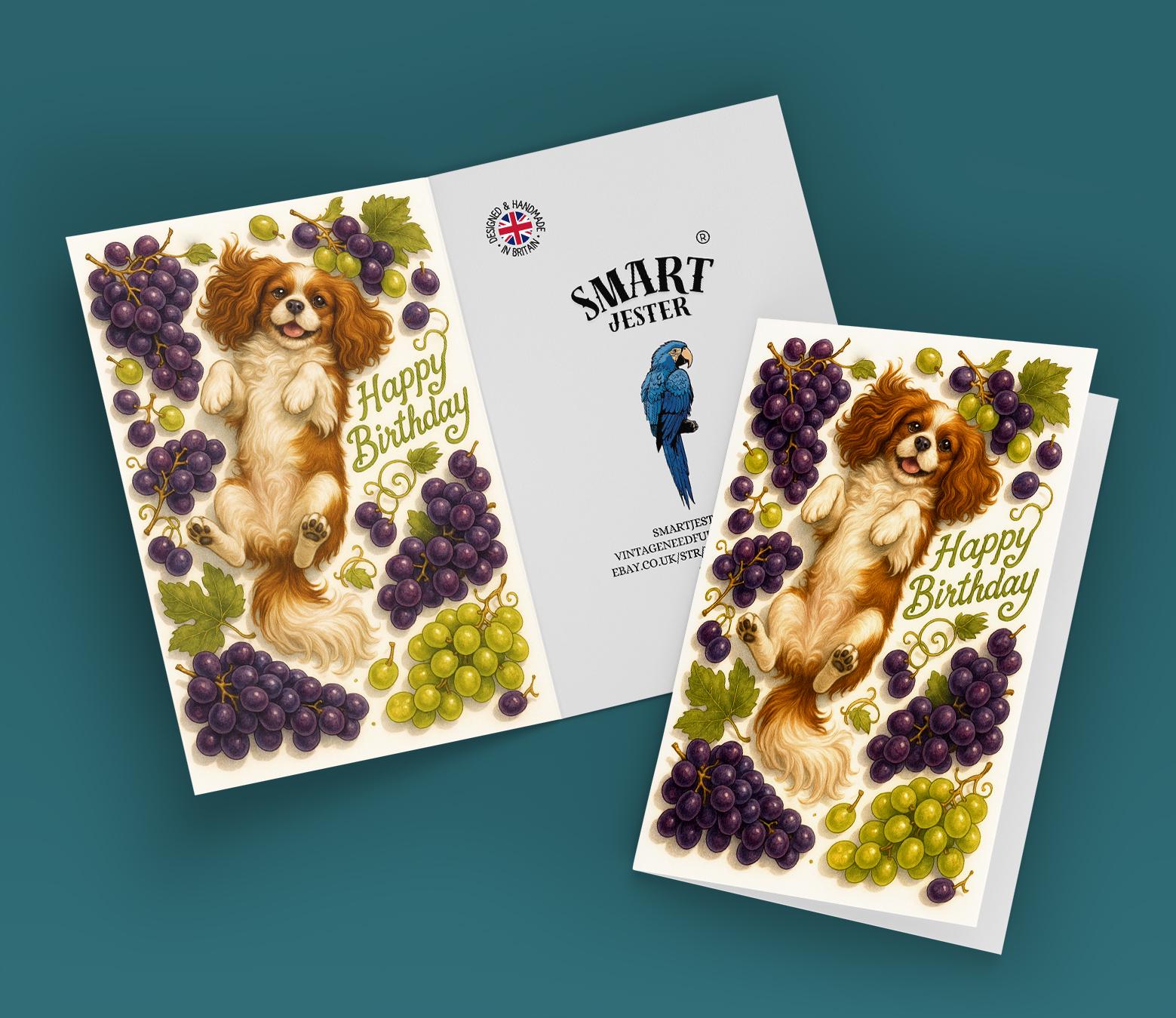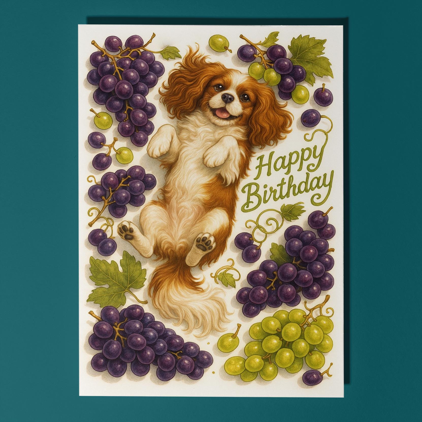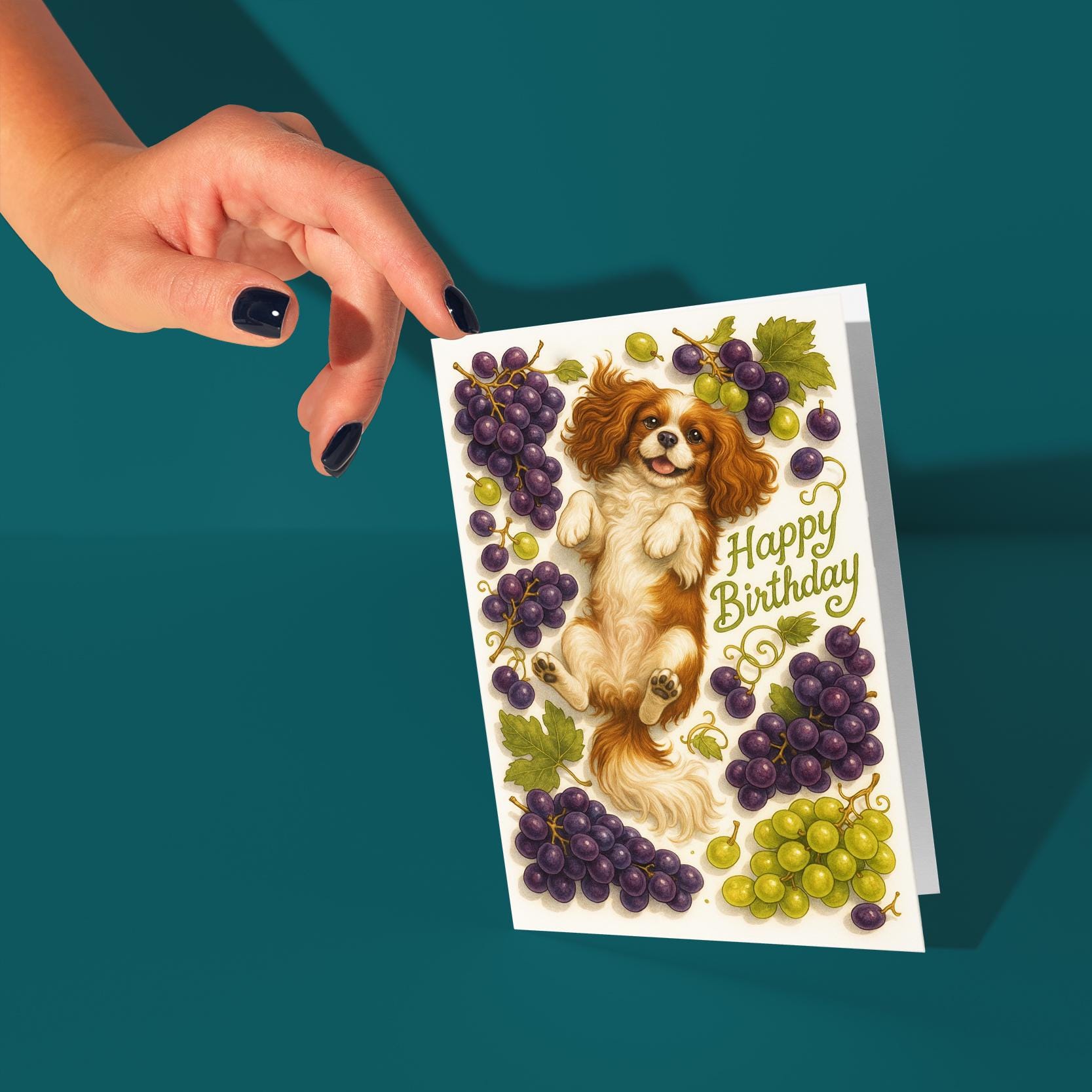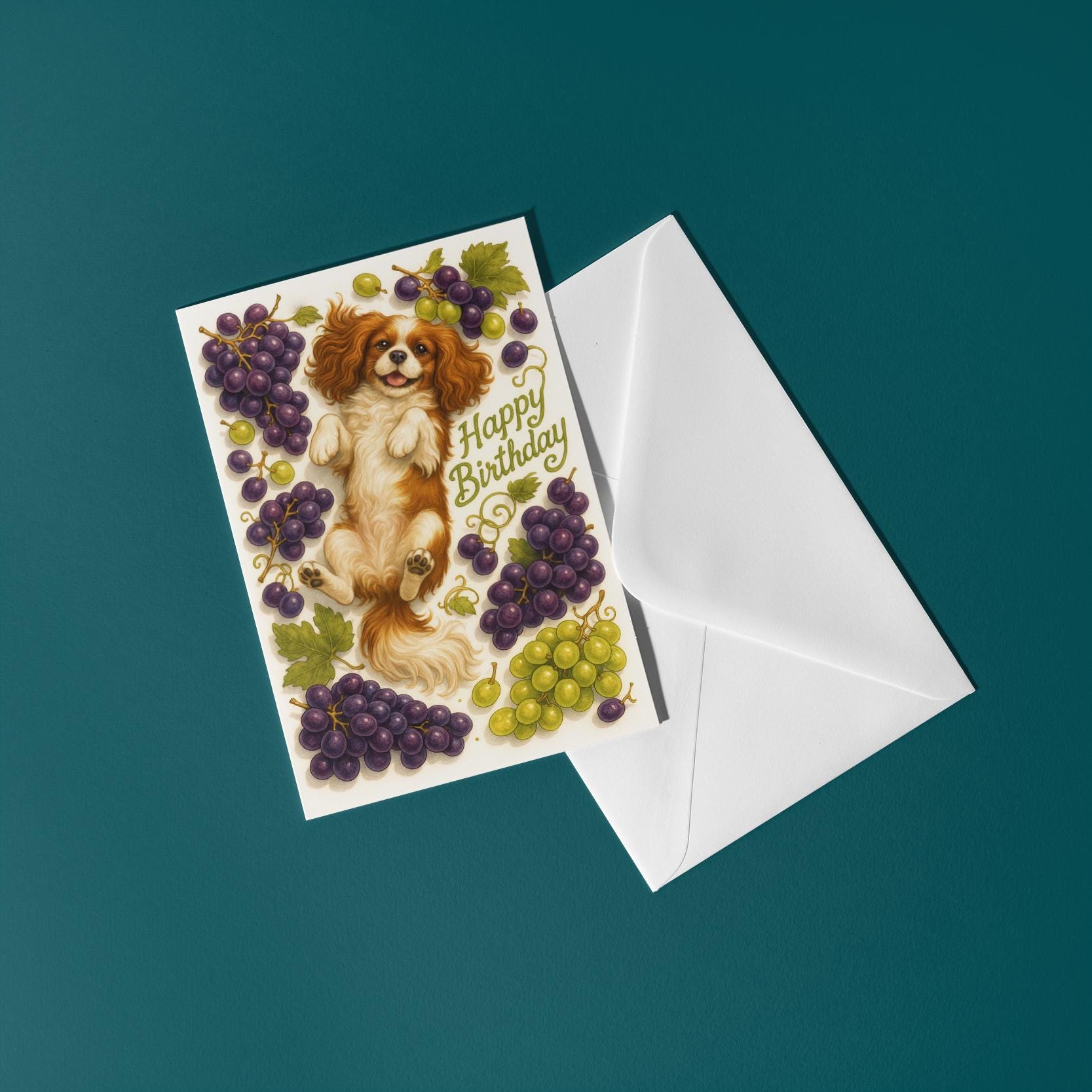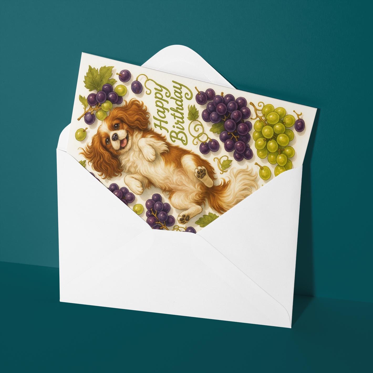 BLANK INTERIOR FOR A PERSONAL TOUCH: Our Fruity Friends Collection – Grape Cavalier King Charles Spaniel 🍇🐶 dog - Happy Birthday! card and other whimsical designs feature a blank interior, giving you ample space to write a personal message from the heart. Perfect for any occasion, each card comes with a matching white envelope, making it easy to send your unique sentiments to loved ones.