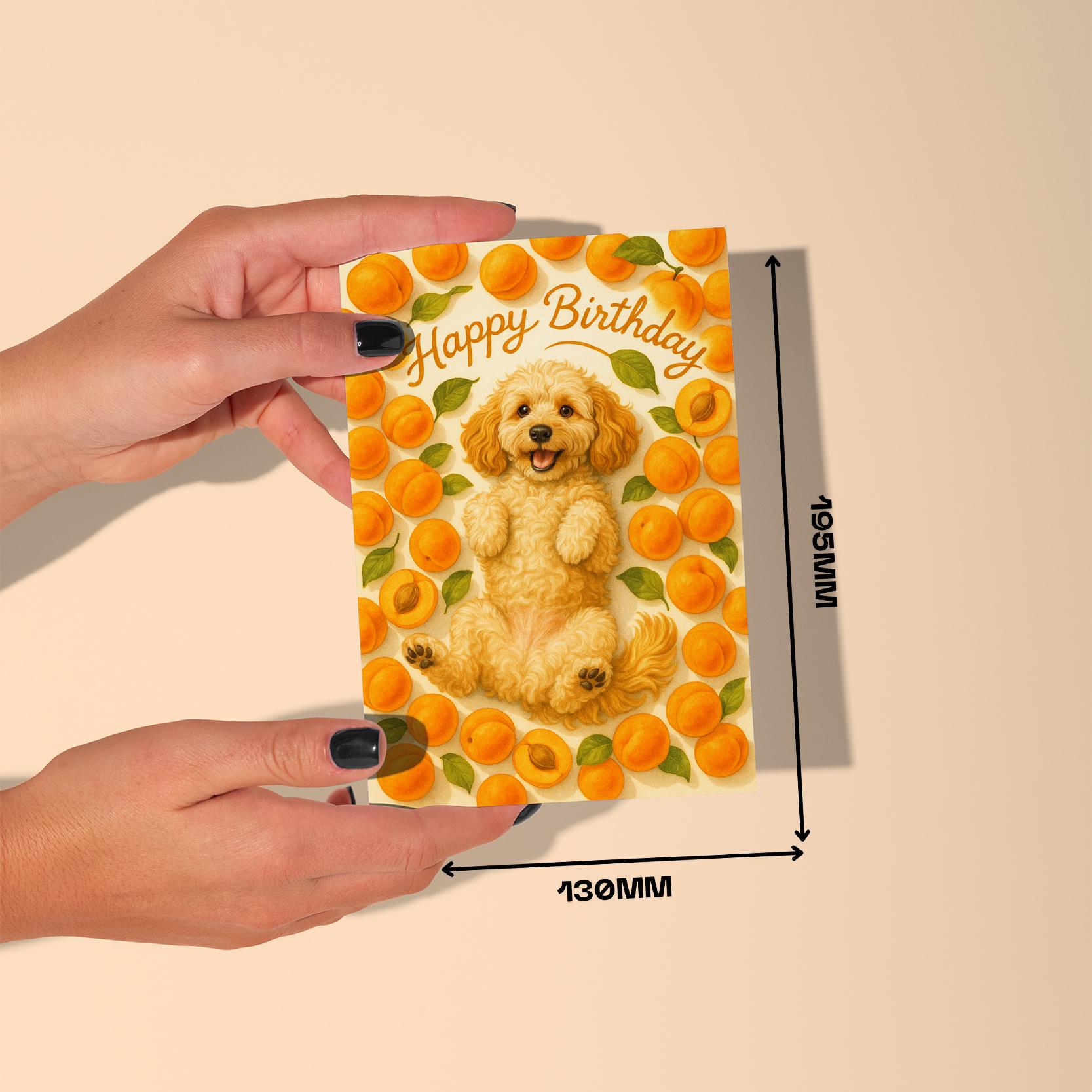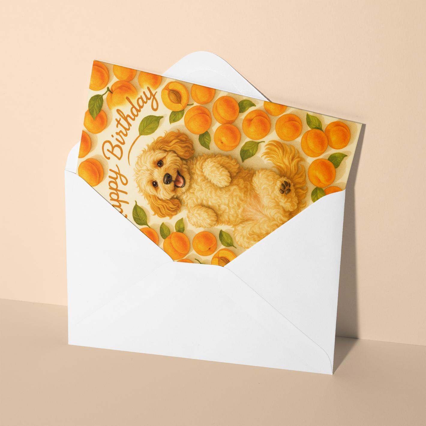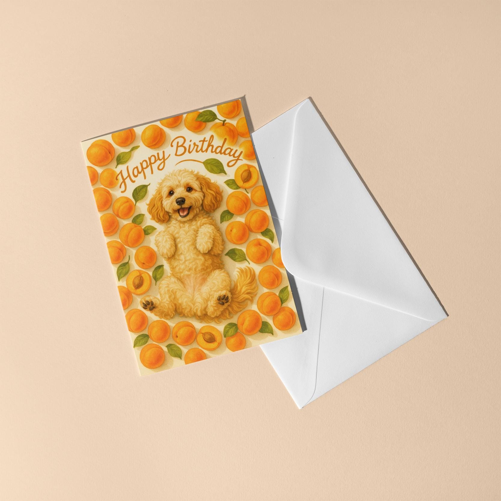 BLANK INTERIOR FOR A PERSONAL TOUCH: Our Fruity Friends Collection – Sweet Apricot Cockapoo 🍑✨ dog - Happy Birthday! card and other whimsical designs feature a blank interior, giving you ample space to write a personal message from the heart. Perfect for any occasion, each card comes with a matching white envelope, making it easy to send your unique sentiments to loved ones.