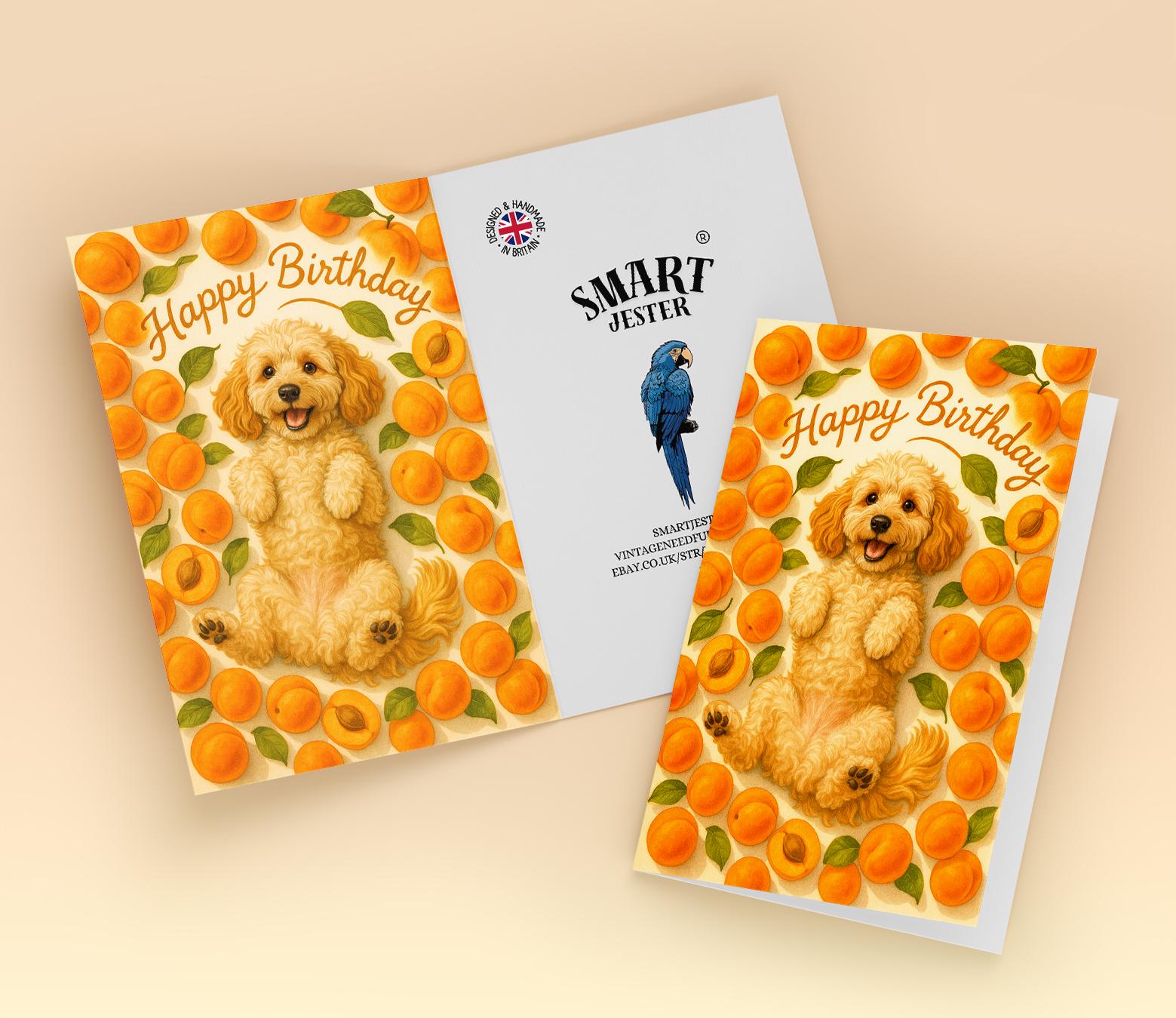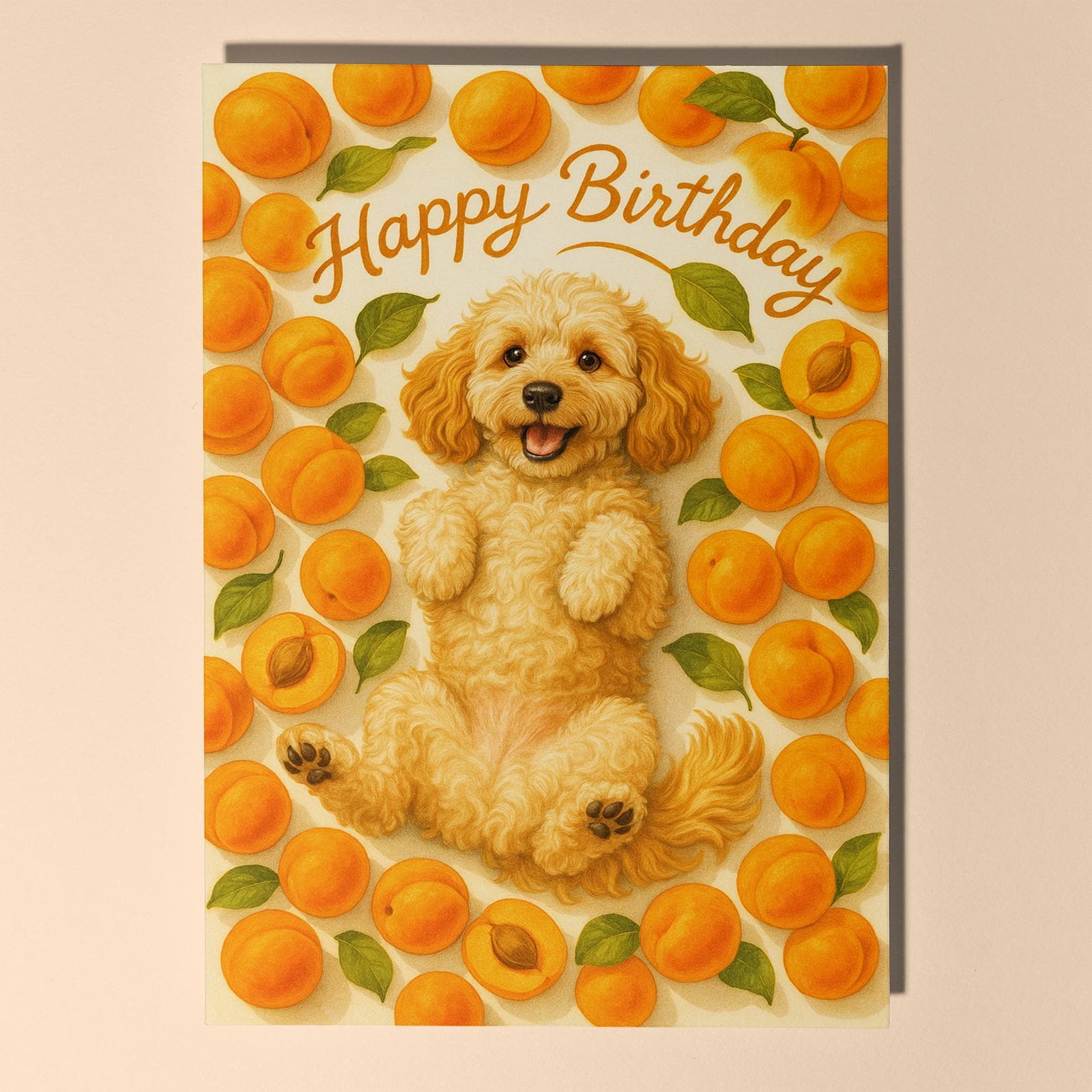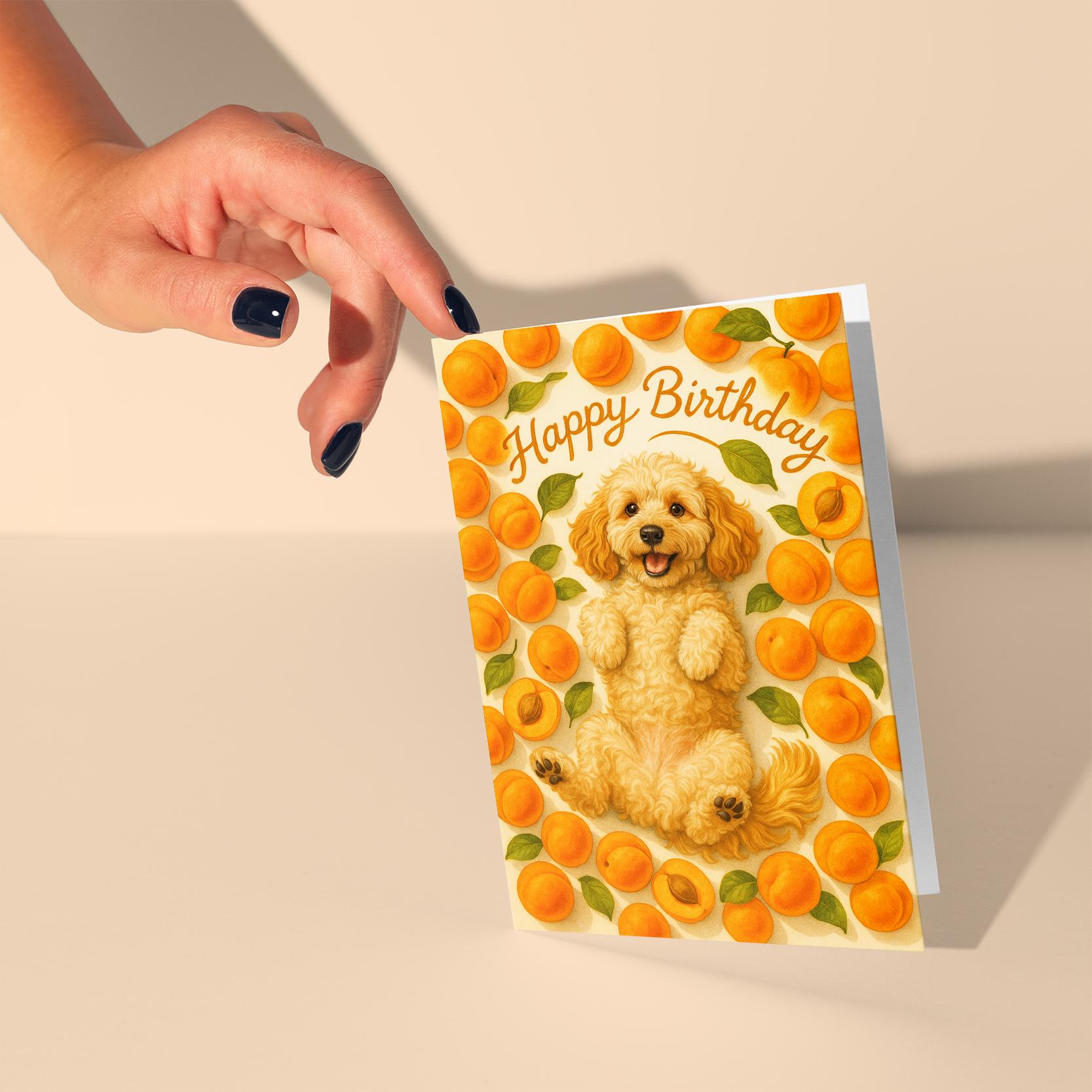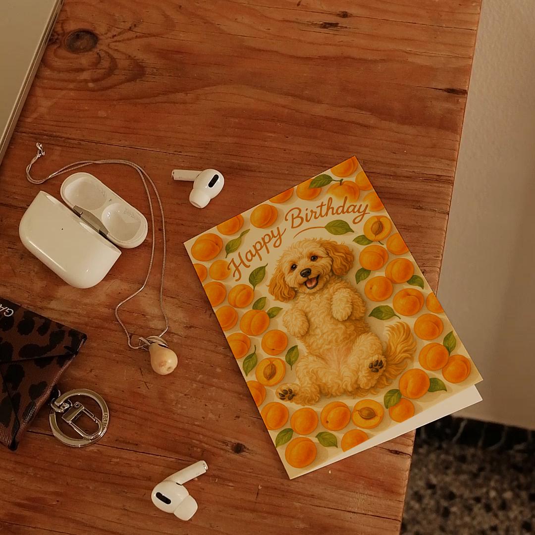 BLANK INTERIOR FOR A PERSONAL TOUCH: Our Fruity Friends Collection – Sweet Apricot Cockapoo 🍑✨ dog - Happy Birthday! card and other whimsical designs feature a blank interior, giving you ample space to write a personal message from the heart. Perfect for any occasion, each card comes with a matching white envelope, making it easy to send your unique sentiments to loved ones.