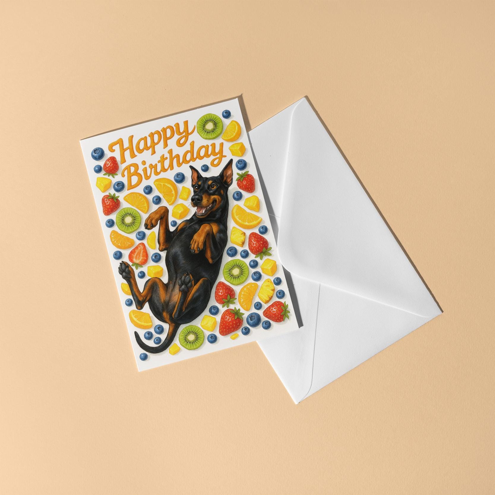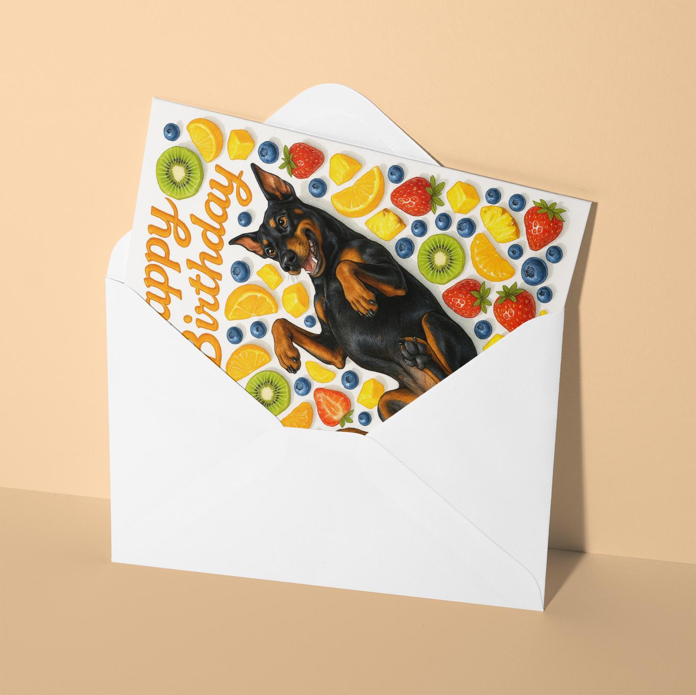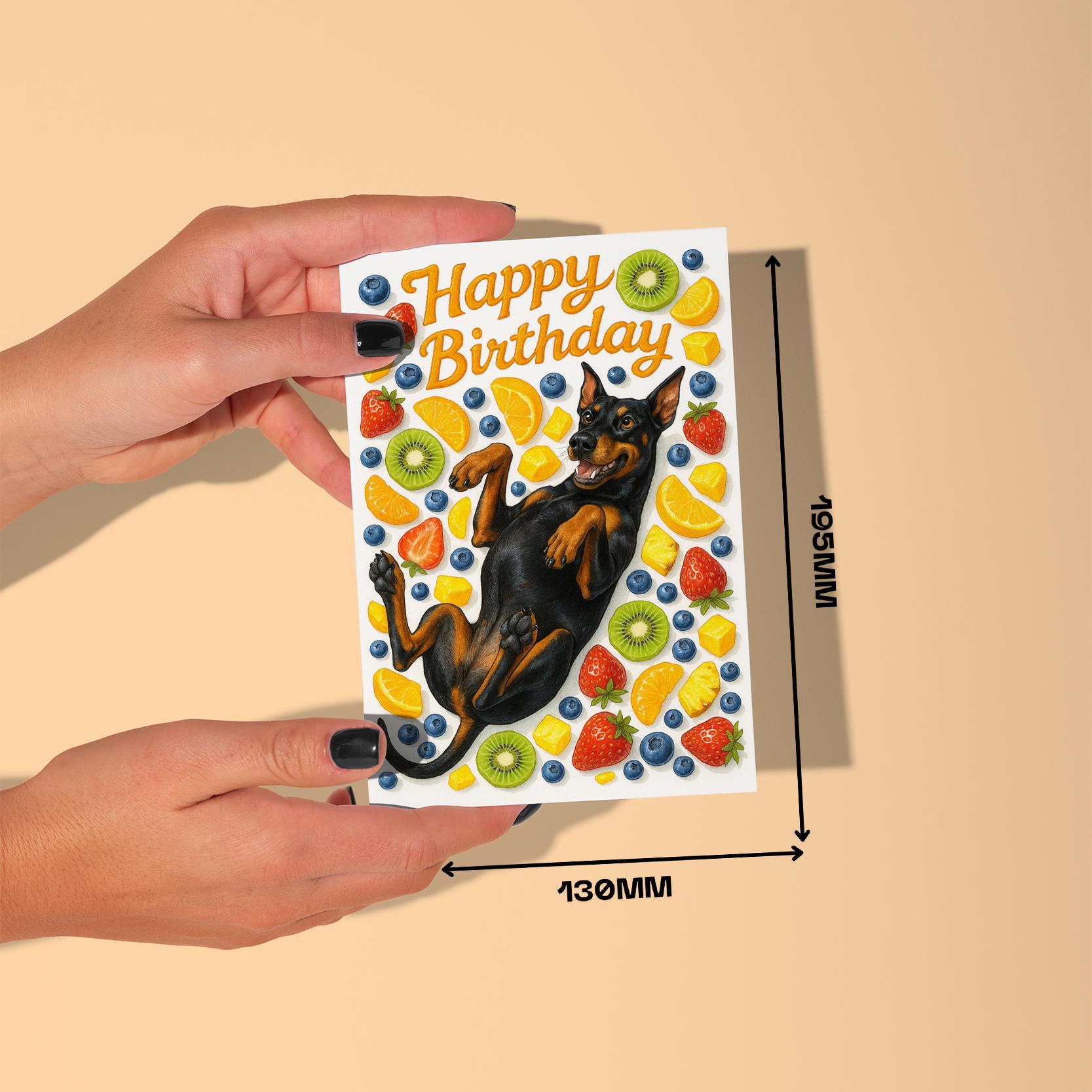 BLANK INTERIOR FOR A PERSONAL TOUCH: Our Fruity Friends Collection – Sweet Fruit Salad Doberman dog - Happy Birthday! card and other whimsical designs feature a blank interior, giving you ample space to write a personal message from the heart. Perfect for any occasion, each card comes with a matching white envelope, making it easy to send your unique sentiments to loved ones.