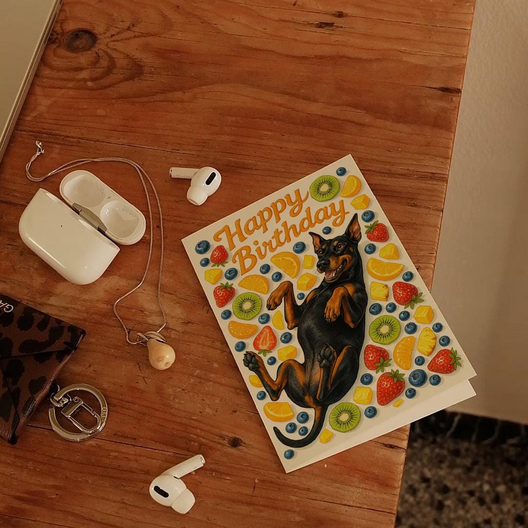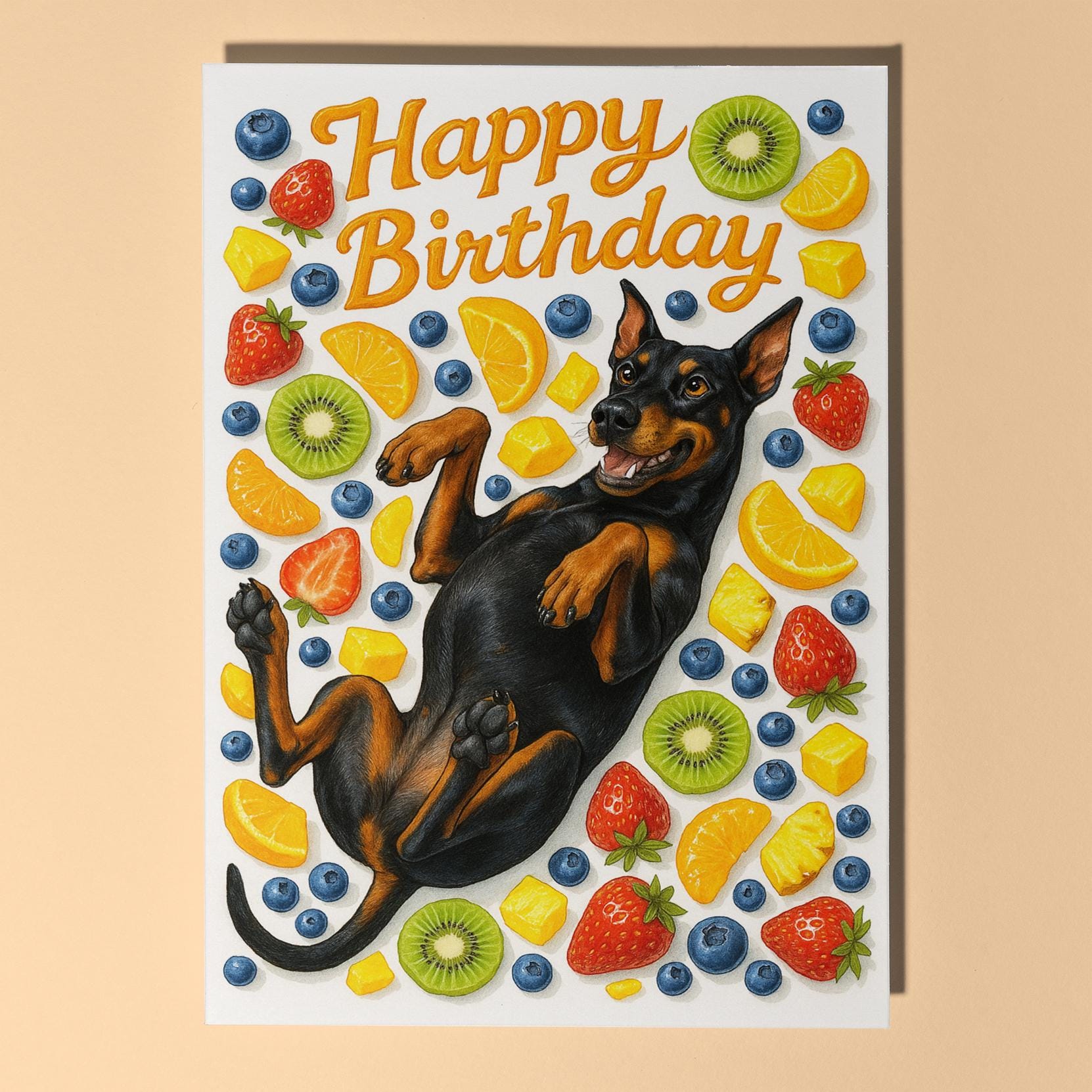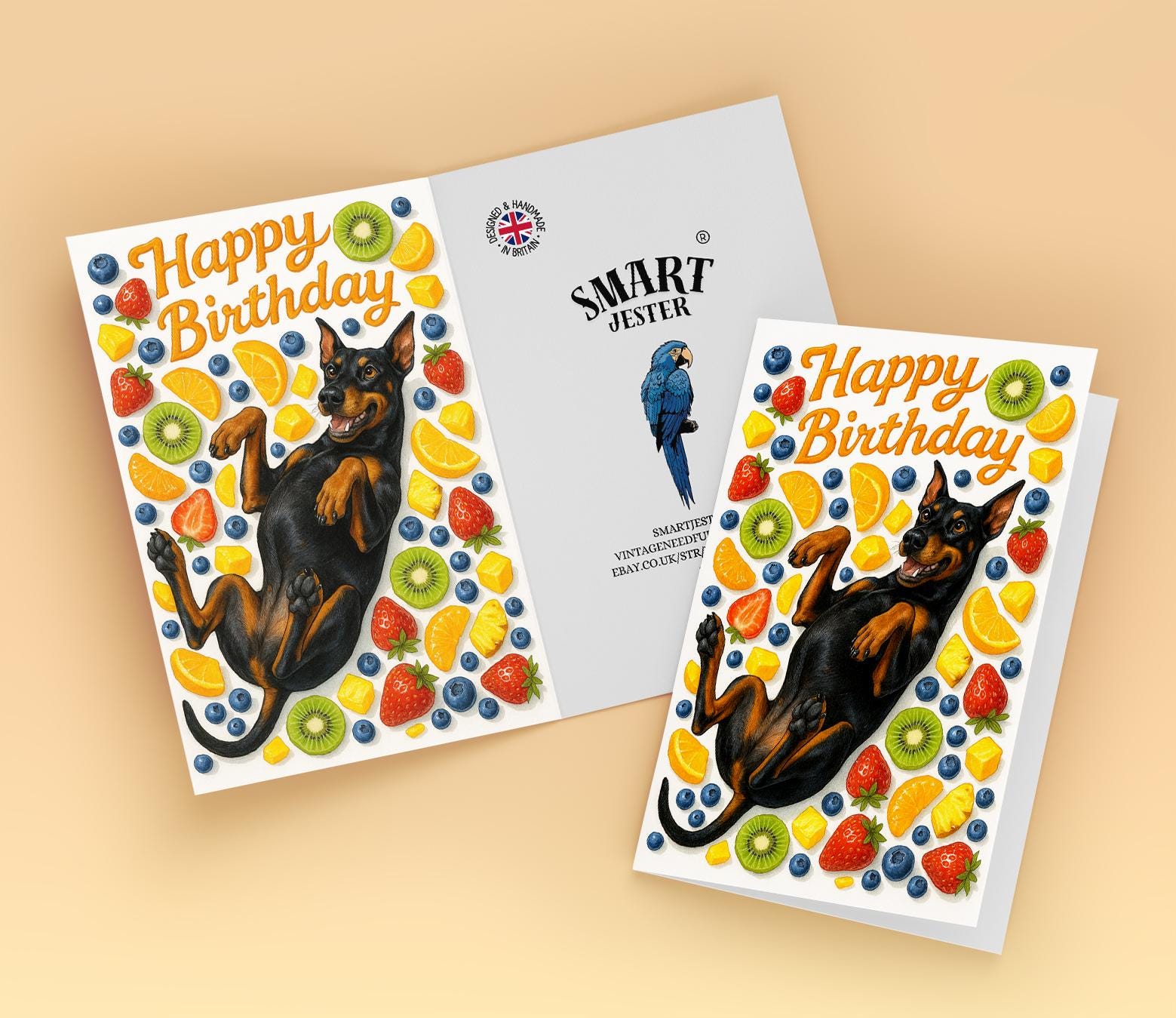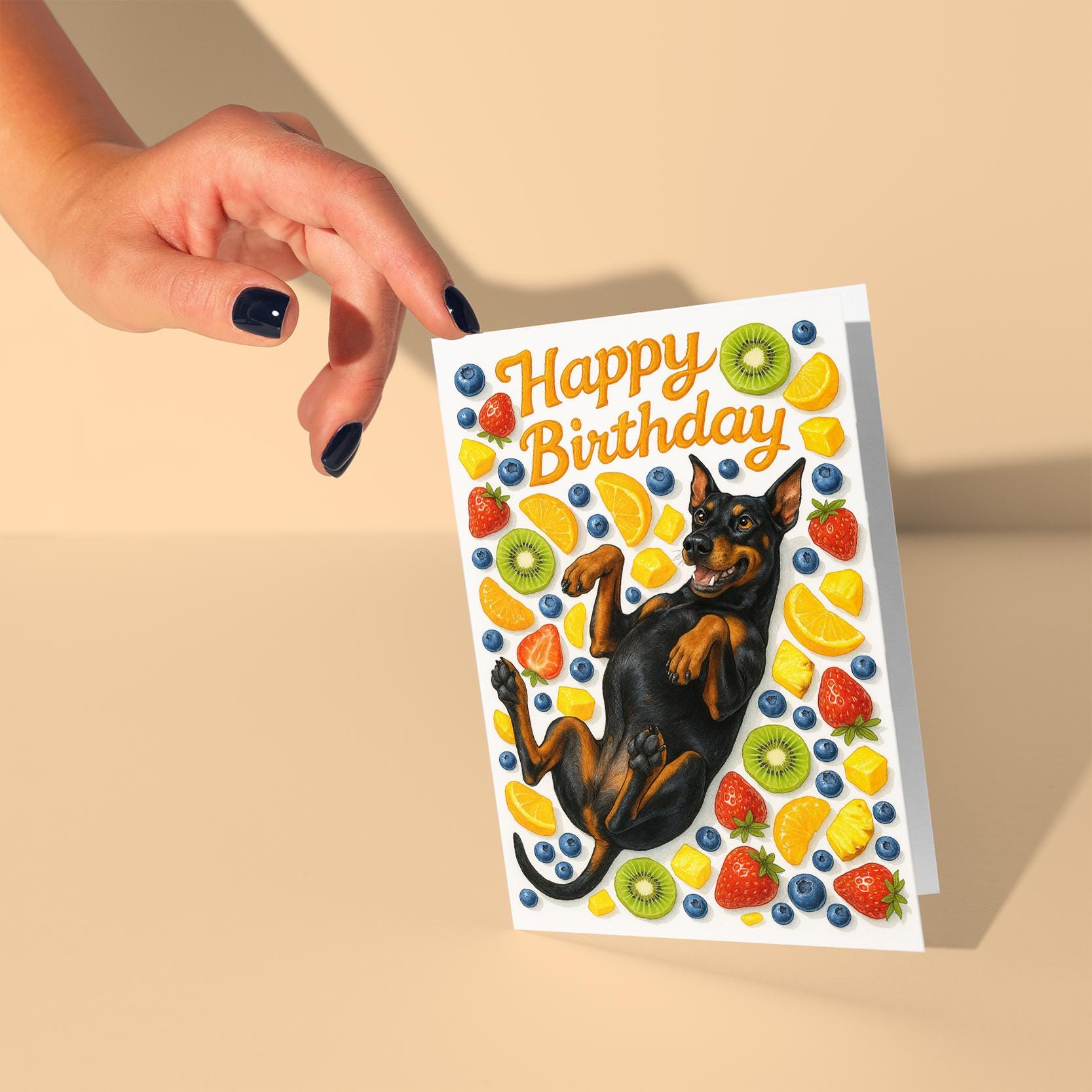 BLANK INTERIOR FOR A PERSONAL TOUCH: Our Fruity Friends Collection – Sweet Fruit Salad Doberman dog - Happy Birthday! card and other whimsical designs feature a blank interior, giving you ample space to write a personal message from the heart. Perfect for any occasion, each card comes with a matching white envelope, making it easy to send your unique sentiments to loved ones.