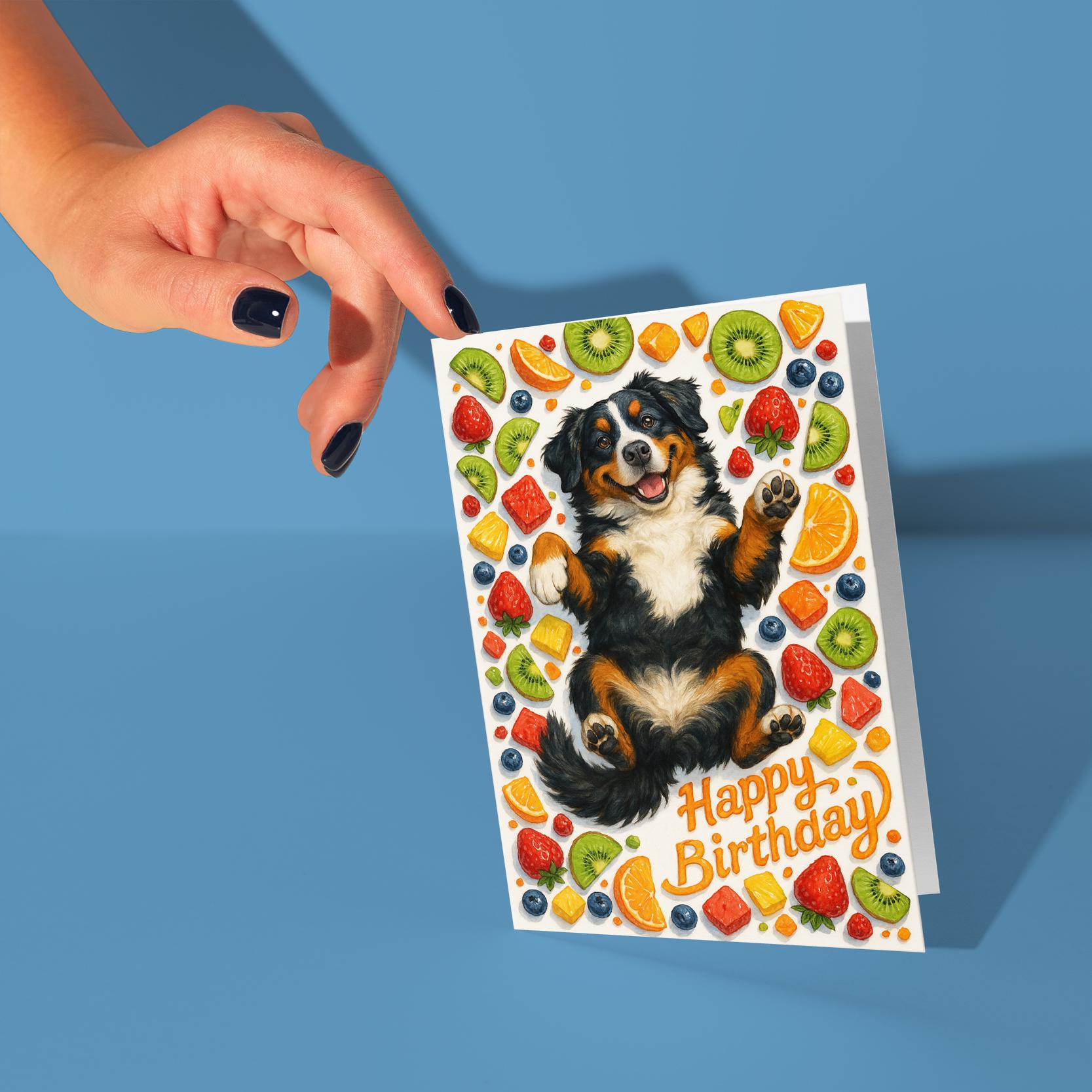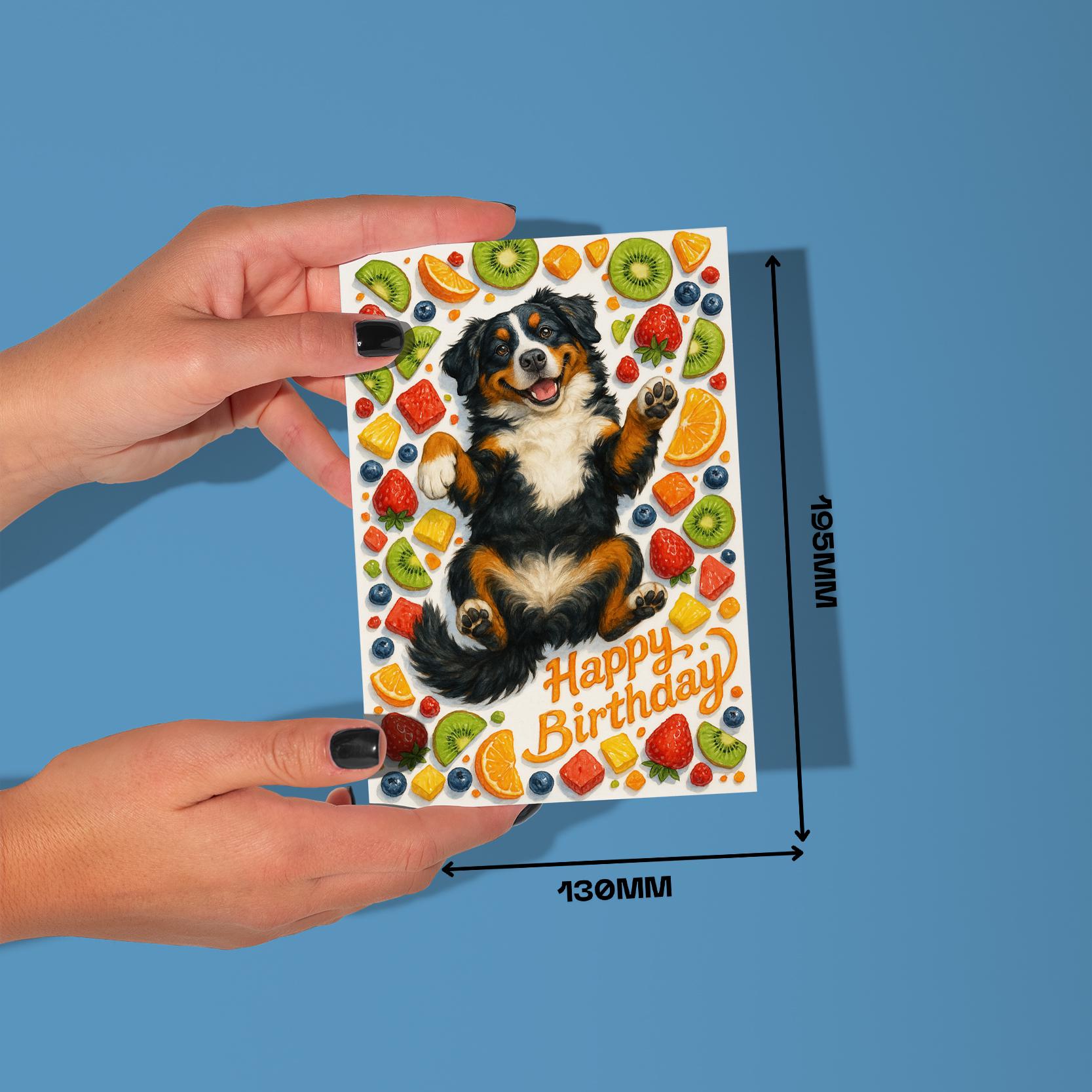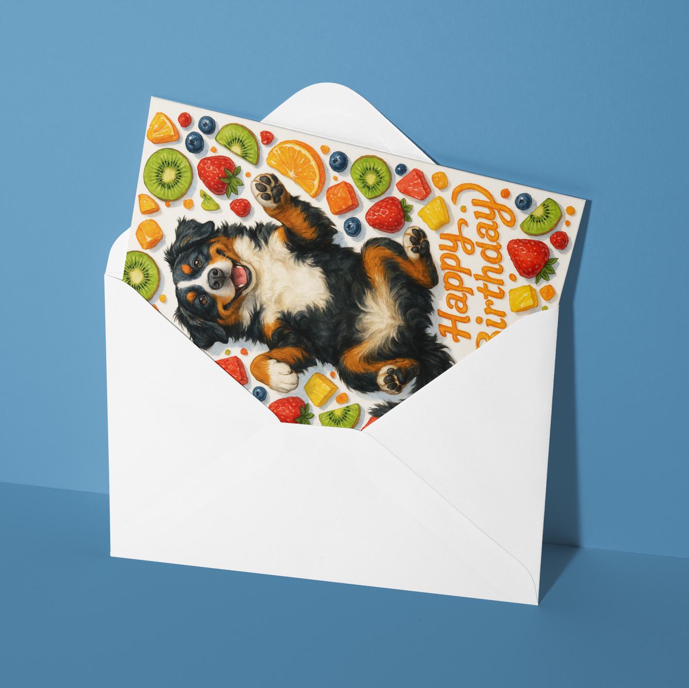 BLANK INTERIOR FOR A PERSONAL TOUCH: Our Fruity Friends Collection – Bernese mountain Dog in Fruit Salad - Happy Birthday! card and other whimsical designs feature a blank interior, giving you ample space to write a personal message from the heart. Perfect for any occasion, each card comes with a matching white envelope, making it easy to send your unique sentiments to loved ones.