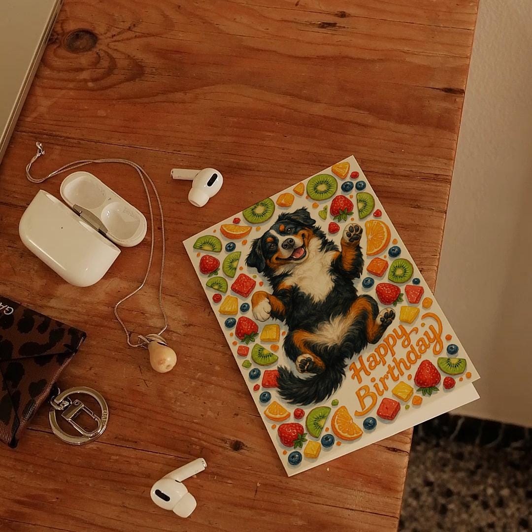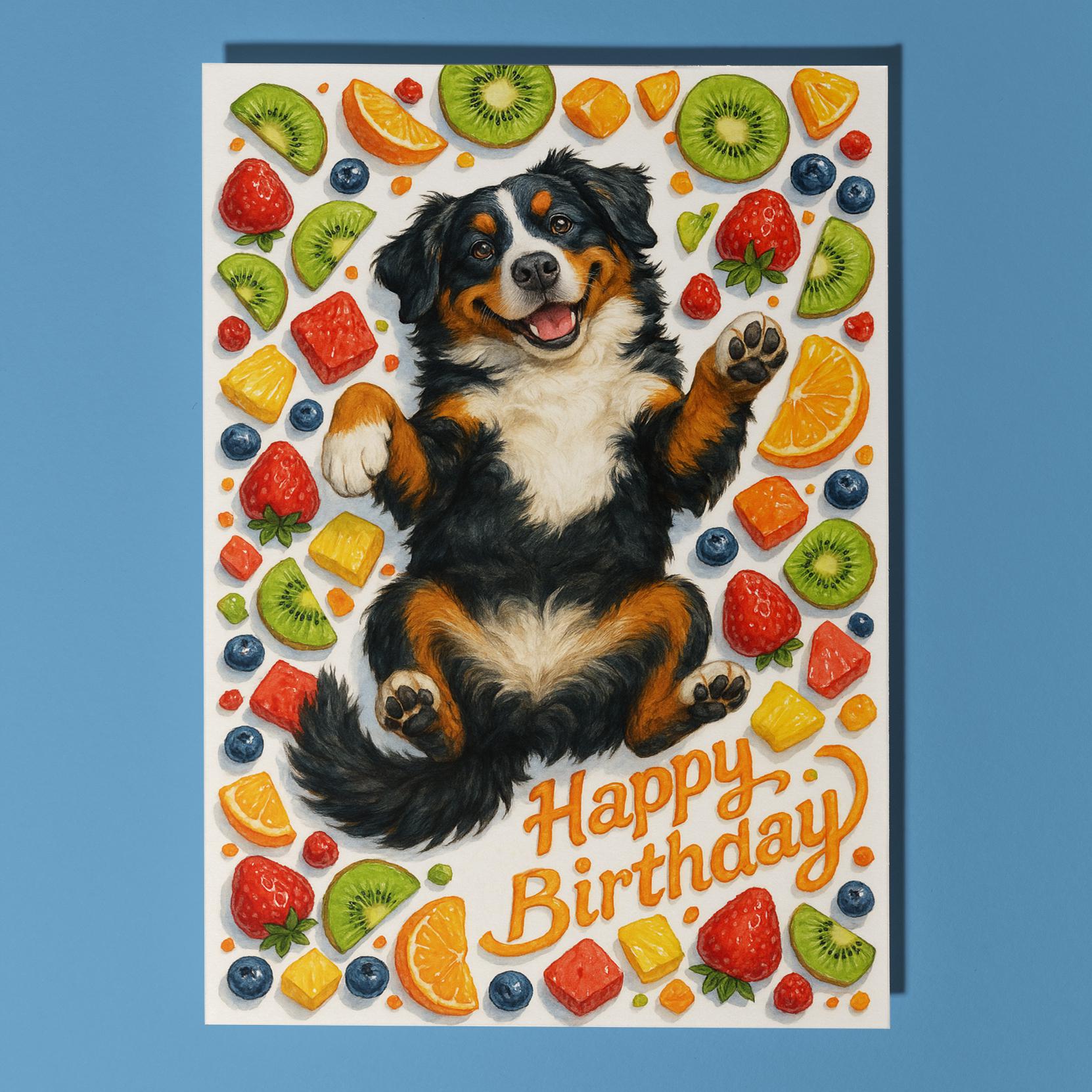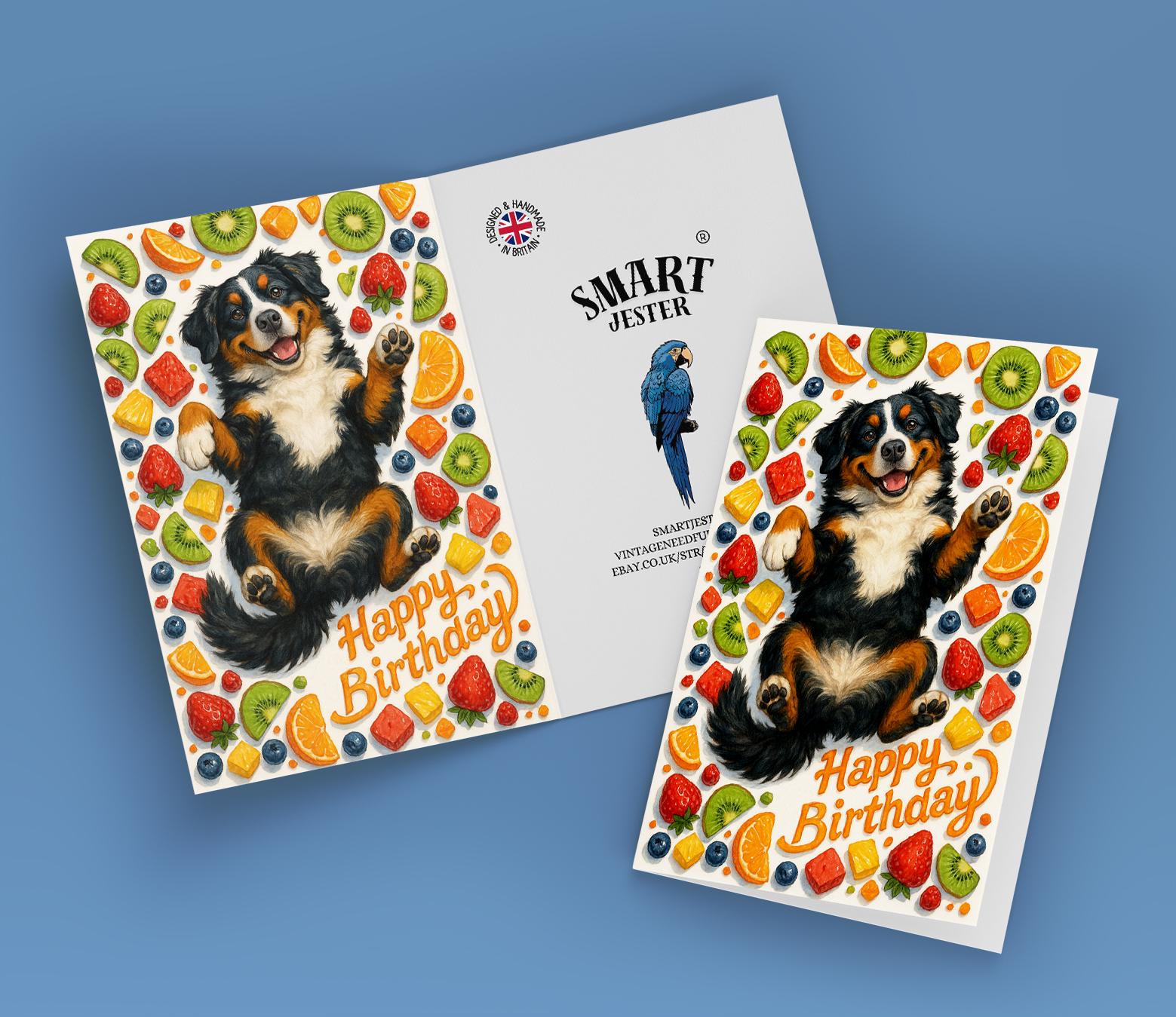 BLANK INTERIOR FOR A PERSONAL TOUCH: Our Fruity Friends Collection – Bernese mountain Dog in Fruit Salad - Happy Birthday! card and other whimsical designs feature a blank interior, giving you ample space to write a personal message from the heart. Perfect for any occasion, each card comes with a matching white envelope, making it easy to send your unique sentiments to loved ones.