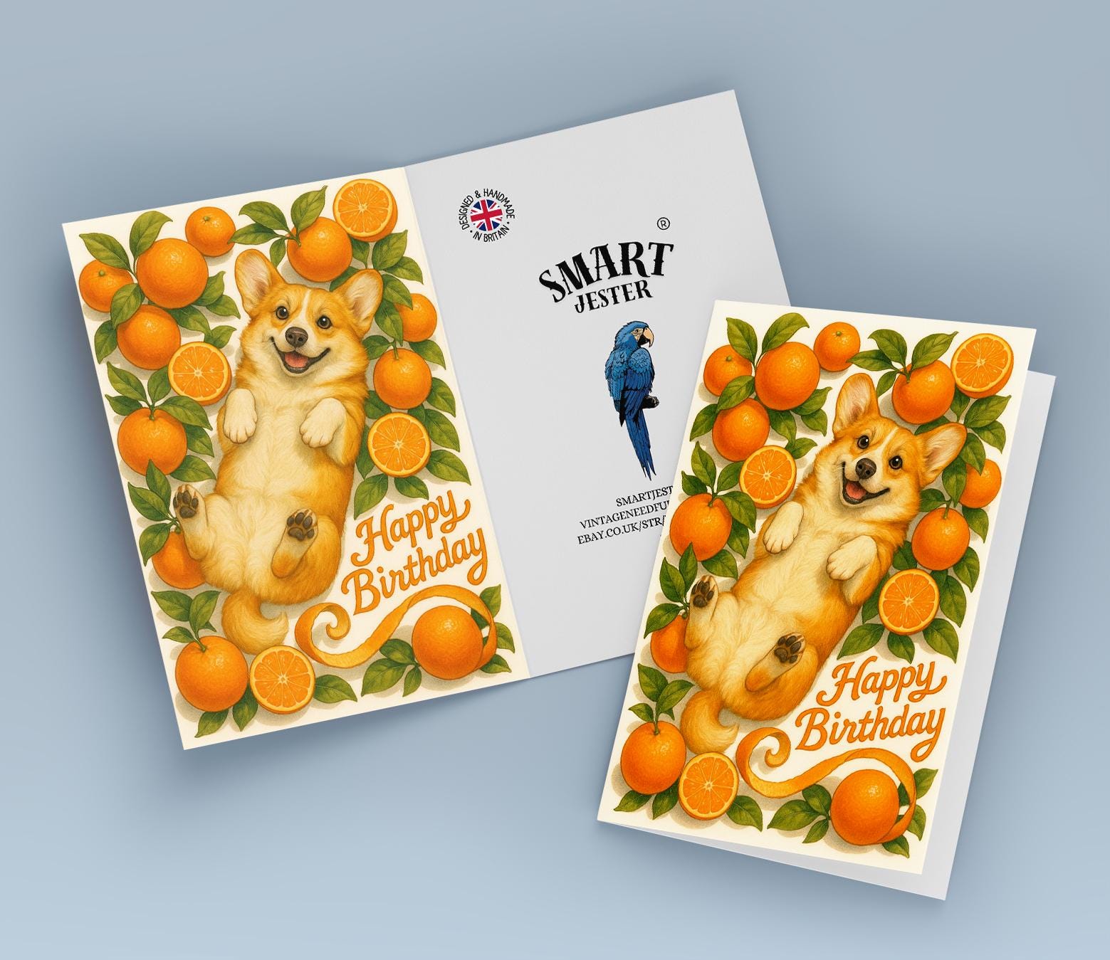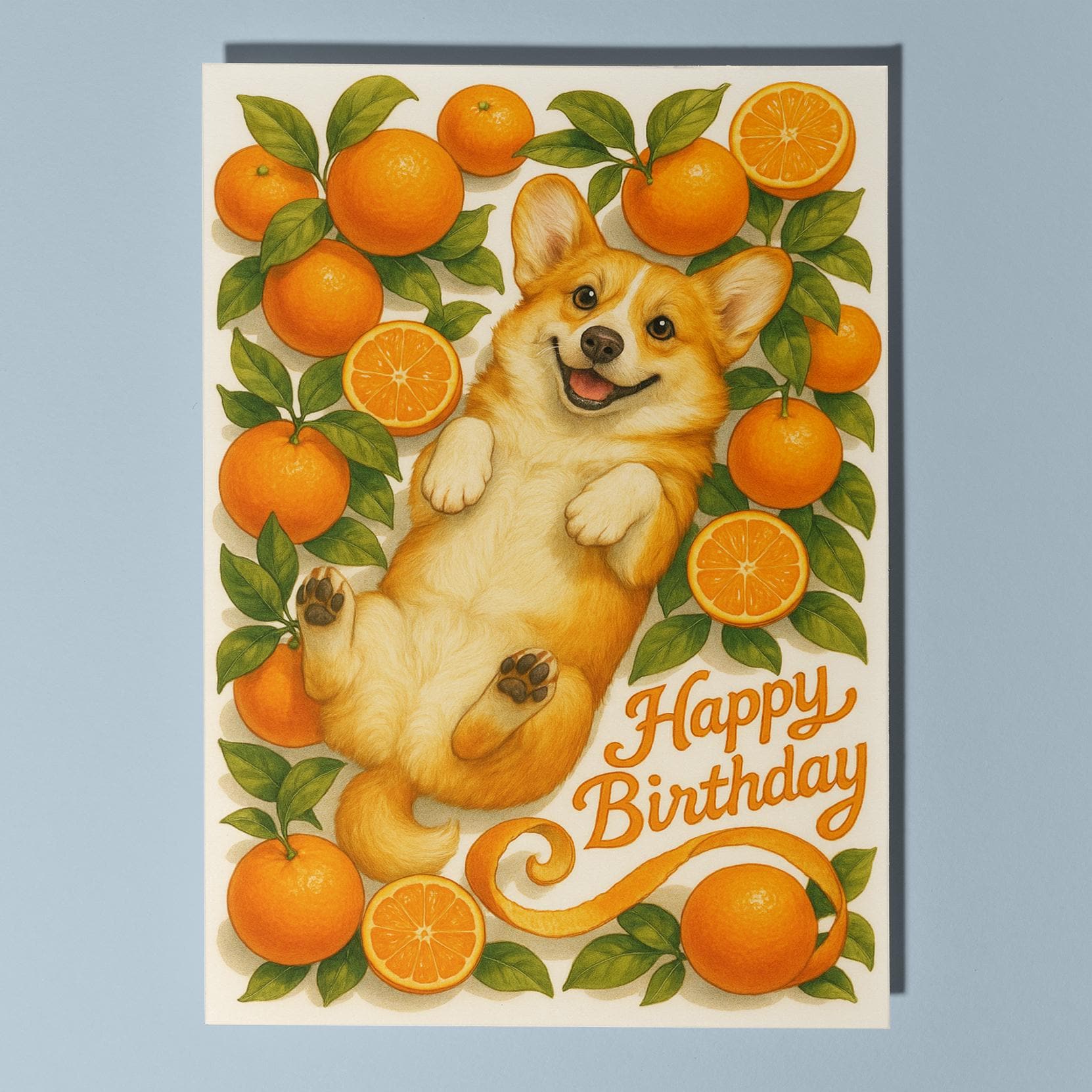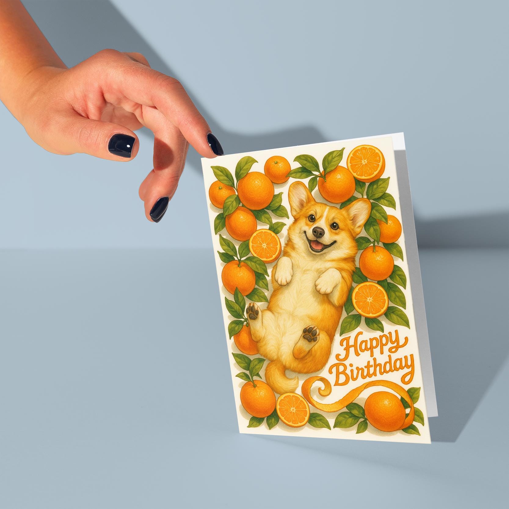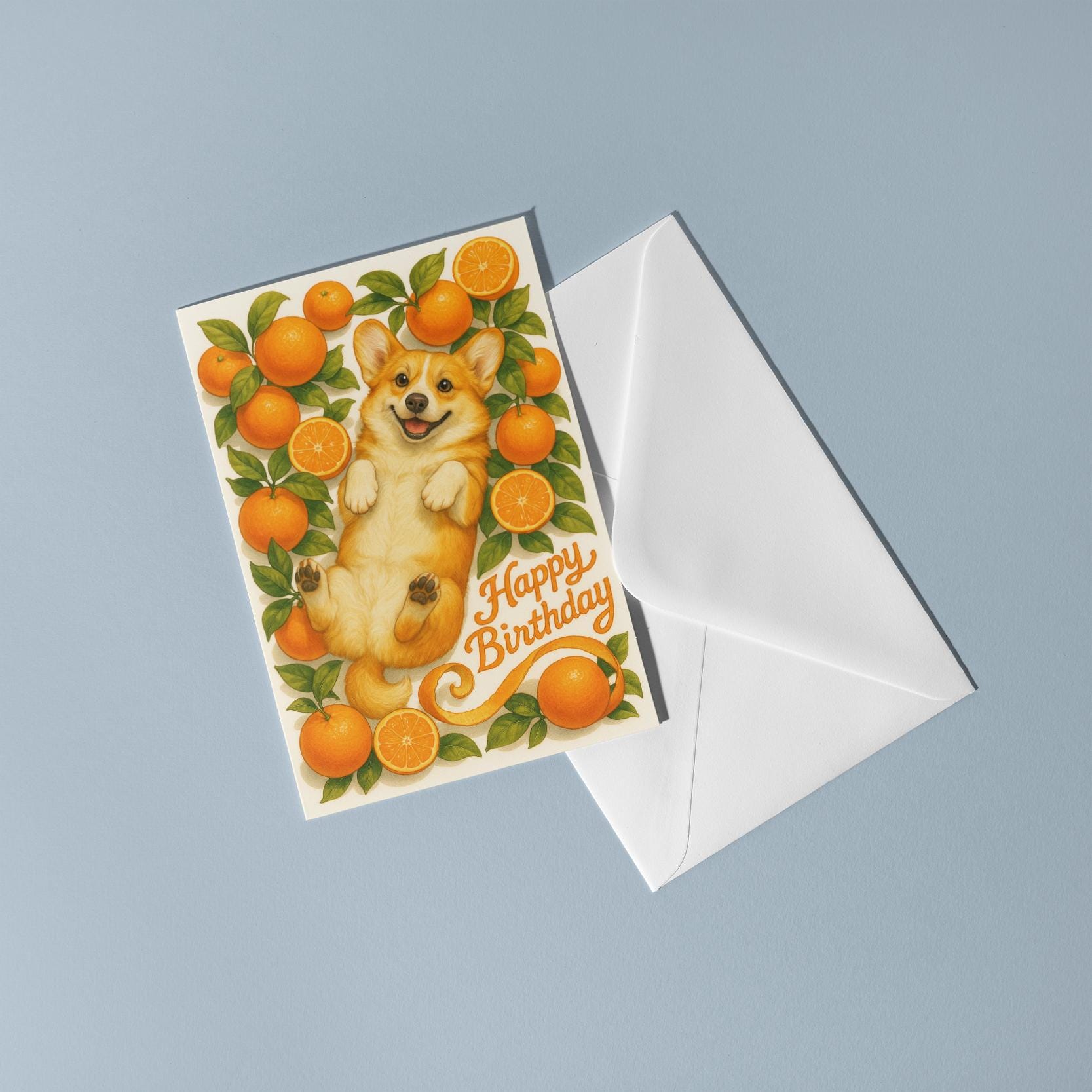 BLANK INTERIOR FOR A PERSONAL TOUCH: Our Fruity Friends Collection – Sweet Orange Corgi Dog - Happy Birthday! card and other whimsical designs feature a blank interior, giving you ample space to write a personal message from the heart. Perfect for any occasion, each card comes with a matching white envelope, making it easy to send your unique sentiments to loved ones.