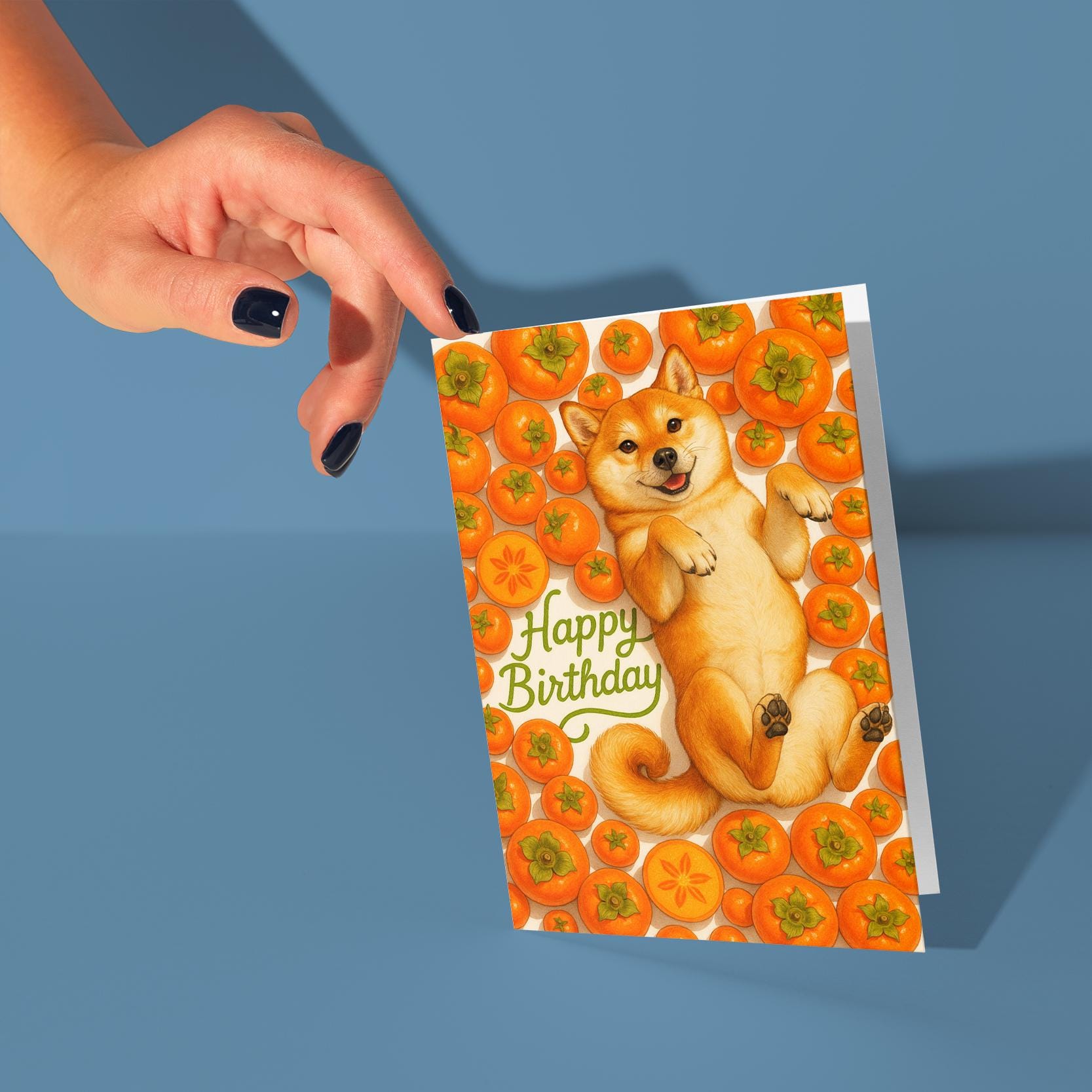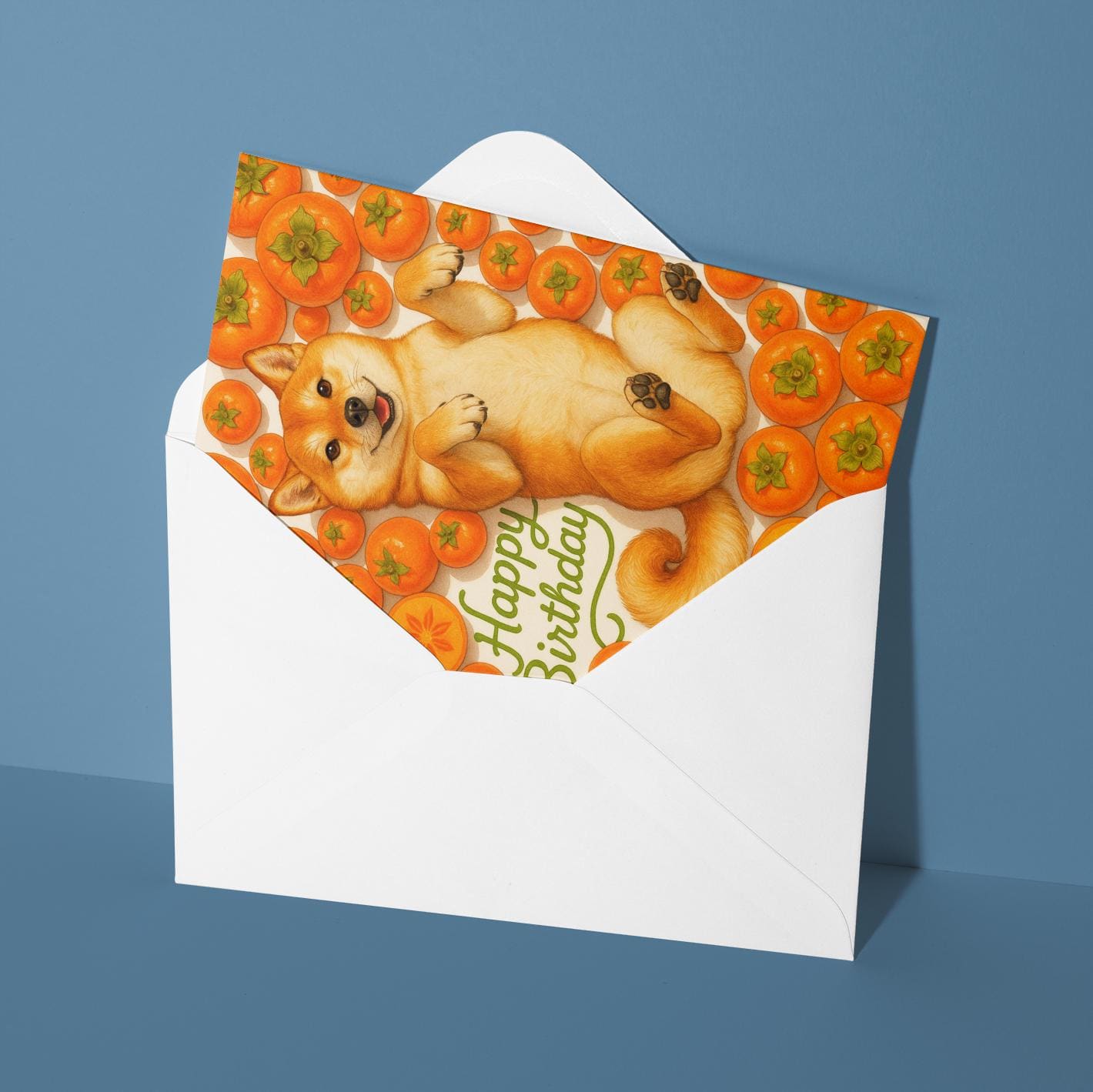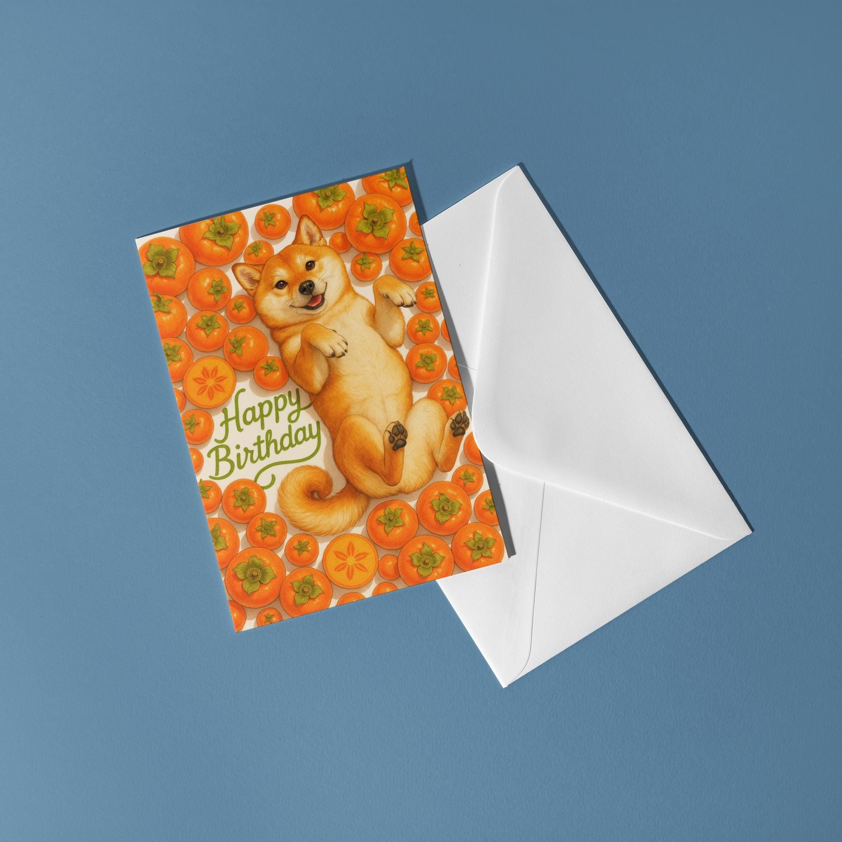 BLANK INTERIOR FOR A PERSONAL TOUCH: Our Fruity Friends Collection – Sweet Persimmon Shiba Inu Dog - Happy Birthday! card and other whimsical designs feature a blank interior, giving you ample space to write a personal message from the heart. Perfect for any occasion, each card comes with a matching white envelope, making it easy to send your unique sentiments to loved ones.
