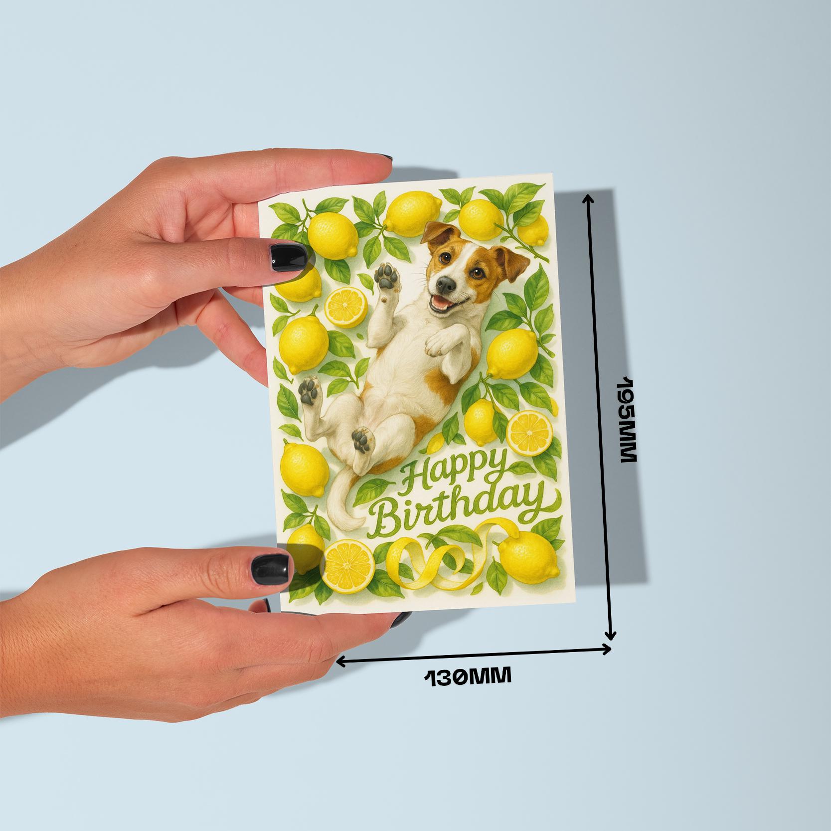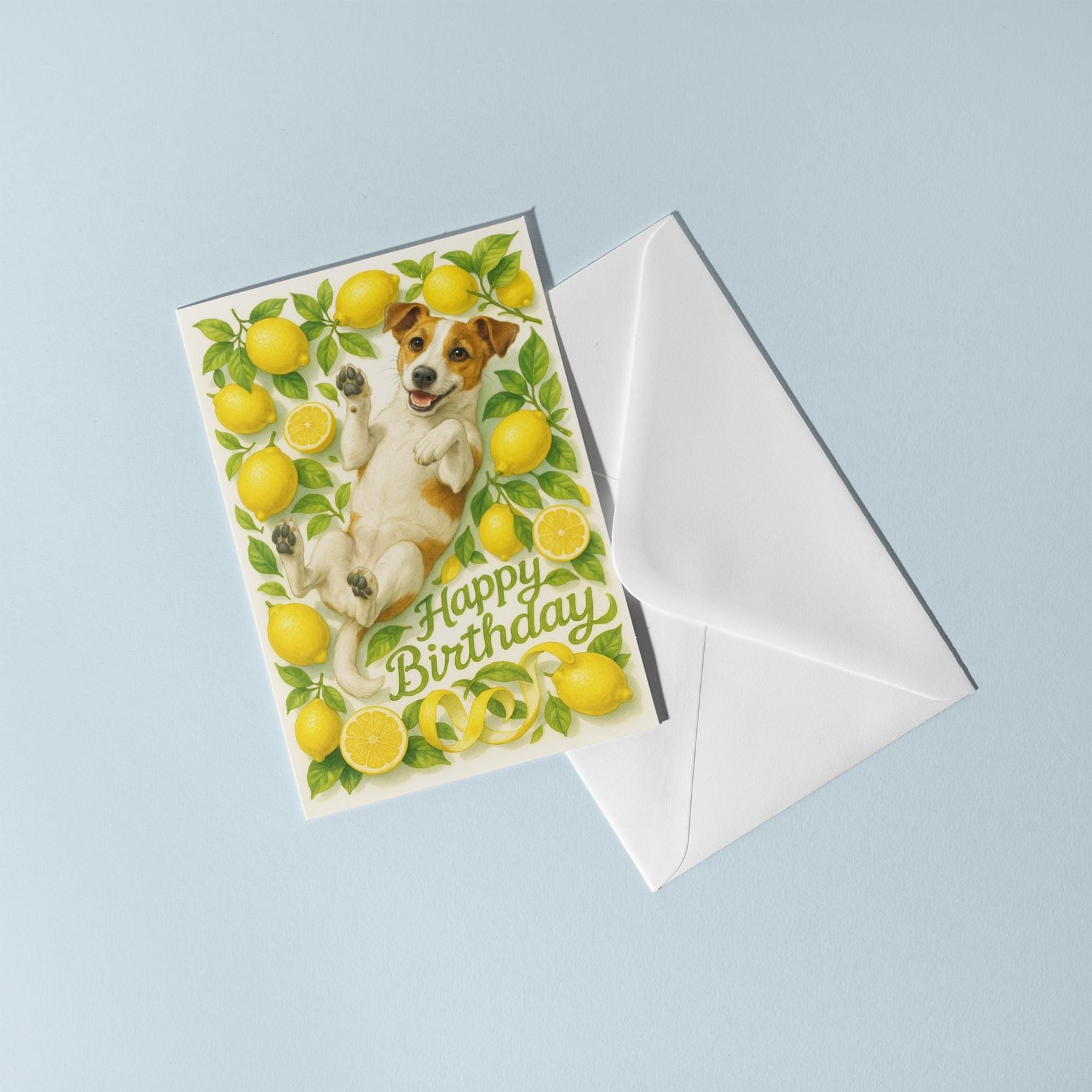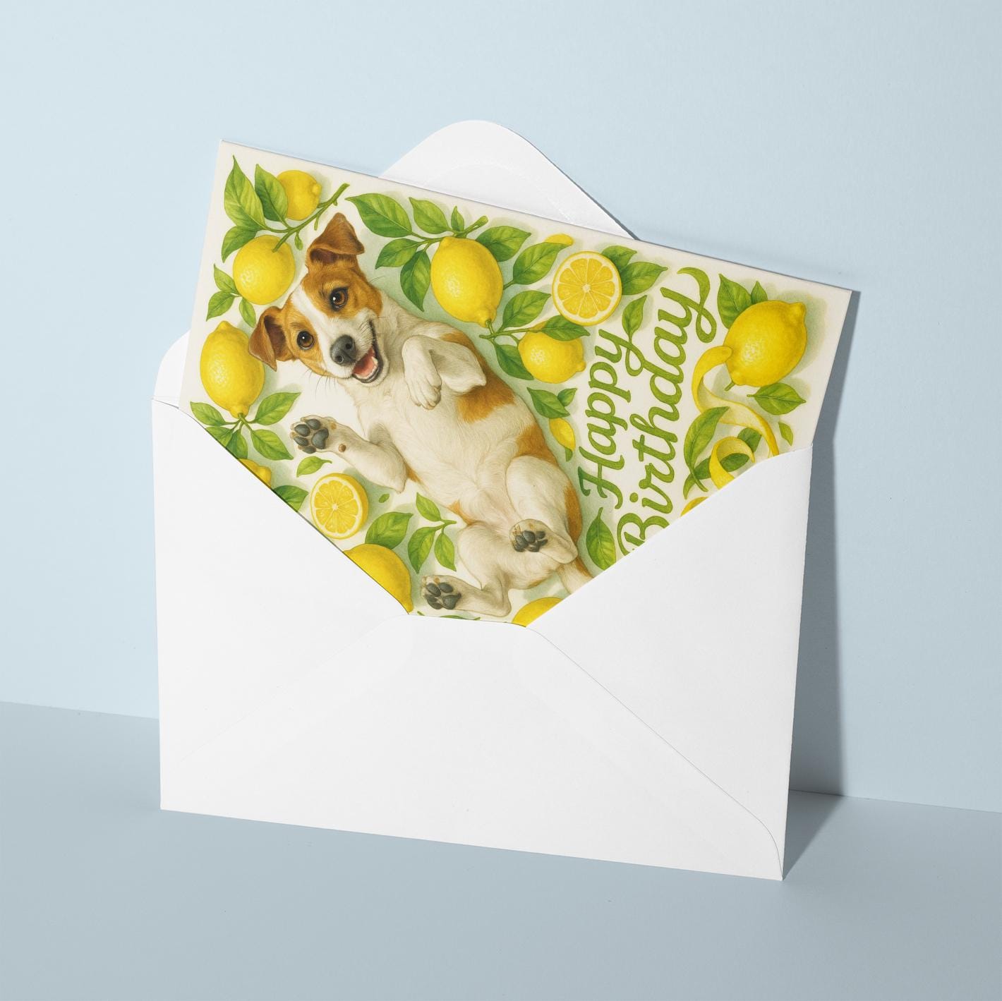 BLANK INTERIOR FOR A PERSONAL TOUCH: Our Fruity Friends Collection – Sunny Lemon Jack Russell Terrier Dog - Happy Birthday! card and other whimsical designs feature a blank interior, giving you ample space to write a personal message from the heart. Perfect for any occasion, each card comes with a matching white envelope, making it easy to send your unique sentiments to loved ones.