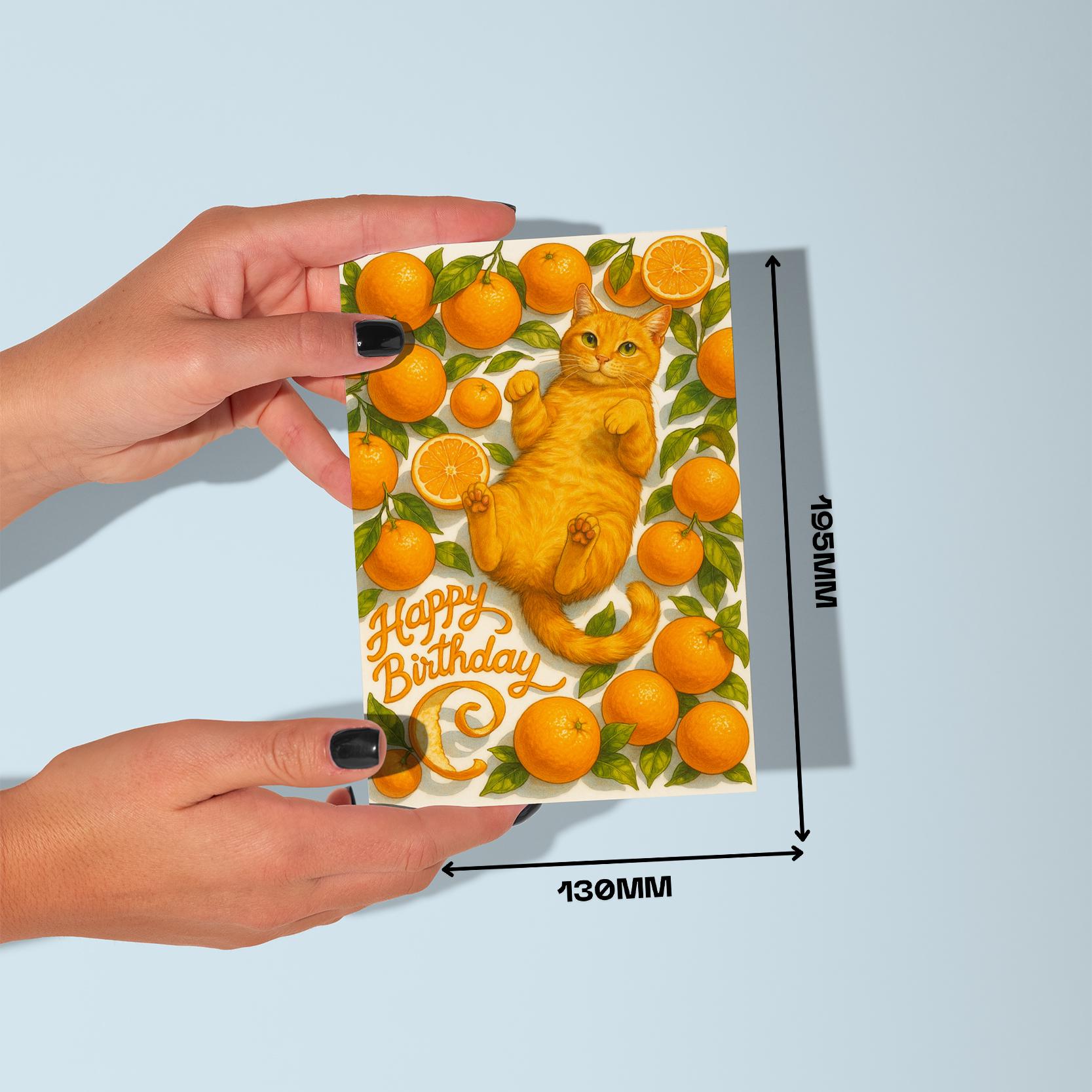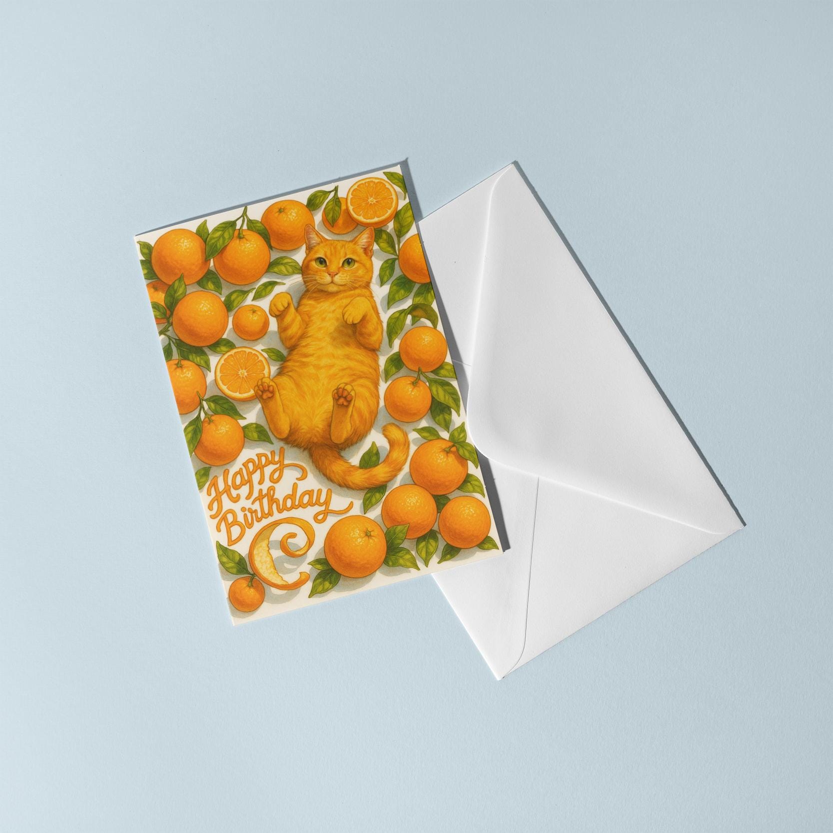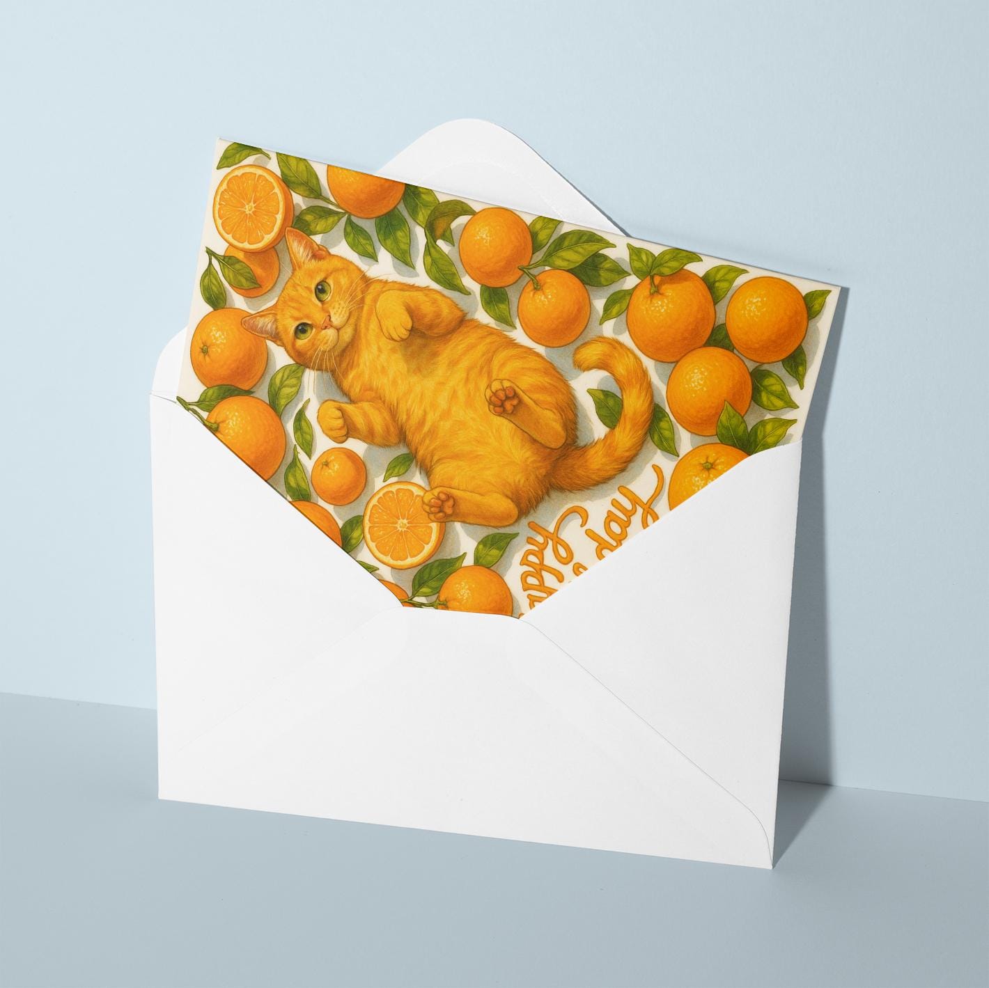 BLANK INTERIOR FOR A PERSONAL TOUCH: Our Fruity Friends Collection – Sunny Orange Ginger Cat - Happy Birthday! card and other whimsical designs feature a blank interior, giving you ample space to write a personal message from the heart. Perfect for any occasion, each card comes with a matching white envelope, making it easy to send your unique sentiments to loved ones.