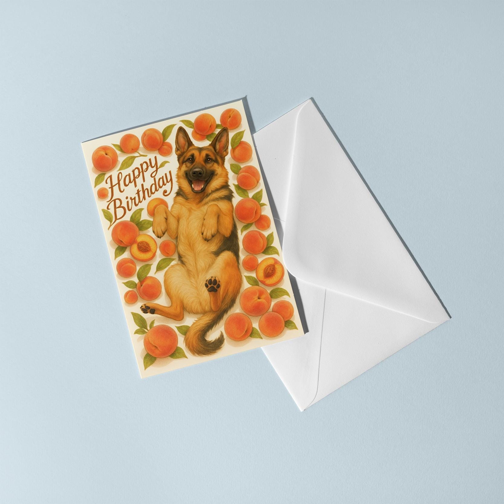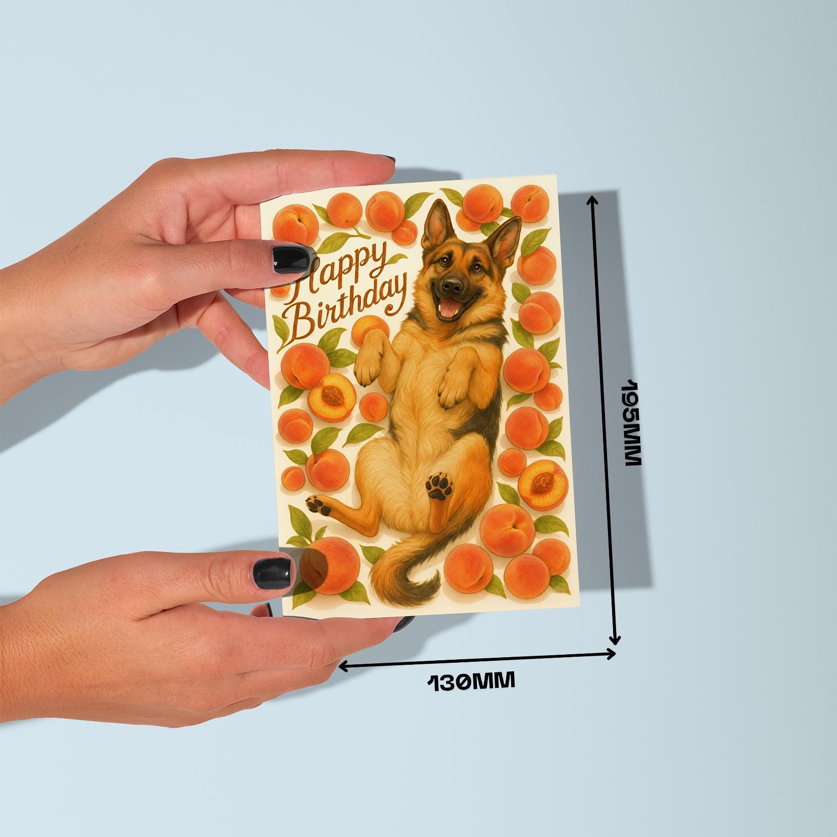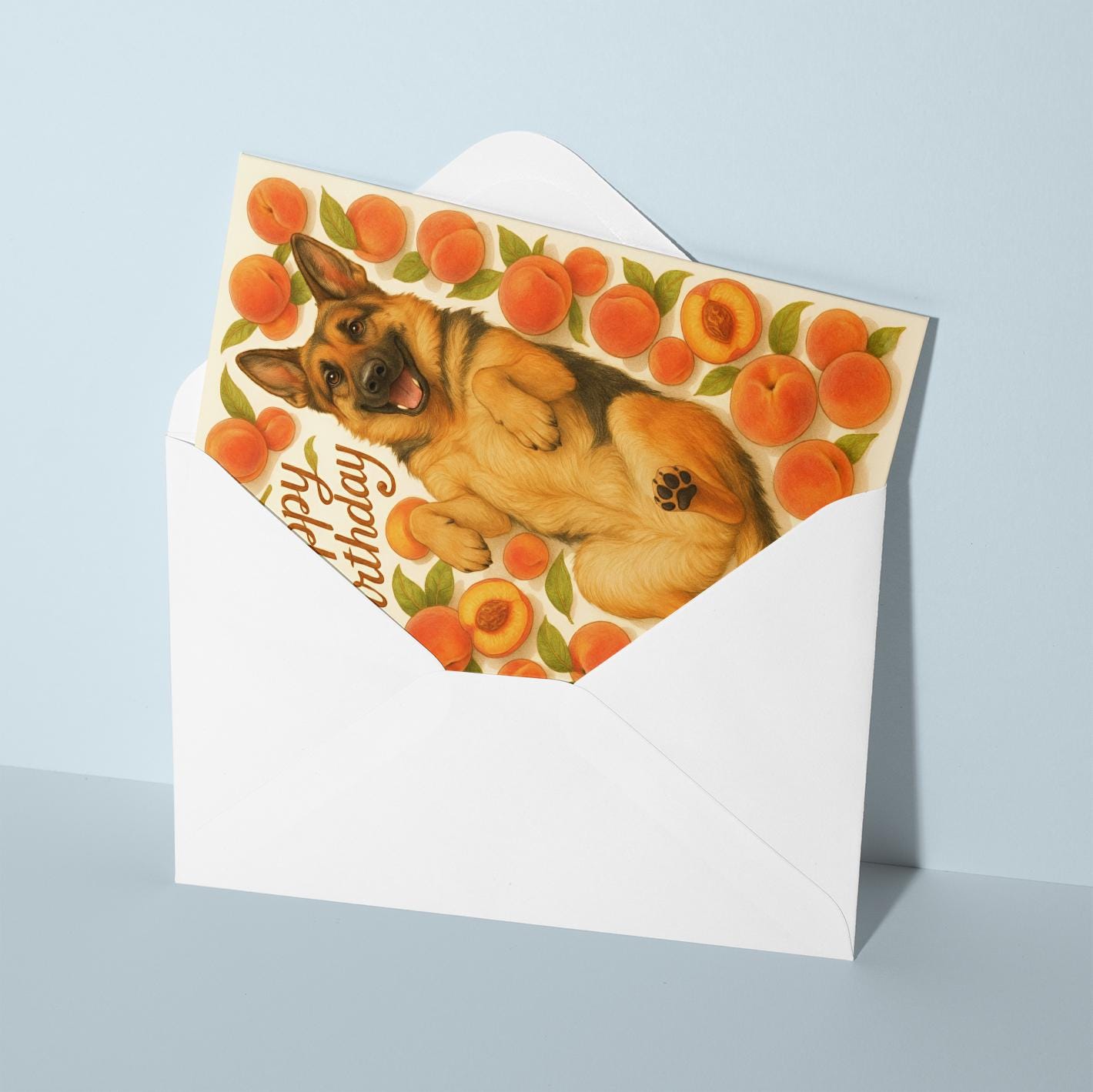 BLANK INTERIOR FOR A PERSONAL TOUCH: Our Fruity Friends Collection – Peachy German Shepherd Dog - Happy Birthday! card and other whimsical designs feature a blank interior, giving you ample space to write a personal message from the heart. Perfect for any occasion, each card comes with a matching white envelope, making it easy to send your unique sentiments to loved ones.