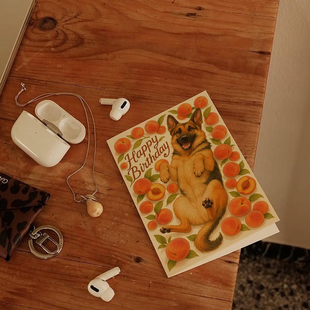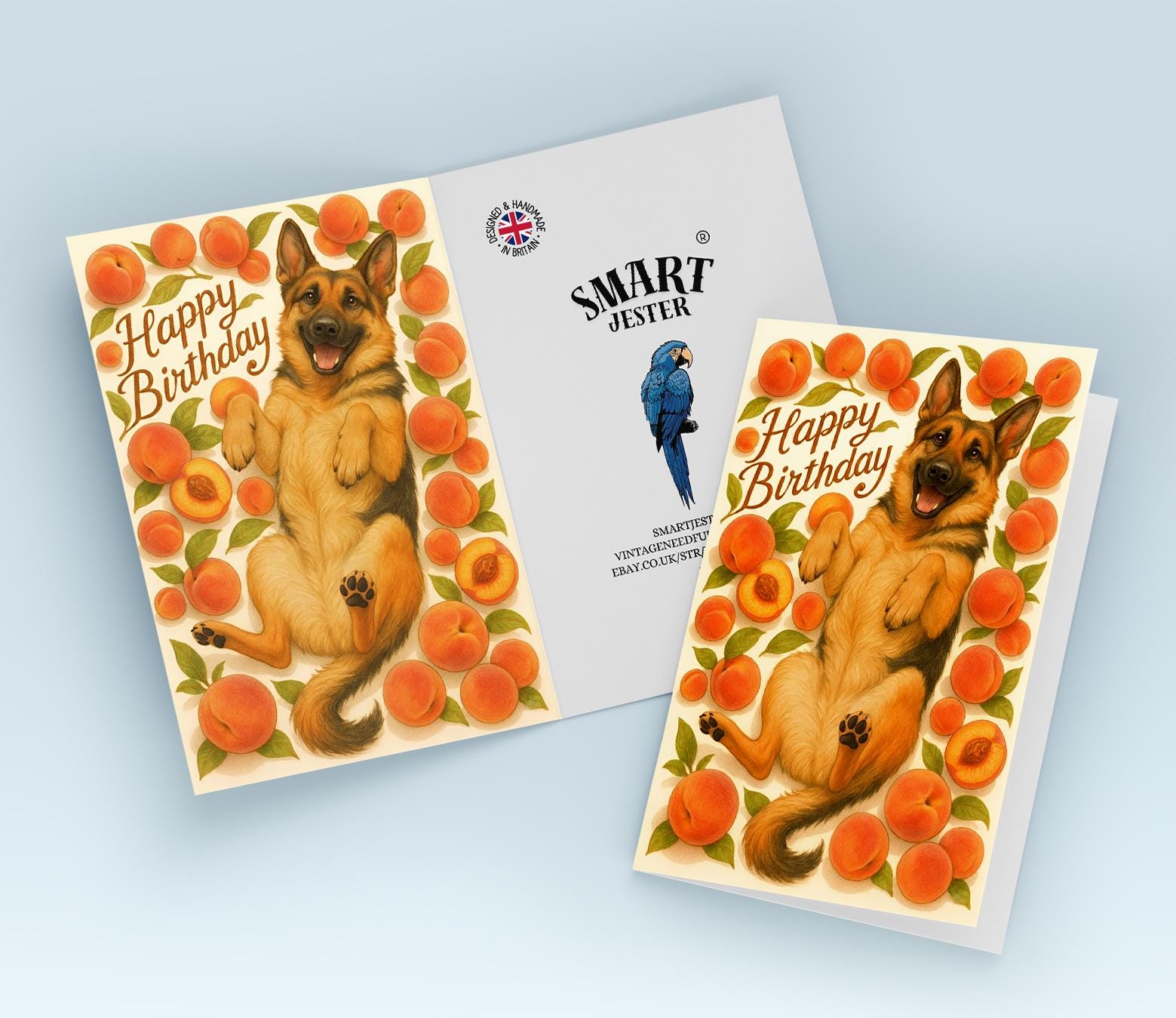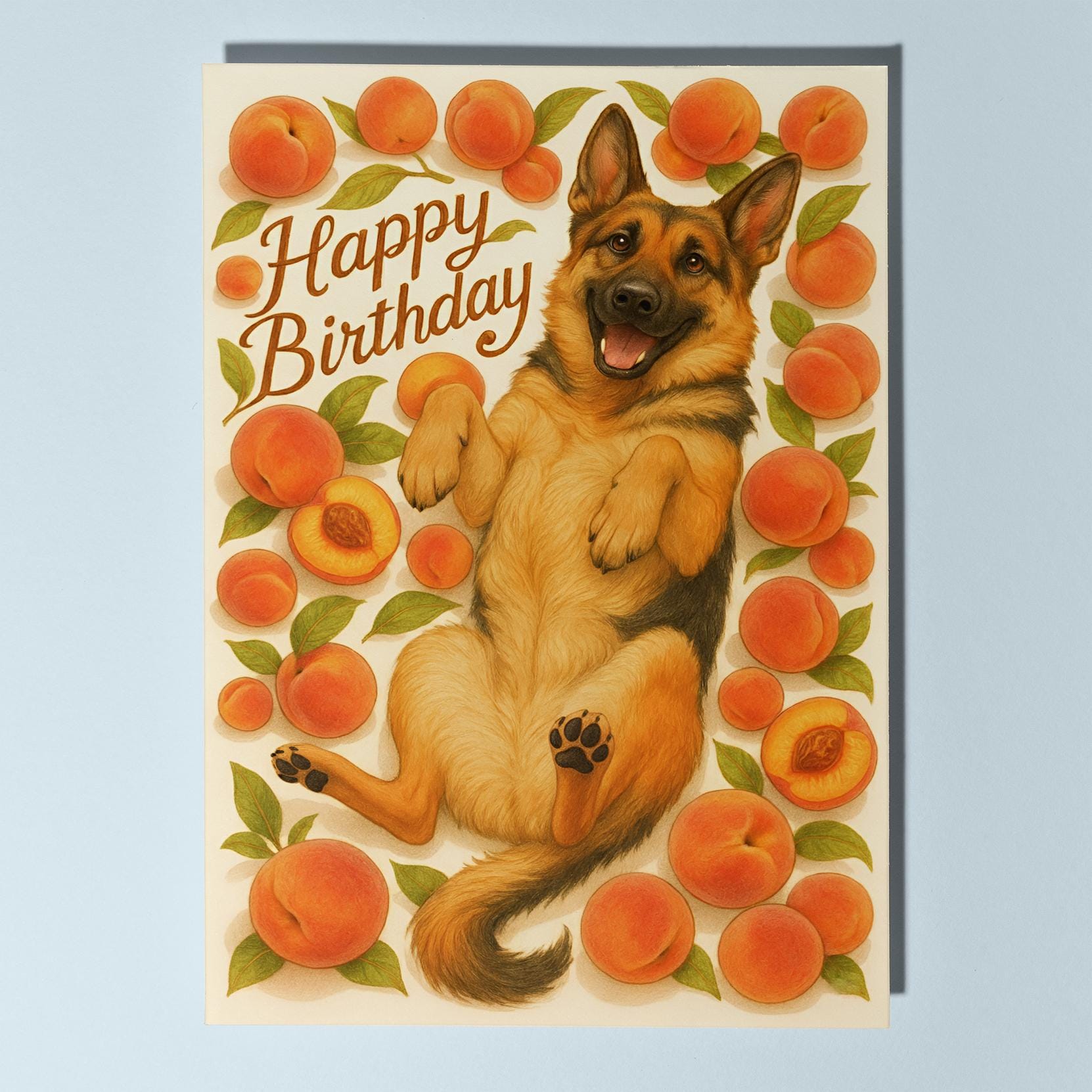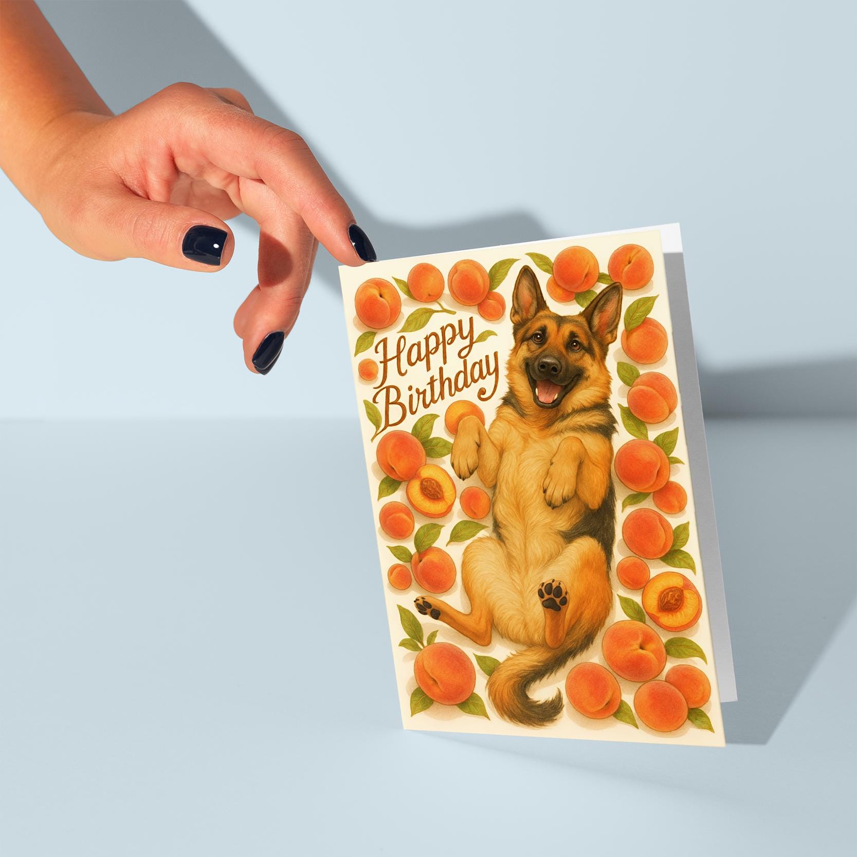 BLANK INTERIOR FOR A PERSONAL TOUCH: Our Fruity Friends Collection – Peachy German Shepherd Dog - Happy Birthday! card and other whimsical designs feature a blank interior, giving you ample space to write a personal message from the heart. Perfect for any occasion, each card comes with a matching white envelope, making it easy to send your unique sentiments to loved ones.