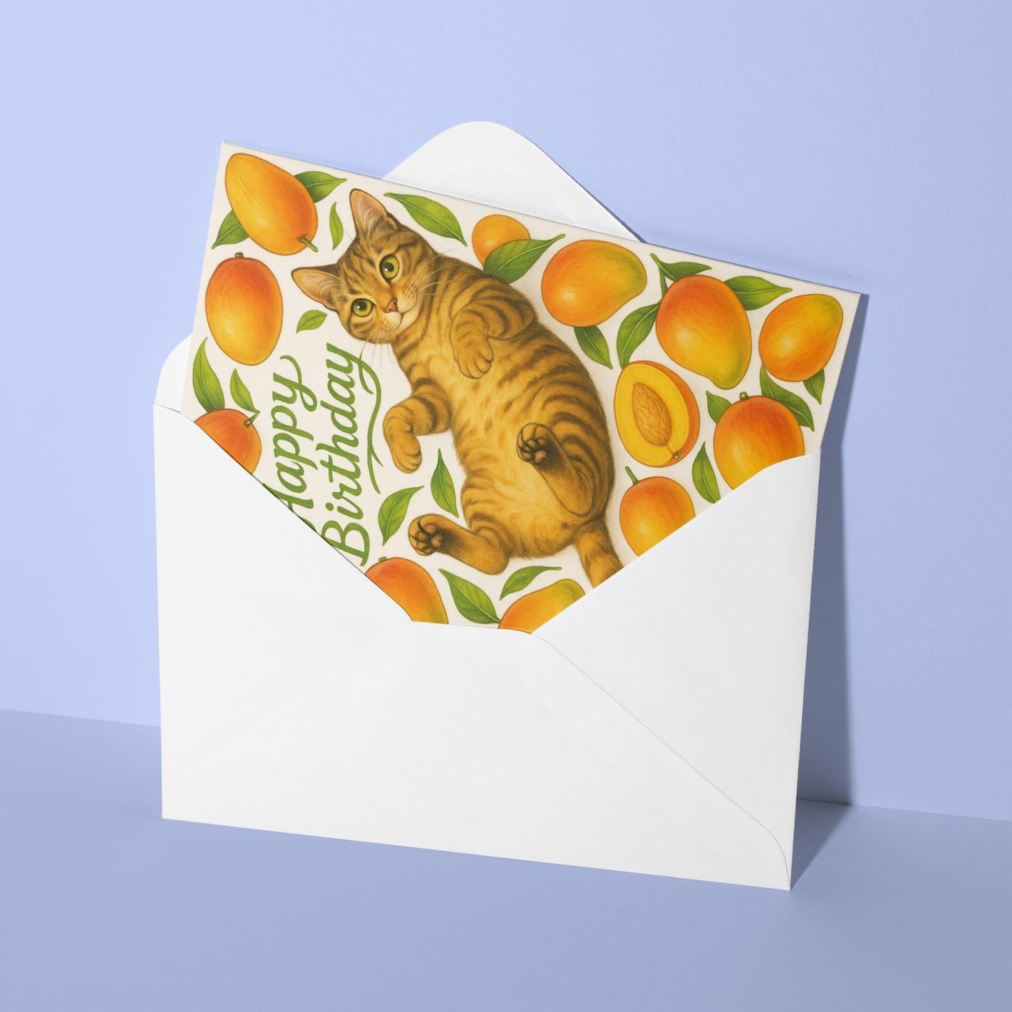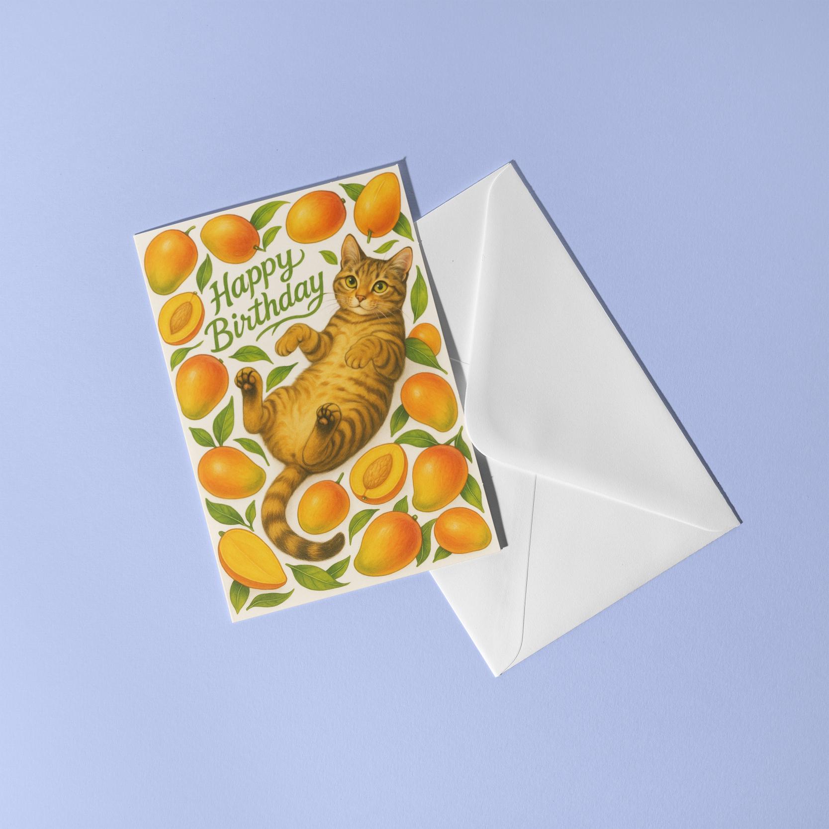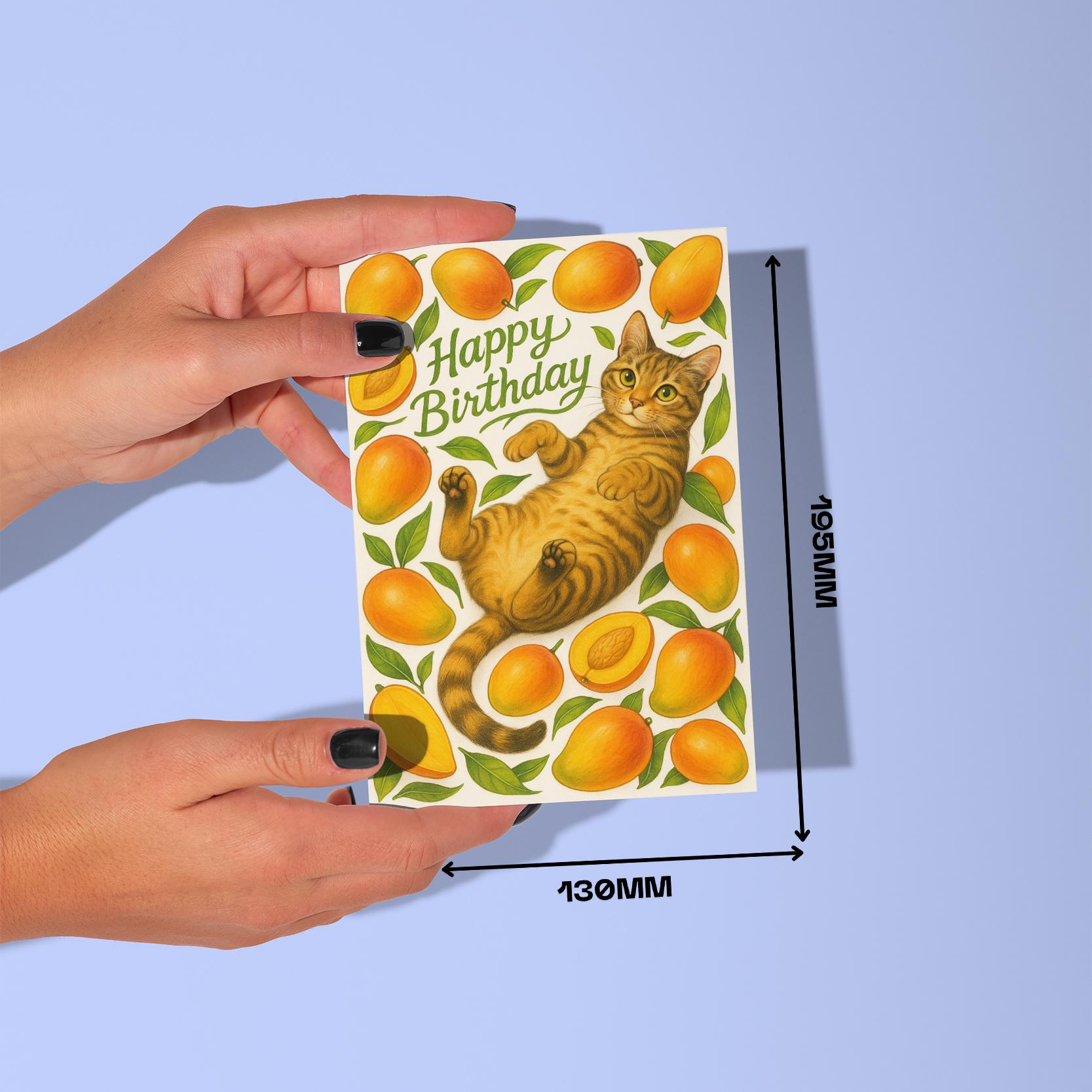 BLANK INTERIOR FOR A PERSONAL TOUCH: Our Fruity Friends Collection – Sweet Mango Tabby Cat - Happy Birthday! card and other whimsical designs feature a blank interior, giving you ample space to write a personal message from the heart. Perfect for any occasion, each card comes with a matching white envelope, making it easy to send your unique sentiments to loved ones.