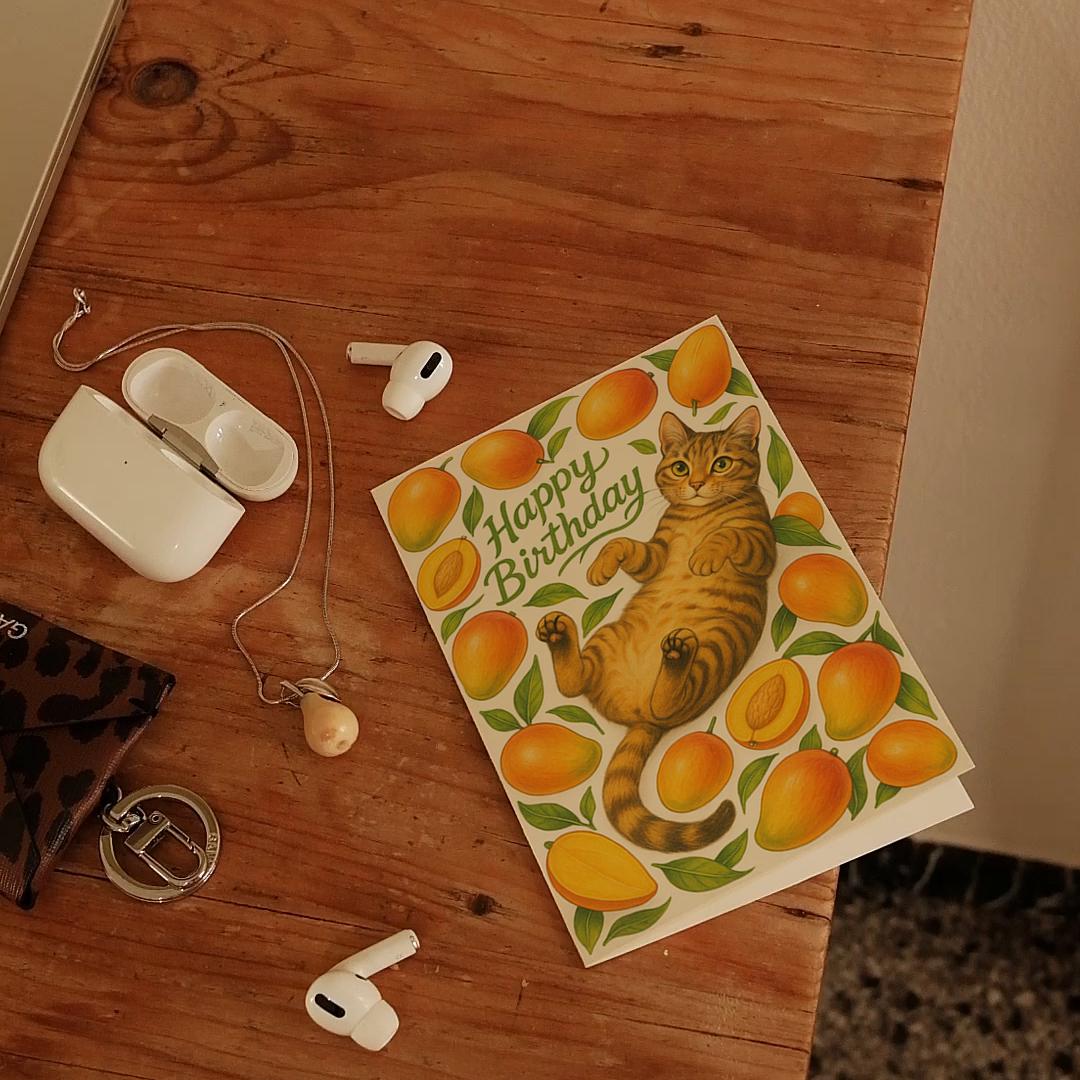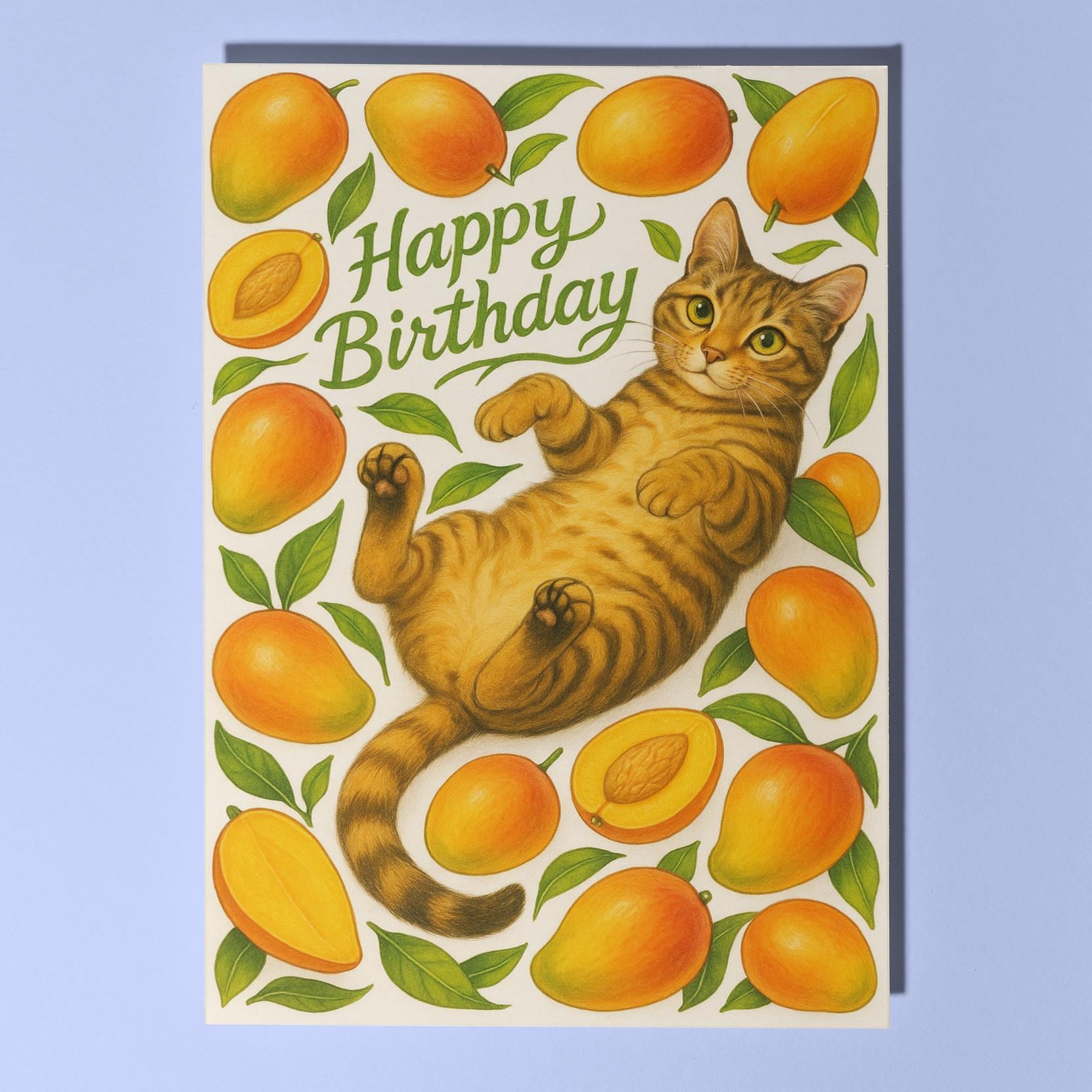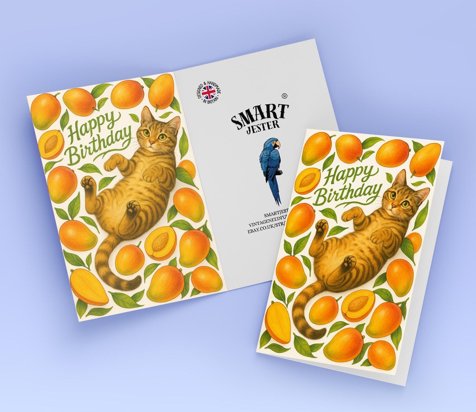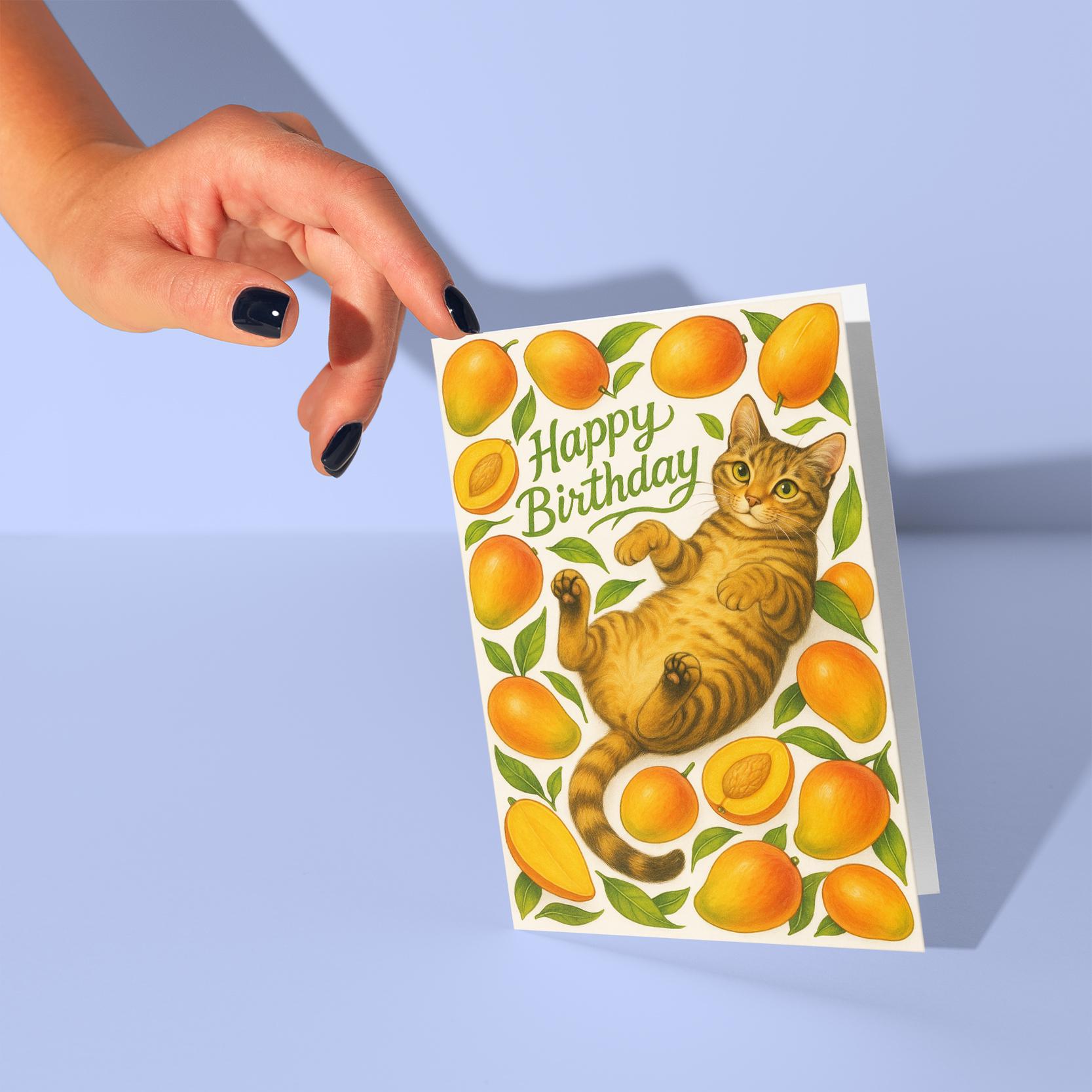 BLANK INTERIOR FOR A PERSONAL TOUCH: Our Fruity Friends Collection – Sweet Mango Tabby Cat - Happy Birthday! card and other whimsical designs feature a blank interior, giving you ample space to write a personal message from the heart. Perfect for any occasion, each card comes with a matching white envelope, making it easy to send your unique sentiments to loved ones.
