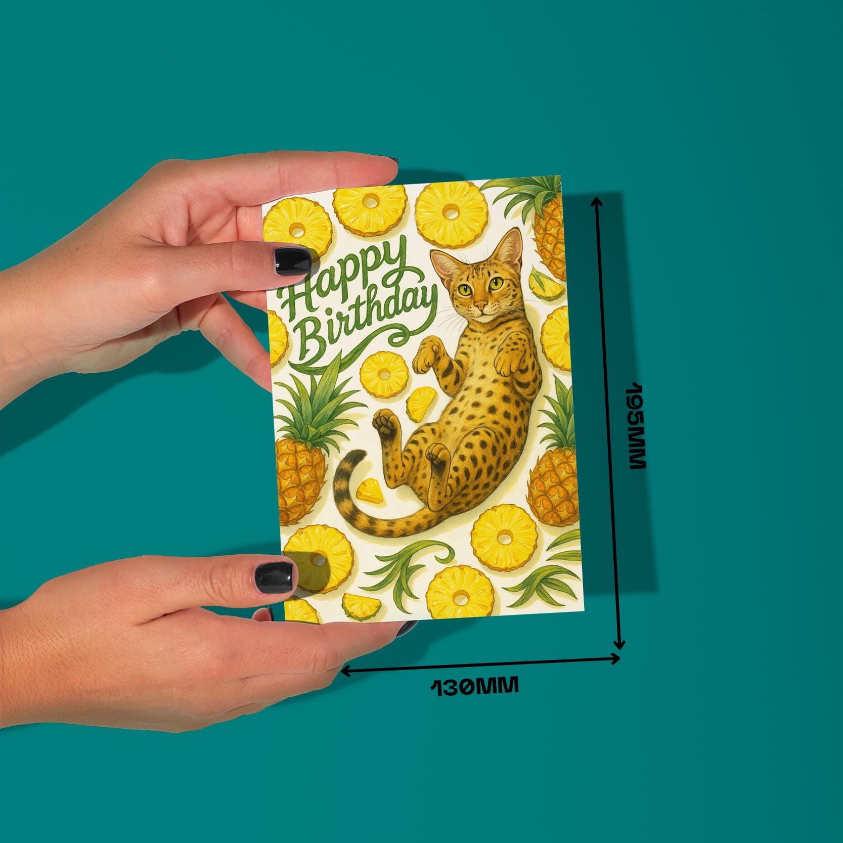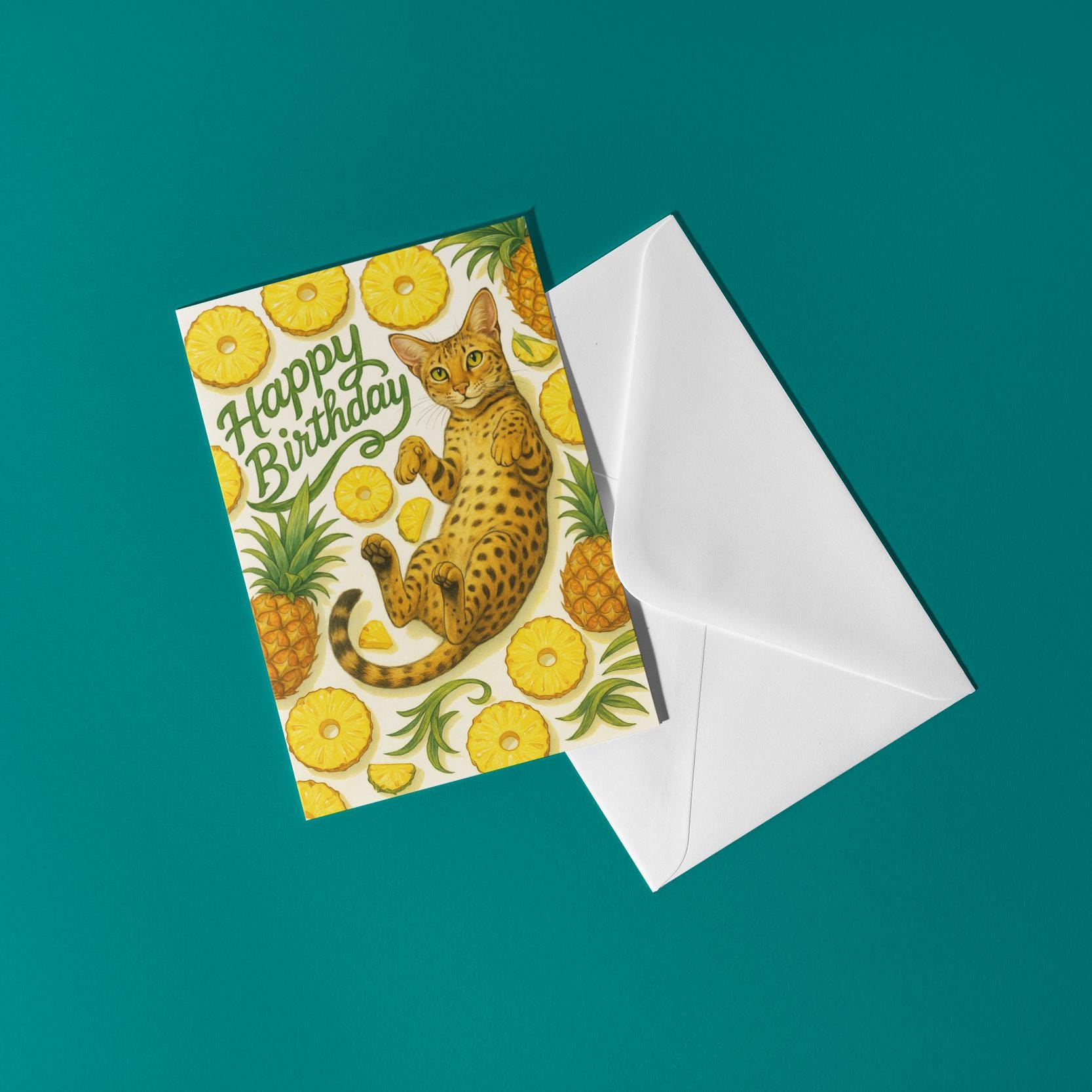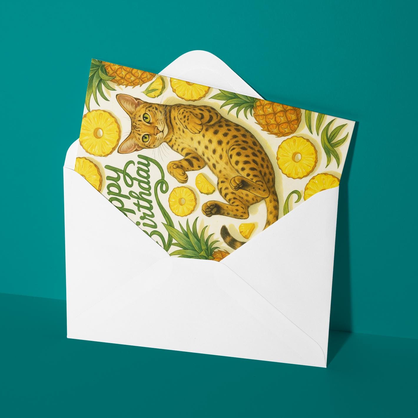 BLANK INTERIOR FOR A PERSONAL TOUCH: Our Fruity Friends Collection – Fine-apple Savannah Cat - Happy Birthday! card and other whimsical designs feature a blank interior, giving you ample space to write a personal message from the heart. Perfect for any occasion, each card comes with a matching white envelope, making it easy to send your unique sentiments to loved ones.