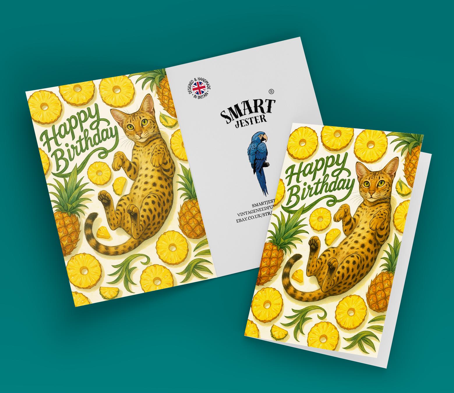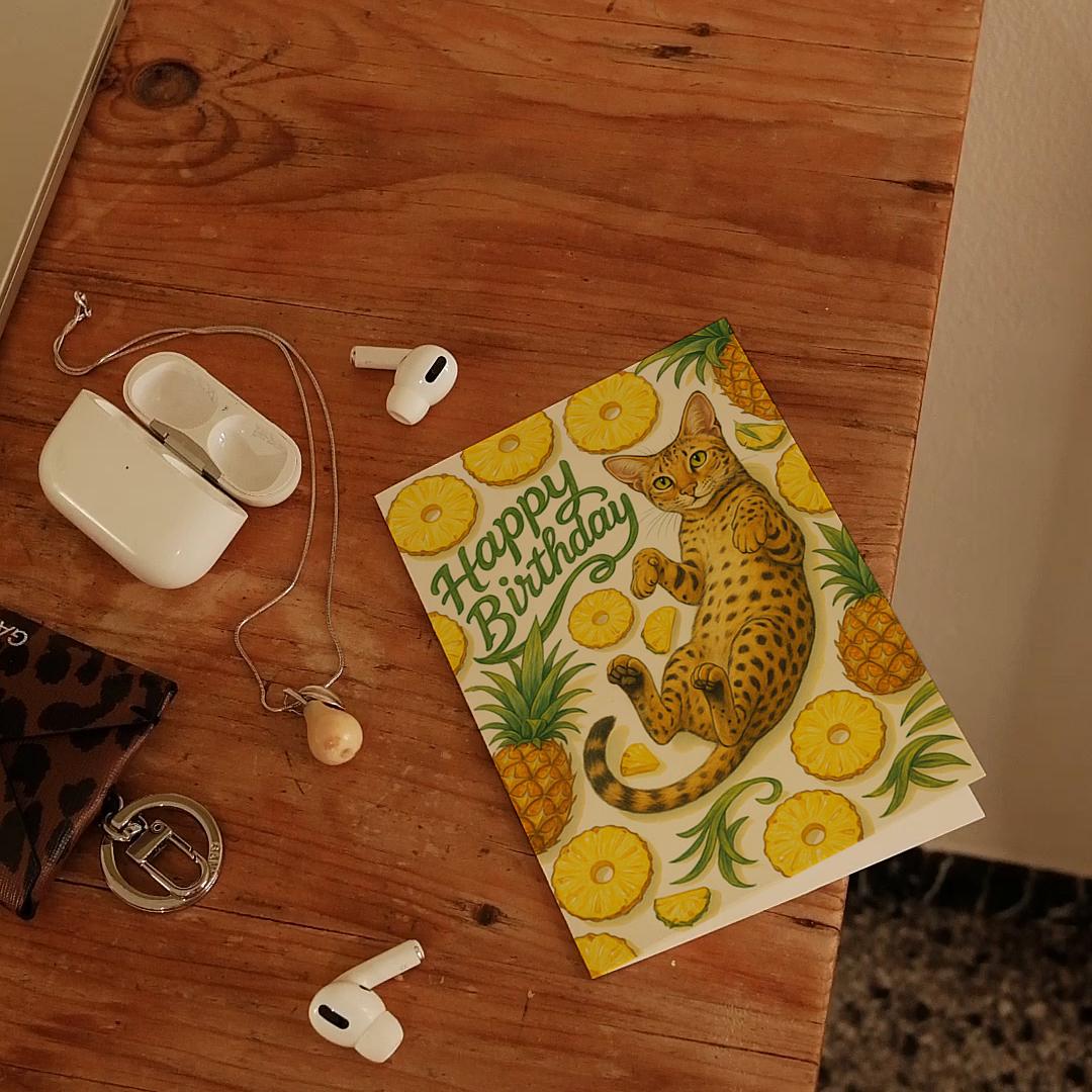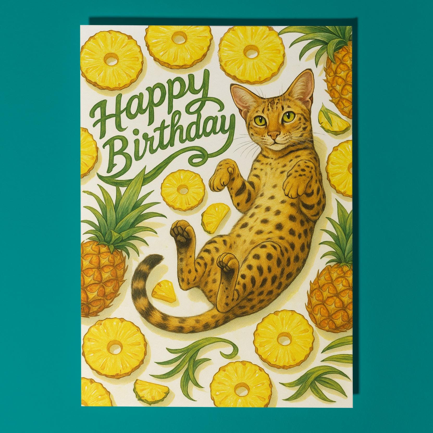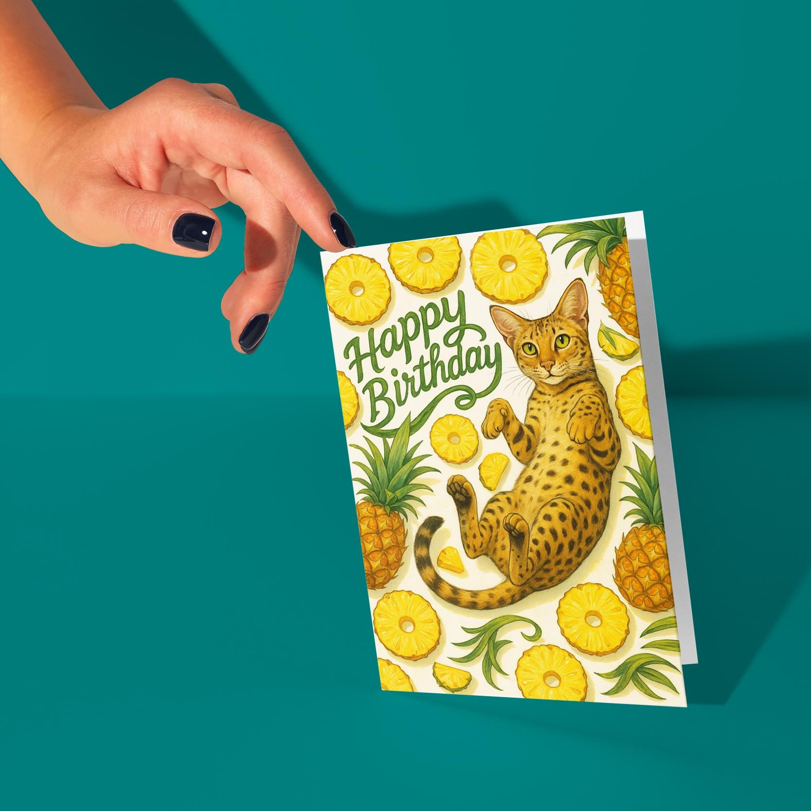 BLANK INTERIOR FOR A PERSONAL TOUCH: Our Fruity Friends Collection – Fine-apple Savannah Cat - Happy Birthday! card and other whimsical designs feature a blank interior, giving you ample space to write a personal message from the heart. Perfect for any occasion, each card comes with a matching white envelope, making it easy to send your unique sentiments to loved ones.