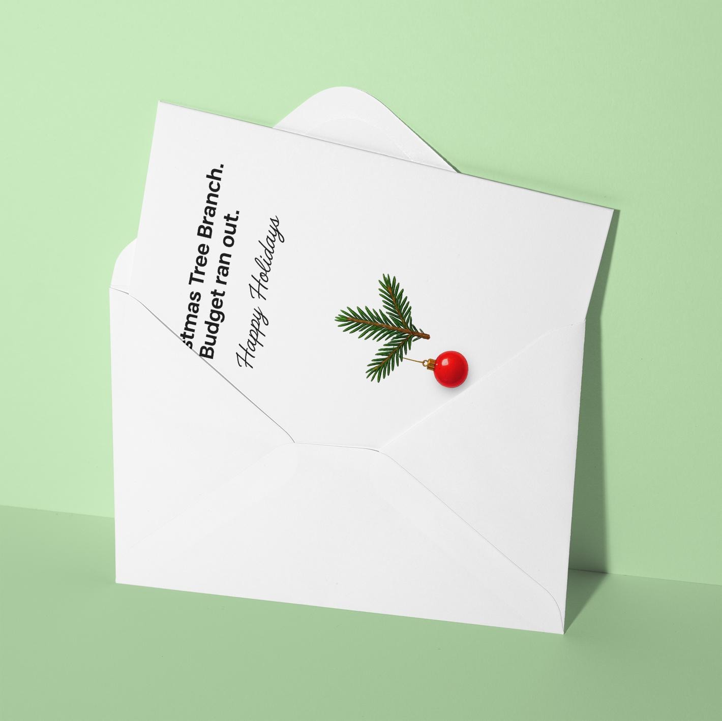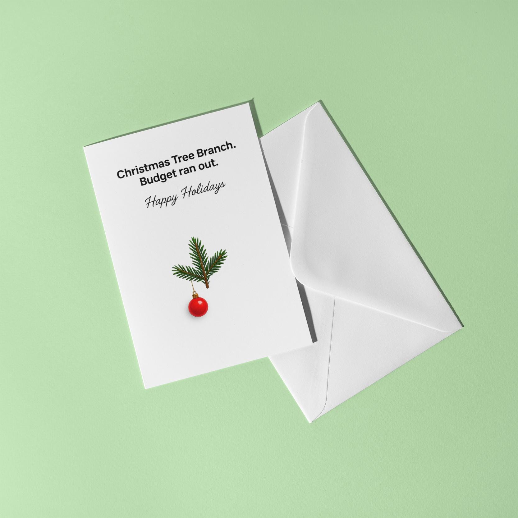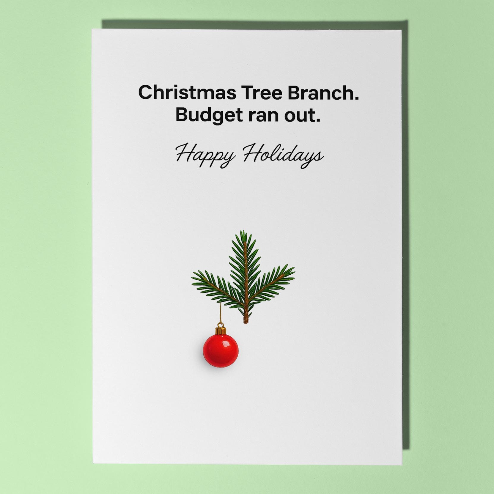 BLANK INTERIOR FOR A PERSONAL TOUCH: Budget Holiday Greetings - Christmas tree branch. Budget run out. Happy Holidays - Christmas Card and other whimsical designs feature a blank interior, giving you ample space to write a personal message from the heart. Perfect for any occasion, each card comes with a matching white envelope, making it easy to send your unique sentiments to loved ones.